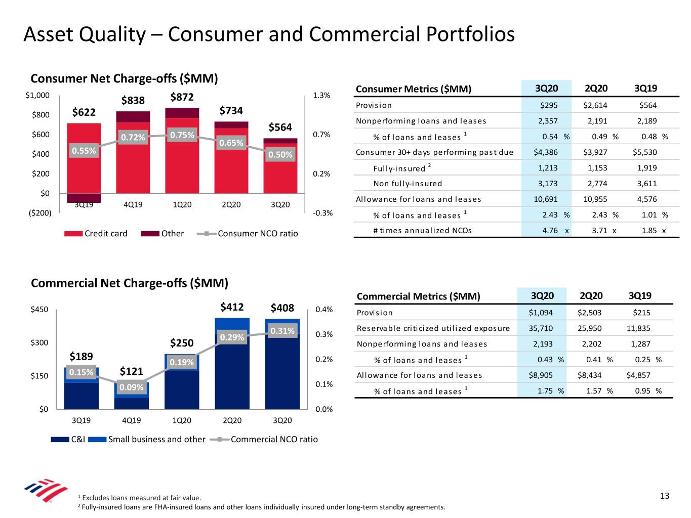 Asset Quality 1 Net Charge-offs ($MM) • Total net charge-offs of $972MM decreased $174MM from $1,200 $1,122 $1,146 1.0% 2Q20 $972 $959 — Consumer net charge-offs of $564MM decreased $811 $170MM aided by the benefits of deferrals and $800 government stimulus 0.5% 0.46% 0.45% 0.39% 0.40% — Commercial net charge-offs of $408MM were flat to 2Q20 $400 0.34% • Net charge-off ratio of 40 bps decreased 5 bps from 2Q20 $0 0.0% • Provision expense of $1.4B decreased $3.7B from 2Q20 driven 3Q19 4Q19 1Q20 2Q20 3Q20 by lower net reserve build Net charge-offs Net charge-off ratio — 3Q20 included a net reserve build of $0.4B 3Q19 included recoveries from the sale of previously charged-off non-core consumer real estate loans of $198MM; NCO ratio of 0.42% excluding these sales; impact of sales on . Commercial reserve build of $0.7B for COVID-19 other periods presented was immaterial impacted industries such as travel and entertainment Provision for Credit Losses ($MM) . Consumer reserve release of $0.3B driven by improved economic outlook and lower card balances $6,000 $5,117 $4,761 • Allowance for loan and lease losses of $19.6B represented 2.07% of total loans and leases 1 $4,000 • Nonperforming loans increased $0.2B from 2Q20 driven by consumer real estate due to expired deferrals $2,000 $1,389 — 35% of Consumer NPLs are contractually current $779 $941 • Commercial reservable criticized utilized exposure of $35.7B $0 increased $9.8B from 2Q20 3Q19 4Q19 1Q20 2Q20 3Q20 — Largest increases included hotels and airlines 1 Excludes loans measured at fair value. 12
