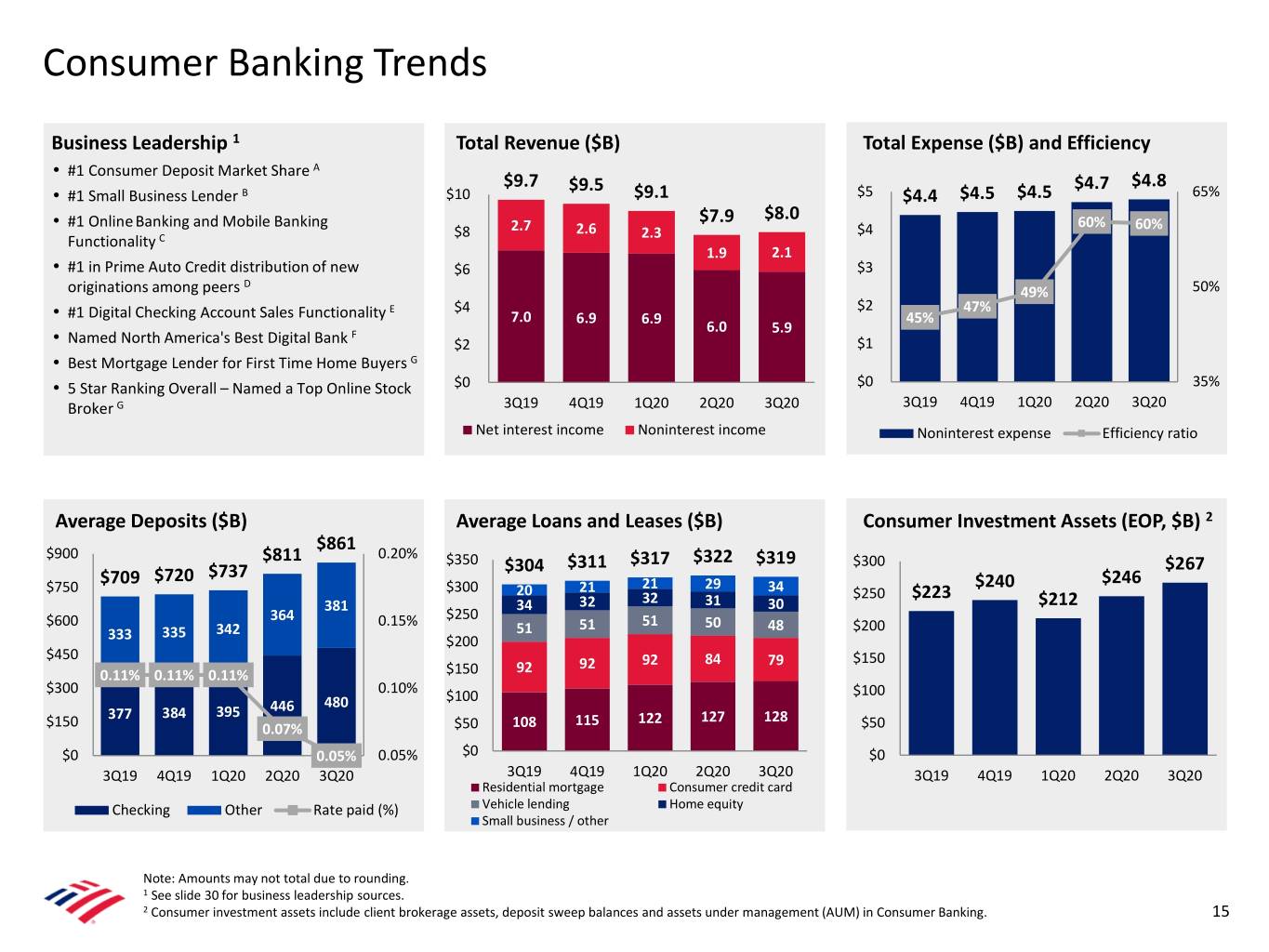 Consumer Banking Trends Business Leadership 1 Total Revenue ($B) Total Expense ($B) and Efficiency • #1 Consumer Deposit Market Share A $9.7 $9.5 $4.7 $4.8 • #1 Small Business Lender B $10 $9.1 $5 $4.4 $4.5 $4.5 65% • #1 Online Banking and Mobile Banking $7.9 $8.0 60% $8 2.7 2.6 $4 60% Functionality C 2.3 1.9 2.1 • #1 in Prime Auto Credit distribution of new $6 $3 D originations among peers 49% 50% E $4 $2 47% • #1 Digital Checking Account Sales Functionality 7.0 6.9 6.9 45% F 6.0 5.9 • Named North America's Best Digital Bank $2 $1 • Best Mortgage Lender for First Time Home Buyers G • 5 Star Ranking Overall – Named a Top Online Stock $0 $0 35% Broker G 3Q19 4Q19 1Q20 2Q20 3Q20 3Q19 4Q19 1Q20 2Q20 3Q20 Net interest income Noninterest income Noninterest expense Efficiency ratio Average Deposits ($B) Average Loans and Leases ($B) Consumer Investment Assets (EOP, $B) 2 $861 $900 $811 0.20% $350 $317 $322 $319 $300 $737 $304 $311 $267 $709 $720 21 29 $240 $246 $750 $300 20 21 34 $250 $223 34 32 32 31 30 $212 381 $250 $600 364 0.15% 51 50 335 342 51 51 48 $200 333 $200 $450 92 92 84 79 $150 0.11% 0.11% 0.11% $150 92 $300 0.10% $100 480 $100 384 395 446 $150 377 115 122 127 128 0.07% $50 108 $50 $0 0.05% 0.05% $0 $0 3Q19 4Q19 1Q20 2Q20 3Q20 3Q19 4Q19 1Q20 2Q20 3Q20 3Q19 4Q19 1Q20 2Q20 3Q20 Residential mortgage Consumer credit card Checking Other Rate paid (%) Vehicle lending Home equity Small business / other Note: Amounts may not total due to rounding. 1 See slide 30 for business leadership sources. 2 Consumer investment assets include client brokerage assets, deposit sweep balances and assets under management (AUM) in Consumer Banking. 15