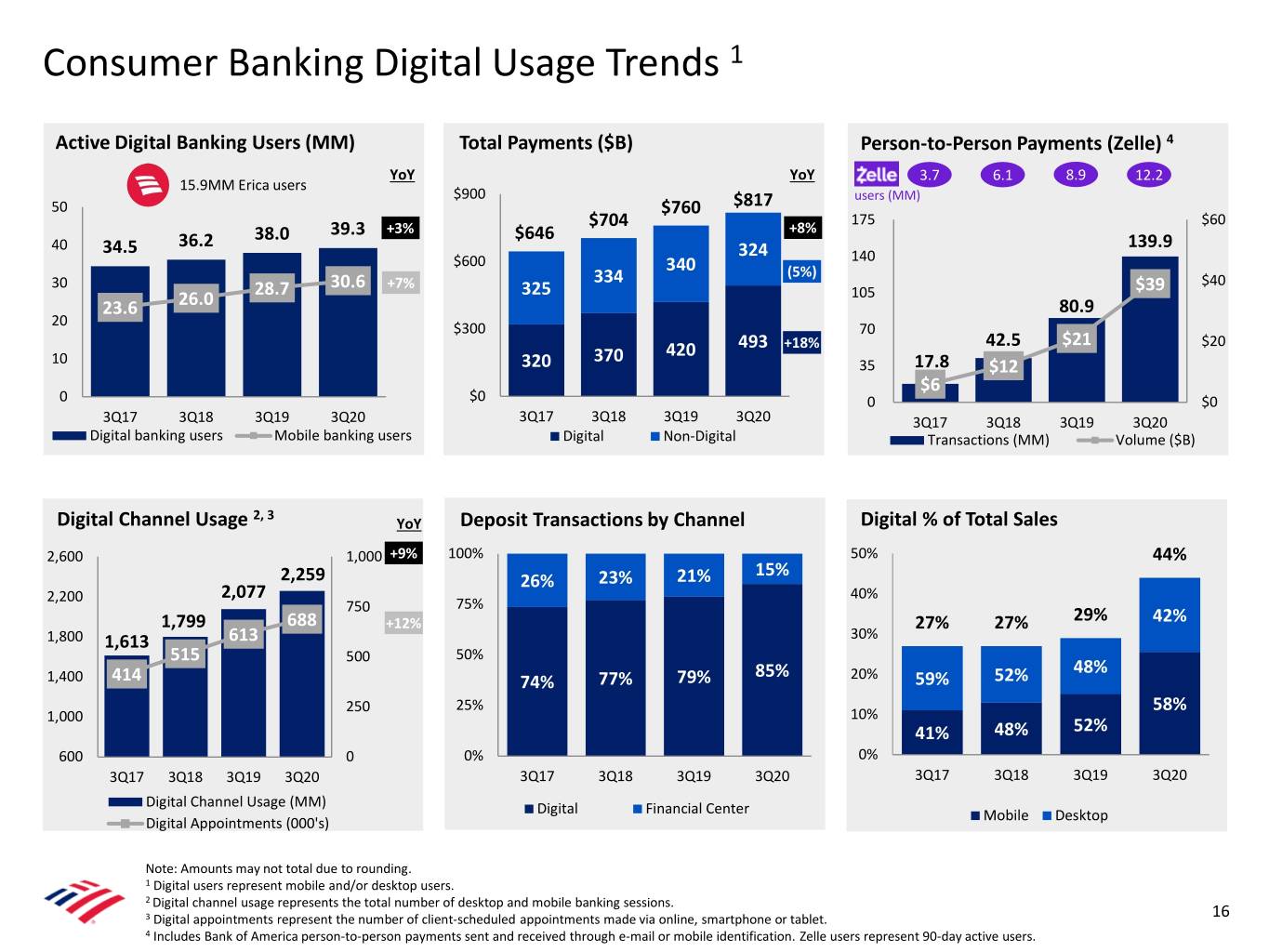1 Consumer Banking Digital Usage Trends (13% ) Active Digital Banking Users (MM) Total Payments ($B) Person-to-Person Payments (Zelle) 4 YoY YoY 3.7 6.1 8.9 12.2 15.9MM Erica users $900 users (MM) 50 $760 $817 $704 175 $60 38.0 39.3 +3% $646 +8% 40 34.5 36.2 324 139.9 $600 140 340 (5%) 30 30.6 +7% 334 $40 28.7 325 105 $39 23.6 26.0 80.9 20 $300 70 493 +18% 42.5 $21 $20 370 420 10 320 35 17.8 $12 $6 0 $0 0 $0 3Q17 3Q18 3Q19 3Q20 3Q17 3Q18 3Q19 3Q20 3Q17 3Q18 3Q19 3Q20 Digital banking users Mobile banking users Digital Non-Digital Transactions (MM) Volume ($B) 2, 3 Digital Channel Usage YoY Deposit Transactions by Channel Digital % of Total Sales 2,600 1,000 +9% 100% 50% 44% 15% 2,259 26% 23% 21% 2,200 2,077 40% 750 75% 1,799 688 +12% 27% 27% 29% 42% 1,800 1,613 613 30% 515 500 50% 85% 48% 1,400 414 74% 77% 79% 20% 59% 52% 250 25% 58% 1,000 10% 41% 48% 52% 600 0 0% 0% 3Q17 3Q18 3Q19 3Q20 3Q17 3Q18 3Q19 3Q20 3Q17 3Q18 3Q19 3Q20 Digital Channel Usage (MM) Digital Financial Center Mobile Desktop Digital Appointments (000's) Note: Amounts may not total due to rounding. 1 Digital users represent mobile and/or desktop users. 2 Digital channel usage represents the total number of desktop and mobile banking sessions. 3 Digital appointments represent the number of client-scheduled appointments made via online, smartphone or tablet. 16 4 Includes Bank of America person-to-person payments sent and received through e-mail or mobile identification. Zelle users represent 90-day active users.