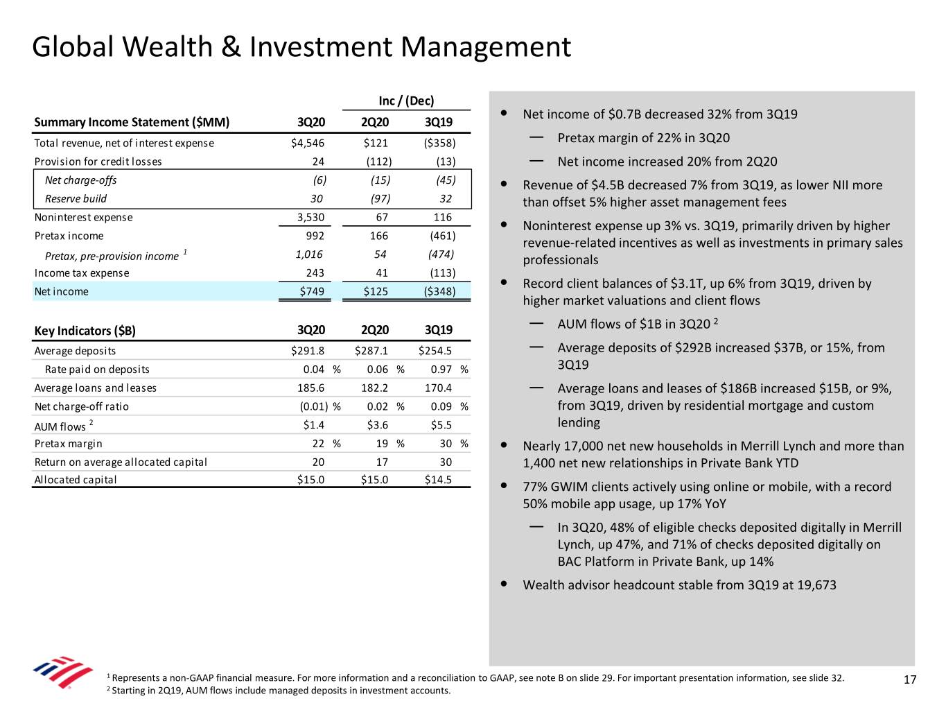 Global Wealth & Investment Management Inc / (Dec) Net income of $0.7B decreased 32% from 3Q19 Summary Income Statement ($MM) 3Q20 2Q20 3Q19 • Total revenue, net of interest expense $4,546 $121 ($358) — Pretax margin of 22% in 3Q20 Provision for credit losses 24 (112) (13) — Net income increased 20% from 2Q20 Net charge-offs (6) (15) (45) • Revenue of $4.5B decreased 7% from 3Q19, as lower NII more Reserve build 30 (97) 32 than offset 5% higher asset management fees Noninterest expense 3,530 67 116 • Noninterest expense up 3% vs. 3Q19, primarily driven by higher Pretax income 992 166 (461) revenue-related incentives as well as investments in primary sales 1 Pretax, pre-provision income 1,016 54 (474) professionals Income tax expense 243 41 (113) Record client balances of $3.1T, up 6% from 3Q19, driven by Net income $749 $125 ($348) • higher market valuations and client flows AUM flows of $1B in 3Q20 2 Key Indicators ($B) 3Q20 2Q20 3Q19 — Average deposits $291.8 $287.1 $254.5 — Average deposits of $292B increased $37B, or 15%, from Rate paid on deposits 0.04 % 0.06 % 0.97 % 3Q19 Average loans and leases 185.6 182.2 170.4 — Average loans and leases of $186B increased $15B, or 9%, Net charge-off ratio (0.01) % 0.02 % 0.09 % from 3Q19, driven by residential mortgage and custom AUM flows 2 $1.4 $3.6 $5.5 lending Pretax margin 22 % 19 % 30 % • Nearly 17,000 net new households in Merrill Lynch and more than Return on average allocated capital 20 17 30 1,400 net new relationships in Private Bank YTD Allocated capital $15.0 $15.0 $14.5 • 77% GWIM clients actively using online or mobile, with a record 50% mobile app usage, up 17% YoY — In 3Q20, 48% of eligible checks deposited digitally in Merrill Lynch, up 47%, and 71% of checks deposited digitally on BAC Platform in Private Bank, up 14% • Wealth advisor headcount stable from 3Q19 at 19,673 1 Represents a non-GAAP financial measure. For more information and a reconciliation to GAAP, see note B on slide 29. For important presentation information, see slide 32. 17 2 Starting in 2Q19, AUM flows include managed deposits in investment accounts.
