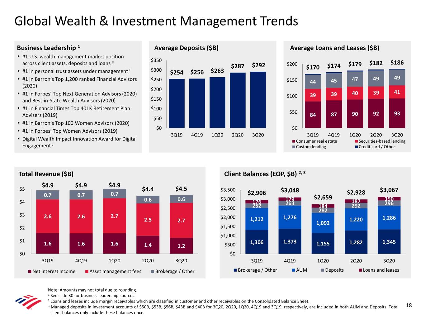 Global Wealth & Investment Management Trends Business Leadership 1 Average Deposits ($B) Average Loans and Leases ($B) • #1 U.S. wealth management market position $350 across client assets, deposits and loans H $200 $182 $186 $287 $292 $170 $174 $179 • #1 in personal trust assets under management I $300 $254 $256 $263 • #1 in Barron’s Top 1,200 ranked Financial Advisors 49 49 $250 $150 44 45 47 (2020) $200 39 41 • #1 in Forbes’ Top Next Generation Advisors (2020) $100 39 39 40 and Best-in-State Wealth Advisors (2020) $150 • #1 in Financial Times Top 401K Retirement Plan $100 $50 Advisers (2019) 84 87 90 92 93 $50 • #1 in Barron’s Top 100 Women Advisors (2020) $0 $0 • #1 in Forbes’ Top Women Advisors (2019) 3Q19 4Q19 1Q20 2Q20 3Q20 3Q19 4Q19 1Q20 2Q20 3Q20 • Digital Wealth Impact Innovation Award for Digital Consumer real estate Securities-based lending Engagement J Custom lending Credit card / Other Total Revenue ($B) Client Balances (EOP, $B) 2, 3 $4.9 $4.9 $4.9 $5 $4.4 $4.5 $3,500 $3,048 $3,067 0.7 0.7 0.7 $2,906 $2,928 $3,000 $2,659 190 $4 0.6 0.6 176 179 187 252 263 184 292 296 $2,500 282 $3 2.6 2.6 2.7 2.5 $2,000 1,212 1,276 1,220 1,286 2.7 1,092 $2 $1,500 $1,000 $1 1,306 1,373 1,282 1,345 1.6 1.6 1.6 1.4 1.2 $500 1,155 $0 $0 3Q19 4Q19 1Q20 2Q20 3Q20 3Q19 4Q19 1Q20 2Q20 3Q20 Net interest income Asset management fees Brokerage / Other Brokerage / Other AUM Deposits Loans and leases Note: Amounts may not total due to rounding. 1 See slide 30 for business leadership sources. 2 Loans and leases include margin receivables which are classified in customer and other receivables on the Consolidated Balance Sheet. 3 Managed deposits in investment accounts of $50B, $53B, $56B, $43B and $40B for 3Q20, 2Q20, 1Q20, 4Q19 and 3Q19, respectively, are included in both AUM and Deposits. Total 18 client balances only include these balances once.