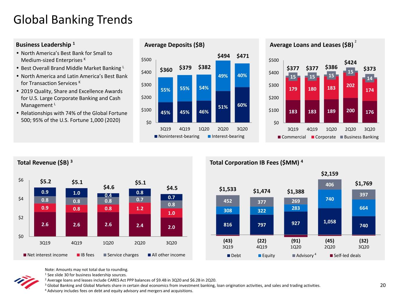 Global Banking Trends 2 Business Leadership 1 Average Deposits ($B) Average Loans and Leases ($B) North America’s Best Bank for Small to • $494 $471 K $500 Medium-sized Enterprises $500 $424 • Best Overall Brand Middle Market Banking L $379 $382 $377 $377 $386 $373 $400 $360 $400 15 40% 15 • North America and Latin America’s Best Bank 49% 15 15 14 K for Transaction Services $300 $300 54% 183 202 • 2019 Quality, Share and Excellence Awards 55% 55% 179 180 174 for U.S. Large Corporate Banking and Cash $200 $200 L Management 51% 60% $100 $100 • Relationships with 74% of the Global Fortune 45% 45% 46% 183 183 189 200 176 500; 95% of the U.S. Fortune 1,000 (2020) $0 $0 3Q19 4Q19 1Q20 2Q20 3Q20 3Q19 4Q19 1Q20 2Q20 3Q20 Noninterest-bearing Interest-bearing Commercial Corporate Business Banking Total Revenue ($B) 3 Total Corporation IB Fees ($MM) 4 $2,159 $6 $5.2 $5.1 $5.1 406 $1,769 $4.6 $4.5 $1,533 0.9 0.8 $1,474 $1,388 1.0 0.4 397 $4 0.7 0.8 0.8 0.8 0.7 452 269 740 0.8 377 0.9 0.8 0.8 1.2 283 664 1.0 308 322 $2 1,058 2.6 927 2.6 2.6 2.4 2.0 816 797 740 $0 3Q19 4Q19 1Q20 2Q20 3Q20 (43) (22) (91) (45) (32) 3Q19 4Q19 1Q20 2Q20 3Q20 Net interest income IB fees Service charges All other income Debt Equity Advisory 4 Self-led deals Note: Amounts may not total due to rounding. 1 See slide 30 for business leadership sources. 2 Average loans and leases include CARES Act PPP balances of $9.4B in 3Q20 and $6.2B in 2Q20. 3 Global Banking and Global Markets share in certain deal economics from investment banking, loan origination activities, and sales and trading activities. 20 4 Advisory includes fees on debt and equity advisory and mergers and acquisitions.