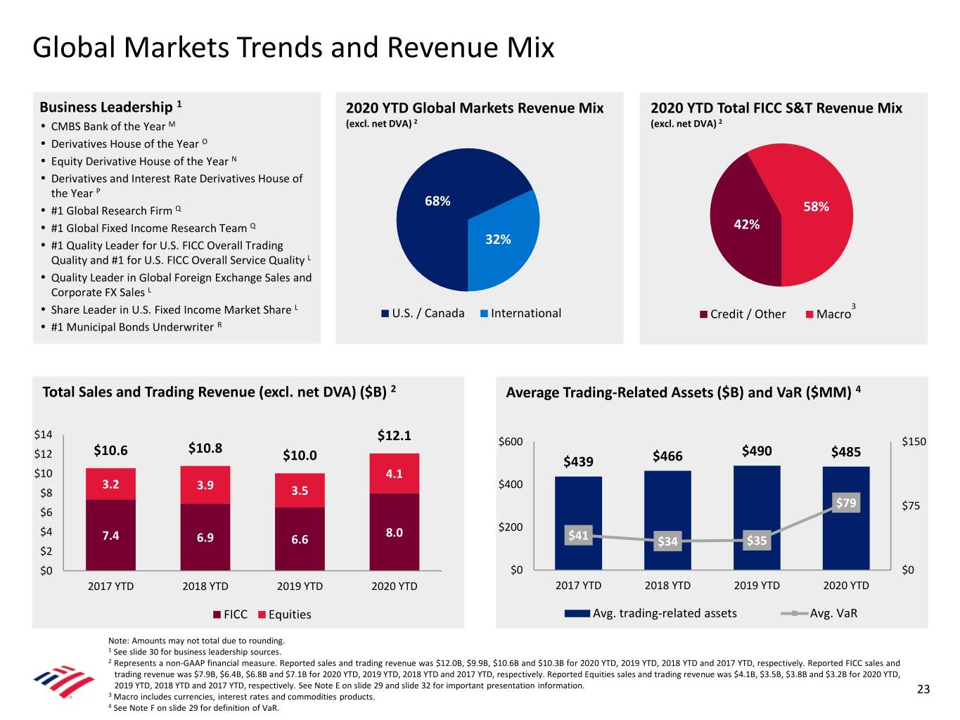 Global Markets Trends and Revenue Mix Business Leadership 1 2020 YTD Global Markets Revenue Mix 2020 YTD Total FICC S&T Revenue Mix • CMBS Bank of the Year M (excl. net DVA) 2 (excl. net DVA) 2 • Derivatives House of the Year O • Equity Derivative House of the Year N • Derivatives and Interest Rate Derivatives House of the Year P 68% • #1 Global Research Firm Q 58% • #1 Global Fixed Income Research Team Q 42% • #1 Quality Leader for U.S. FICC Overall Trading 32% Quality and #1 for U.S. FICC Overall Service Quality L • Quality Leader in Global Foreign Exchange Sales and Corporate FX Sales L L 3 • Share Leader in U.S. Fixed Income Market Share U.S. / Canada International Credit / Other Macro • #1 Municipal Bonds Underwriter R Total Sales and Trading Revenue (excl. net DVA) ($B) 2 Average Trading-Related Assets ($B) and VaR ($MM) 4 $14 $12.1 $600 $150 $12 $10.6 $10.8 $490 $485 $10.0 $439 $466 $10 4.1 3.2 3.9 $400 $8 3.5 $79 $75 $6 $4 8.0 $200 7.4 6.9 6.6 $41 $34 $35 $2 $0 $0 $0 2017 YTD 2018 YTD 2019 YTD 2020 YTD 2017 YTD 2018 YTD 2019 YTD 2020 YTD FICC Equities Avg. trading-related assets Avg. VaR Note: Amounts may not total due to rounding. 1 See slide 30 for business leadership sources. 2 Represents a non-GAAP financial measure. Reported sales and trading revenue was $12.0B, $9.9B, $10.6B and $10.3B for 2020 YTD, 2019 YTD, 2018 YTD and 2017 YTD, respectively. Reported FICC sales and trading revenue was $7.9B, $6.4B, $6.8B and $7.1B for 2020 YTD, 2019 YTD, 2018 YTD and 2017 YTD, respectively. Reported Equities sales and trading revenue was $4.1B, $3.5B, $3.8B and $3.2B for 2020 YTD, 2019 YTD, 2018 YTD and 2017 YTD, respectively. See Note E on slide 29 and slide 32 for important presentation information. 23 3 Macro includes currencies, interest rates and commodities products. 4 See Note F on slide 29 for definition of VaR.