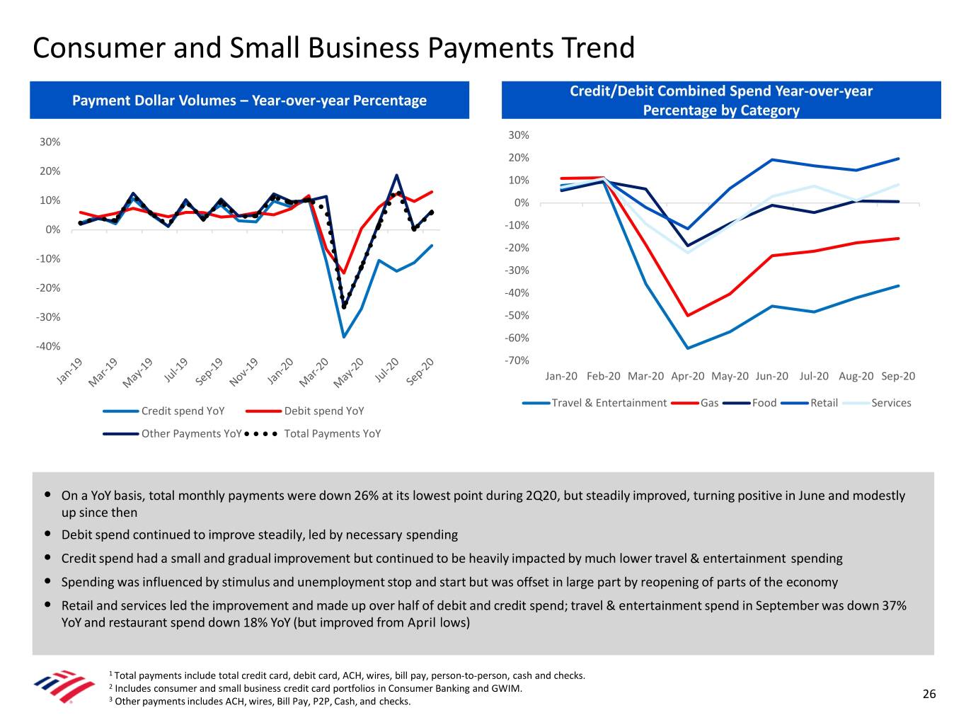 Consumer and Small Business Payments Trend Credit/Debit Combined Spend Year-over-year Payment Dollar Volumes – Year-over-year Percentage Percentage by Category 30% 30% 20% 20% 10% 10% 0% 0% -10% -20% -10% -30% -20% -40% -30% -50% -60% -40% -70% Jan-20 Feb-20 Mar-20 Apr-20 May-20 Jun-20 Jul-20 Aug-20 Sep-20 Travel & Entertainment Gas Food Retail Services Credit spend YoY Debit spend YoY Other Payments YoY Total Payments YoY • On a YoY basis, total monthly payments were down 26% at its lowest point during 2Q20, but steadily improved, turning positive in June and modestly up since then • Debit spend continued to improve steadily, led by necessary spending • Credit spend had a small and gradual improvement but continued to be heavily impacted by much lower travel & entertainment spending • Spending was influenced by stimulus and unemployment stop and start but was offset in large part by reopening of parts of the economy • Retail and services led the improvement and made up over half of debit and credit spend; travel & entertainment spend in September was down 37% YoY and restaurant spend down 18% YoY (but improved from April lows) 1 Total payments include total credit card, debit card, ACH, wires, bill pay, person-to-person, cash and checks. 2 Includes consumer and small business credit card portfolios in Consumer Banking and GWIM. 26 3 Other payments includes ACH, wires, Bill Pay, P2P, Cash, and checks.