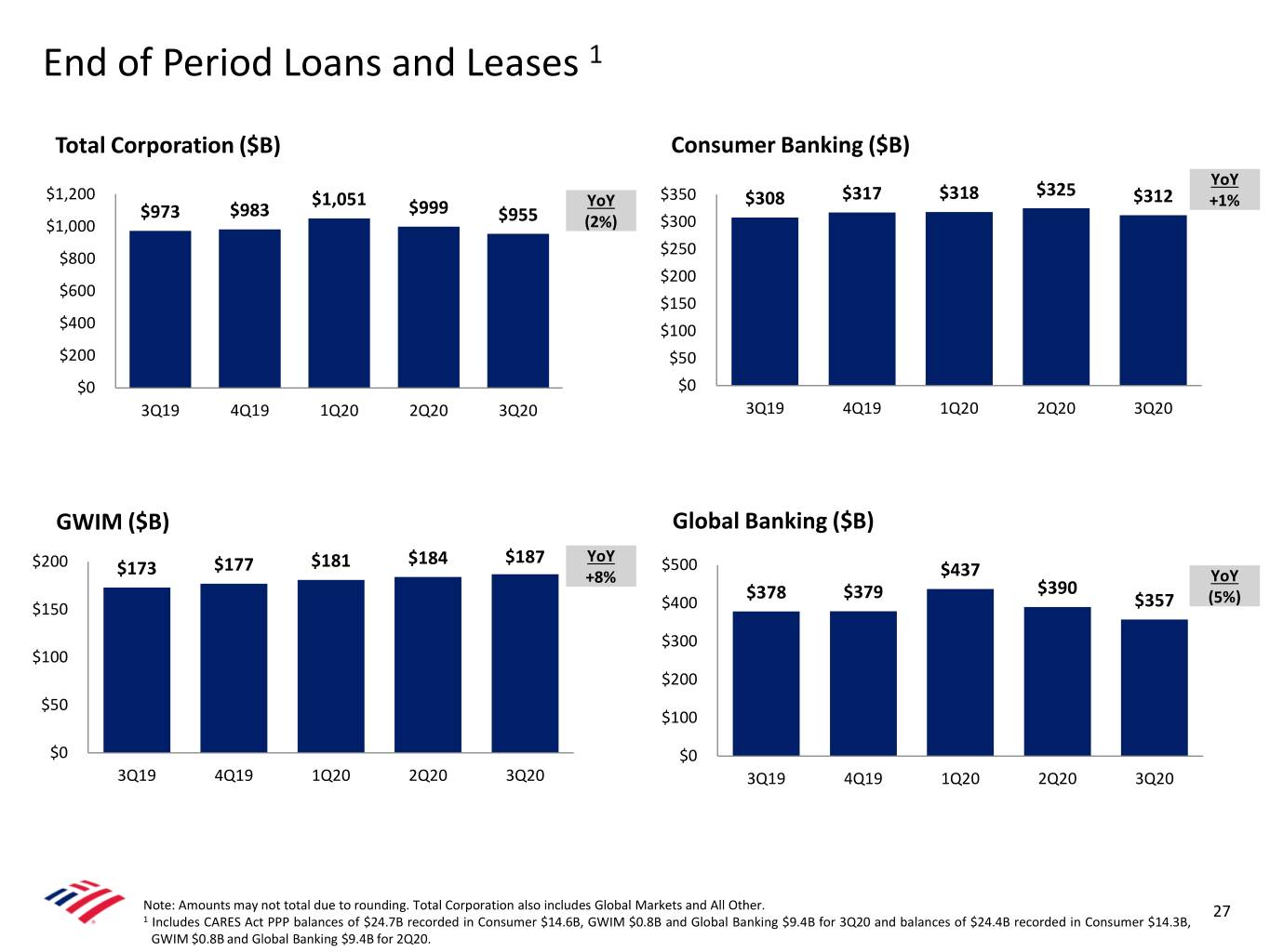 End of Period Loans and Leases 1 Total Corporation ($B) Consumer Banking ($B) YoY $325 $1,200 $1,051 YoY $350 $308 $317 $318 $312 +1% $973 $983 $999 $955 $1,000 (2%) $300 $250 $800 $200 $600 $150 $400 $100 $200 $50 $0 $0 3Q19 4Q19 1Q20 2Q20 3Q20 3Q19 4Q19 1Q20 2Q20 3Q20 GWIM ($B) Global Banking ($B) $200 $177 $181 $184 $187 YoY $500 $173 +8% $437 YoY $378 $379 $390 (5%) $150 $400 $357 $300 $100 $200 $50 $100 $0 $0 3Q19 4Q19 1Q20 2Q20 3Q20 3Q19 4Q19 1Q20 2Q20 3Q20 Note: Amounts may not total due to rounding. Total Corporation also includes Global Markets and All Other. 27 1 Includes CARES Act PPP balances of $24.7B recorded in Consumer $14.6B, GWIM $0.8B and Global Banking $9.4B for 3Q20 and balances of $24.4B recorded in Consumer $14.3B, GWIM $0.8B and Global Banking $9.4B for 2Q20.
