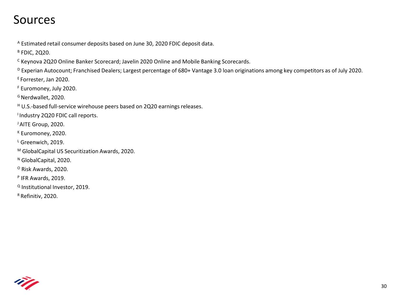 Sources A Estimated retail consumer deposits based on June 30, 2020 FDIC deposit data. B FDIC, 2Q20. C Keynova 2Q20 Online Banker Scorecard; Javelin 2020 Online and Mobile Banking Scorecards. D Experian Autocount; Franchised Dealers; Largest percentage of 680+ Vantage 3.0 loan originations among key competitors as of July 2020. E Forrester, Jan 2020. F Euromoney, July 2020. G Nerdwallet, 2020. H U.S.-based full-service wirehouse peers based on 2Q20 earnings releases. I Industry 2Q20 FDIC call reports. J AITE Group, 2020. K Euromoney, 2020. L Greenwich, 2019. M GlobalCapital US Securitization Awards, 2020. N GlobalCapital, 2020. O Risk Awards, 2020. P IFR Awards, 2019. Q Institutional Investor, 2019. R Refinitiv, 2020. 30