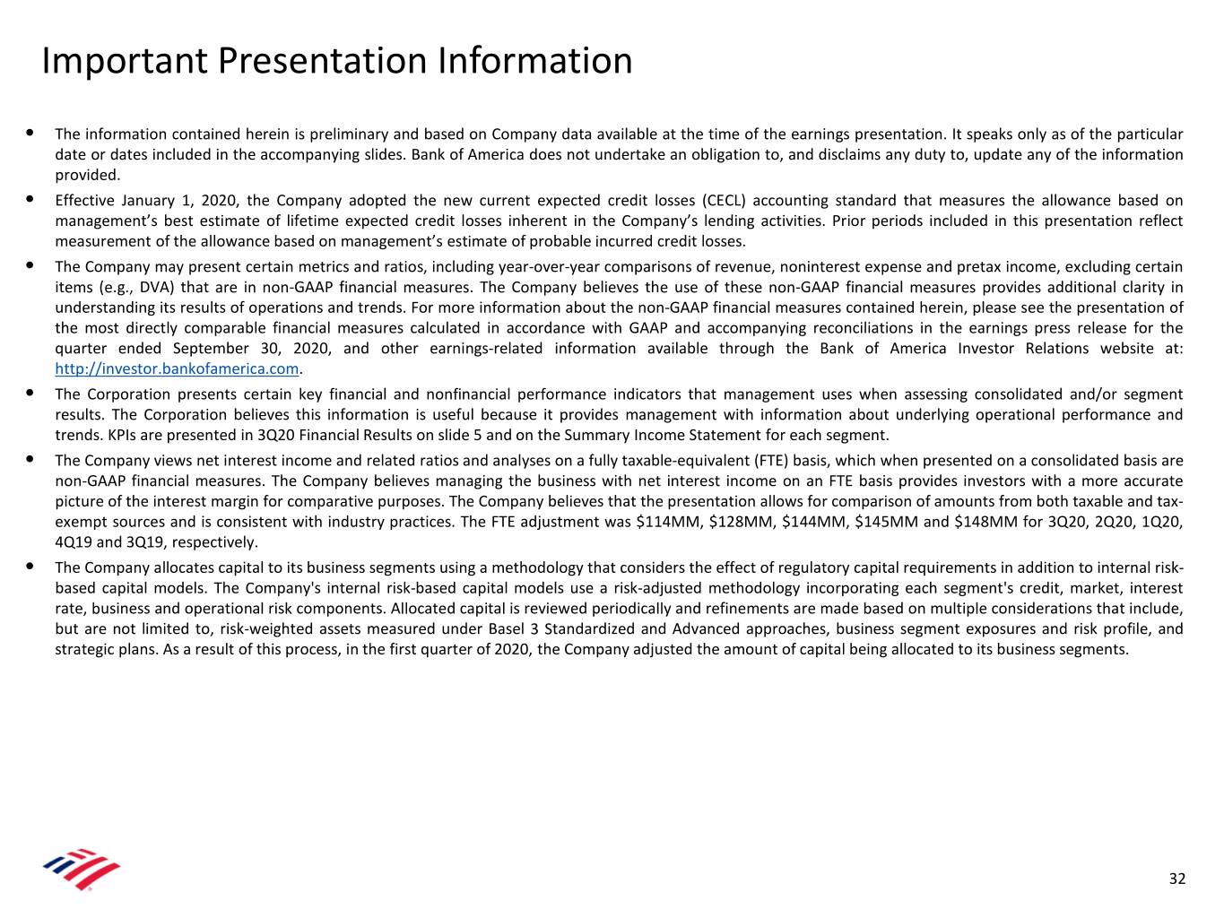 Important Presentation Information • The information contained herein is preliminary and based on Company data available at the time of the earnings presentation. It speaks only as of the particular date or dates included in the accompanying slides. Bank of America does not undertake an obligation to, and disclaims any duty to, update any of the information provided. • Effective January 1, 2020, the Company adopted the new current expected credit losses (CECL) accounting standard that measures the allowance based on management’s best estimate of lifetime expected credit losses inherent in the Company’s lending activities. Prior periods included in this presentation reflect measurement of the allowance based on management’s estimate of probable incurred credit losses. • The Company may present certain metrics and ratios, including year-over-year comparisons of revenue, noninterest expense and pretax income, excluding certain items (e.g., DVA) that are in non-GAAP financial measures. The Company believes the use of these non-GAAP financial measures provides additional clarity in understanding its results of operations and trends. For more information about the non-GAAP financial measures contained herein, please see the presentation of the most directly comparable financial measures calculated in accordance with GAAP and accompanying reconciliations in the earnings press release for the quarter ended September 30, 2020, and other earnings-related information available through the Bank of America Investor Relations website at: http://investor.bankofamerica.com. • The Corporation presents certain key financial and nonfinancial performance indicators that management uses when assessing consolidated and/or segment results. The Corporation believes this information is useful because it provides management with information about underlying operational performance and trends. KPIs are presented in 3Q20 Financial Results on slide 5 and on the Summary Income Statement for each segment. • The Company views net interest income and related ratios and analyses on a fully taxable-equivalent (FTE) basis, which when presented on a consolidated basis are non-GAAP financial measures. The Company believes managing the business with net interest income on an FTE basis provides investors with a more accurate picture of the interest margin for comparative purposes. The Company believes that the presentation allows for comparison of amounts from both taxable and tax- exempt sources and is consistent with industry practices. The FTE adjustment was $114MM, $128MM, $144MM, $145MM and $148MM for 3Q20, 2Q20, 1Q20, 4Q19 and 3Q19, respectively. • The Company allocates capital to its business segments using a methodology that considers the effect of regulatory capital requirements in addition to internal risk- based capital models. The Company's internal risk-based capital models use a risk-adjusted methodology incorporating each segment's credit, market, interest rate, business and operational risk components. Allocated capital is reviewed periodically and refinements are made based on multiple considerations that include, but are not limited to, risk-weighted assets measured under Basel 3 Standardized and Advanced approaches, business segment exposures and risk profile, and strategic plans. As a result of this process, in the first quarter of 2020, the Company adjusted the amount of capital being allocated to its business segments. 32