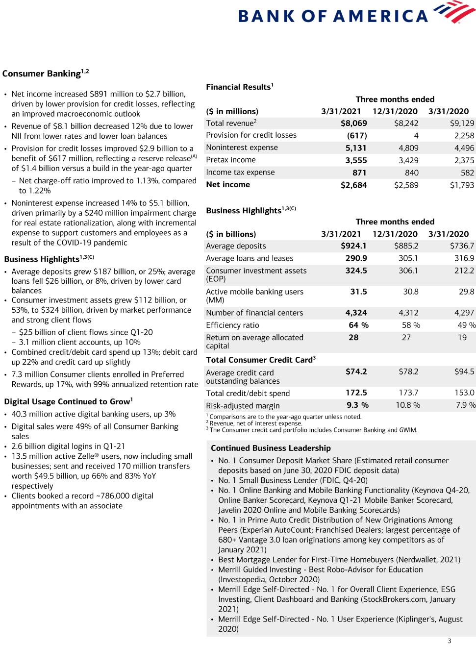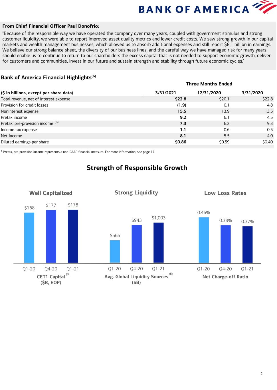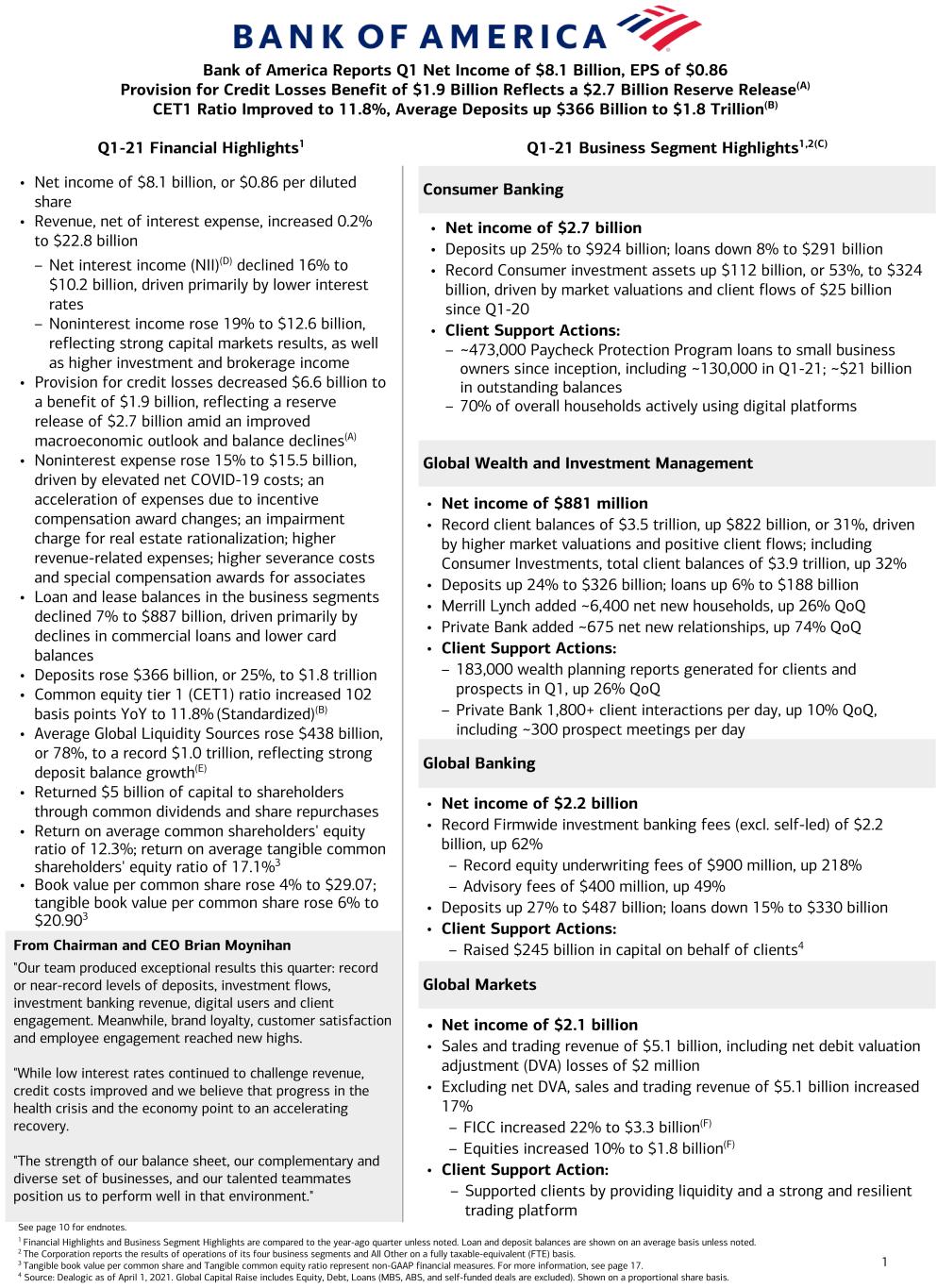 1 Q1-21 Financial Highlights1 Q1-21 Business Segment Highlights1,2(C) Consumer Banking Global Wealth and Investment Management Global Banking Global Markets Bank of America Reports Q1 Net Income of $8.1 Billion, EPS of $0.86 Provision for Credit Losses Benefit of $1.9 Billion Reflects a $2.7 Billion Reserve Release(A) CET1 Ratio Improved to 11.8%, Average Deposits up $366 Billion to $1.8 Trillion(B) See page 10 for endnotes. 1 Financial Highlights and Business Segment Highlights are compared to the year-ago quarter unless noted. Loan and deposit balances are shown on an average basis unless noted. 2 The Corporation reports the results of operations of its four business segments and All Other on a fully taxable-equivalent (FTE) basis. 3 Tangible book value per common share and Tangible common equity ratio represent non-GAAP financial measures. For more information, see page 17. 4 Source: Dealogic as of April 1, 2021. Global Capital Raise includes Equity, Debt, Loans (MBS, ABS, and self-funded deals are excluded). Shown on a proportional share basis. • Net income of $2.7 billion • Deposits up 25% to $924 billion; loans down 8% to $291 billion • Record Consumer investment assets up $112 billion, or 53%, to $324 billion, driven by market valuations and client flows of $25 billion since Q1-20 • Client Support Actions: – ~473,000 Paycheck Protection Program loans to small business owners since inception, including ~130,000 in Q1-21; ~$21 billion in outstanding balances – 70% of overall households actively using digital platforms • Net income of $8.1 billion, or $0.86 per diluted share • Revenue, net of interest expense, increased 0.2% to $22.8 billion – Net interest income (NII)(D) declined 16% to $10.2 billion, driven primarily by lower interest rates – Noninterest income rose 19% to $12.6 billion, reflecting strong capital markets results, as well as higher investment and brokerage income • Provision for credit losses decreased $6.6 billion to a benefit of $1.9 billion, reflecting a reserve release of $2.7 billion amid an improved macroeconomic outlook and balance declines(A) • Noninterest expense rose 15% to $15.5 billion, driven by elevated net COVID-19 costs; an acceleration of expenses due to incentive compensation award changes; an impairment charge for real estate rationalization; higher revenue-related expenses; higher severance costs and special compensation awards for associates • Loan and lease balances in the business segments declined 7% to $887 billion, driven primarily by declines in commercial loans and lower card balances • Deposits rose $366 billion, or 25%, to $1.8 trillion • Common equity tier 1 (CET1) ratio increased 102 basis points YoY to 11.8% (Standardized)(B) • Average Global Liquidity Sources rose $438 billion, or 78%, to a record $1.0 trillion, reflecting strong deposit balance growth(E) • Returned $5 billion of capital to shareholders through common dividends and share repurchases • Return on average common shareholders' equity ratio of 12.3%; return on average tangible common shareholders' equity ratio of 17.1%3 • Book value per common share rose 4% to $29.07; tangible book value per common share rose 6% to $20.903 • Net income of $2.1 billion • Sales and trading revenue of $5.1 billion, including net debit valuation adjustment (DVA) losses of $2 million • Excluding net DVA, sales and trading revenue of $5.1 billion increased 17% – FICC increased 22% to $3.3 billion(F) – Equities increased 10% to $1.8 billion(F) • Client Support Action: – Supported clients by providing liquidity and a strong and resilient trading platform From Chairman and CEO Brian Moynihan "Our team produced exceptional results this quarter: record or near-record levels of deposits, investment flows, investment banking revenue, digital users and client engagement. Meanwhile, brand loyalty, customer satisfaction and employee engagement reached new highs. "While low interest rates continued to challenge revenue, credit costs improved and we believe that progress in the health crisis and the economy point to an accelerating recovery. "The strength of our balance sheet, our complementary and diverse set of businesses, and our talented teammates position us to perform well in that environment." • Net income of $881 million • Record client balances of $3.5 trillion, up $822 billion, or 31%, driven by higher market valuations and positive client flows; including Consumer Investments, total client balances of $3.9 trillion, up 32% • Deposits up 24% to $326 billion; loans up 6% to $188 billion • Merrill Lynch added ~6,400 net new households, up 26% QoQ • Private Bank added ~675 net new relationships, up 74% QoQ • Client Support Actions: – 183,000 wealth planning reports generated for clients and prospects in Q1, up 26% QoQ – Private Bank 1,800+ client interactions per day, up 10% QoQ, including ~300 prospect meetings per day • Net income of $2.2 billion • Record Firmwide investment banking fees (excl. self-led) of $2.2 billion, up 62% – Record equity underwriting fees of $900 million, up 218% – Advisory fees of $400 million, up 49% • Deposits up 27% to $487 billion; loans down 15% to $330 billion • Client Support Actions: – Raised $245 billion in capital on behalf of clients4