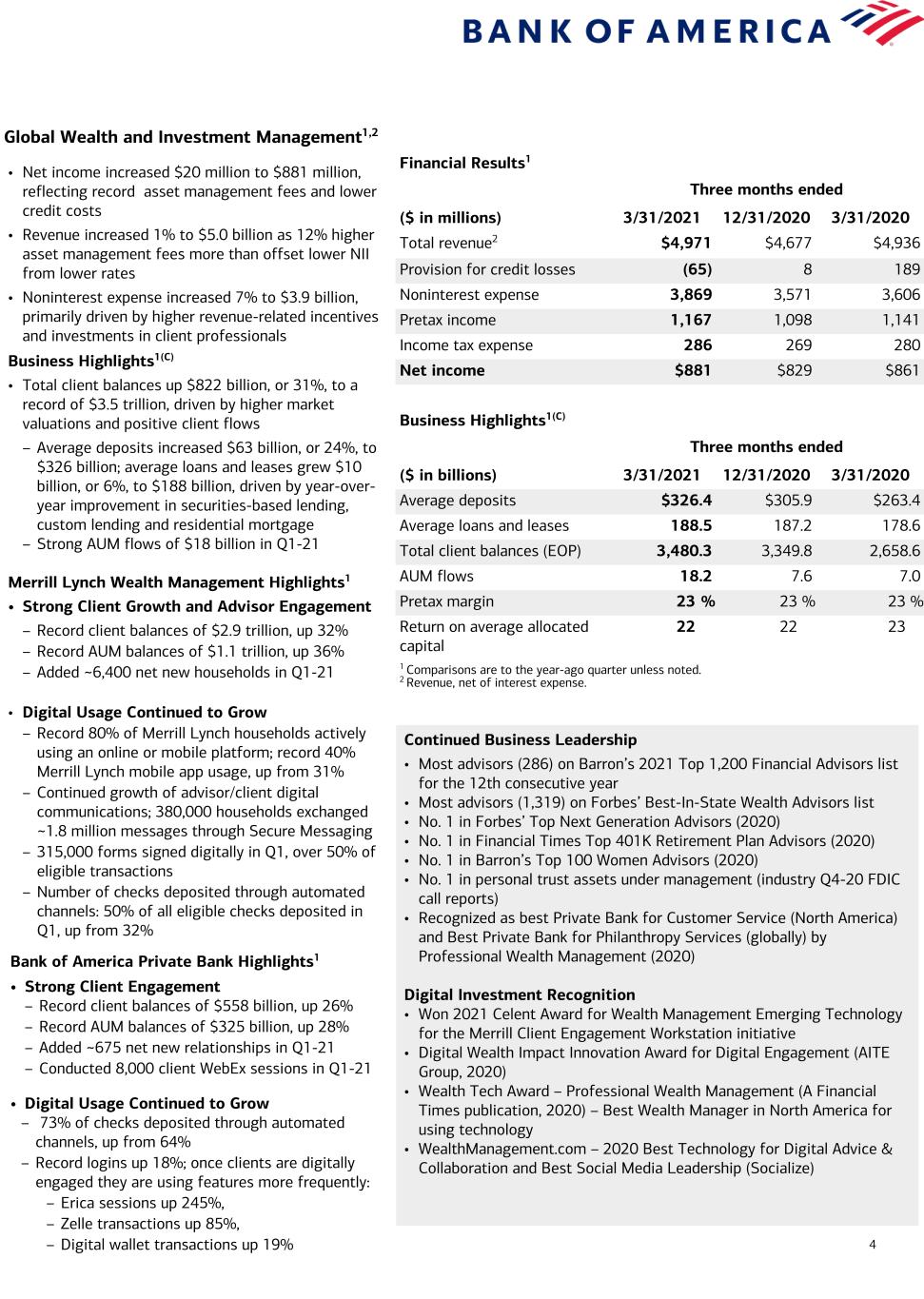 3 Consumer Banking1,2 Financial Results1 Three months ended ($ in millions) 3/31/2021 12/31/2020 3/31/2020 Total revenue2 $8,069 $8,242 $9,129 Provision for credit losses (617) 4 2,258 Noninterest expense 5,131 4,809 4,496 Pretax income 3,555 3,429 2,375 Income tax expense 871 840 582 Net income $2,684 $2,589 $1,793 Business Highlights1,3(C) Three months ended ($ in billions) 3/31/2021 12/31/2020 3/31/2020 Average deposits $924.1 $885.2 $736.7 Average loans and leases 290.9 305.1 316.9 Consumer investment assets (EOP) 324.5 306.1 212.2 Active mobile banking users (MM) 31.5 30.8 29.8 Number of financial centers 4,324 4,312 4,297 Efficiency ratio 64 % 58 % 49 % Return on average allocated capital 28 27 19 Total Consumer Credit Card3 Average credit card outstanding balances $74.2 $78.2 $94.5 Total credit/debit spend 172.5 173.7 153.0 Risk-adjusted margin 9.3 % 10.8 % 7.9 % 1 Comparisons are to the year-ago quarter unless noted. 2 Revenue, net of interest expense. 3 The Consumer credit card portfolio includes Consumer Banking and GWIM. • Net income increased $891 million to $2.7 billion, driven by lower provision for credit losses, reflecting an improved macroeconomic outlook • Revenue of $8.1 billion decreased 12% due to lower NII from lower rates and lower loan balances • Provision for credit losses improved $2.9 billion to a benefit of $617 million, reflecting a reserve release(A) of $1.4 billion versus a build in the year-ago quarter – Net charge-off ratio improved to 1.13%, compared to 1.22% • Noninterest expense increased 14% to $5.1 billion, driven primarily by a $240 million impairment charge for real estate rationalization, along with incremental expense to support customers and employees as a result of the COVID-19 pandemic Business Highlights1,3(C) • Average deposits grew $187 billion, or 25%; average loans fell $26 billion, or 8%, driven by lower card balances • Consumer investment assets grew $112 billion, or 53%, to $324 billion, driven by market performance and strong client flows – $25 billion of client flows since Q1-20 – 3.1 million client accounts, up 10% • Combined credit/debit card spend up 13%; debit card up 22% and credit card up slightly • 7.3 million Consumer clients enrolled in Preferred Rewards, up 17%, with 99% annualized retention rate Digital Usage Continued to Grow1 • 40.3 million active digital banking users, up 3% • Digital sales were 49% of all Consumer Banking sales • 2.6 billion digital logins in Q1-21 • 13.5 million active Zelle® users, now including small businesses; sent and received 170 million transfers worth $49.5 billion, up 66% and 83% YoY respectively • Clients booked a record ~786,000 digital appointments with an associate Continued Business Leadership • No. 1 Consumer Deposit Market Share (Estimated retail consumer deposits based on June 30, 2020 FDIC deposit data) • No. 1 Small Business Lender (FDIC, Q4-20) • No. 1 Online Banking and Mobile Banking Functionality (Keynova Q4-20, Online Banker Scorecard, Keynova Q1-21 Mobile Banker Scorecard, Javelin 2020 Online and Mobile Banking Scorecards) • No. 1 in Prime Auto Credit Distribution of New Originations Among Peers (Experian AutoCount; Franchised Dealers; largest percentage of 680+ Vantage 3.0 loan originations among key competitors as of January 2021) • Best Mortgage Lender for First-Time Homebuyers (Nerdwallet, 2021) • Merrill Guided Investing - Best Robo-Advisor for Education (Investopedia, October 2020) • Merrill Edge Self-Directed - No. 1 for Overall Client Experience, ESG Investing, Client Dashboard and Banking (StockBrokers.com, January 2021) • Merrill Edge Self-Directed - No. 1 User Experience (Kiplinger's, August 2020)