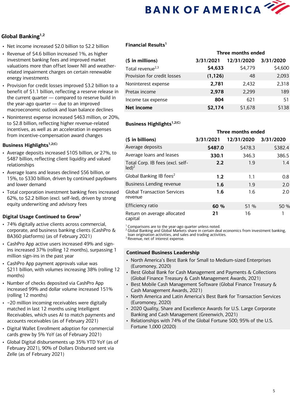 4 Global Wealth and Investment Management1,2 Financial Results1 Three months ended ($ in millions) 3/31/2021 12/31/2020 3/31/2020 Total revenue2 $4,971 $4,677 $4,936 Provision for credit losses (65) 8 189 Noninterest expense 3,869 3,571 3,606 Pretax income 1,167 1,098 1,141 Income tax expense 286 269 280 Net income $881 $829 $861 Business Highlights1(C) Three months ended ($ in billions) 3/31/2021 12/31/2020 3/31/2020 Average deposits $326.4 $305.9 $263.4 Average loans and leases 188.5 187.2 178.6 Total client balances (EOP) 3,480.3 3,349.8 2,658.6 AUM flows 18.2 7.6 7.0 Pretax margin 23 % 23 % 23 % Return on average allocated capital 22 22 23 1 Comparisons are to the year-ago quarter unless noted. 2 Revenue, net of interest expense. Continued Business Leadership • Most advisors (286) on Barron’s 2021 Top 1,200 Financial Advisors list for the 12th consecutive year • Most advisors (1,319) on Forbes’ Best-In-State Wealth Advisors list • No. 1 in Forbes’ Top Next Generation Advisors (2020) • No. 1 in Financial Times Top 401K Retirement Plan Advisors (2020) • No. 1 in Barron’s Top 100 Women Advisors (2020) • No. 1 in personal trust assets under management (industry Q4-20 FDIC call reports) • Recognized as best Private Bank for Customer Service (North America) and Best Private Bank for Philanthropy Services (globally) by Professional Wealth Management (2020) Digital Investment Recognition • Won 2021 Celent Award for Wealth Management Emerging Technology for the Merrill Client Engagement Workstation initiative • Digital Wealth Impact Innovation Award for Digital Engagement (AITE Group, 2020) • Wealth Tech Award – Professional Wealth Management (A Financial Times publication, 2020) – Best Wealth Manager in North America for using technology • WealthManagement.com – 2020 Best Technology for Digital Advice & Collaboration and Best Social Media Leadership (Socialize) • Net income increased $20 million to $881 million, reflecting record asset management fees and lower credit costs • Revenue increased 1% to $5.0 billion as 12% higher asset management fees more than offset lower NII from lower rates • Noninterest expense increased 7% to $3.9 billion, primarily driven by higher revenue-related incentives and investments in client professionals Business Highlights1(C) • Total client balances up $822 billion, or 31%, to a record of $3.5 trillion, driven by higher market valuations and positive client flows – Average deposits increased $63 billion, or 24%, to $326 billion; average loans and leases grew $10 billion, or 6%, to $188 billion, driven by year-over- year improvement in securities-based lending, custom lending and residential mortgage – Strong AUM flows of $18 billion in Q1-21 Merrill Lynch Wealth Management Highlights1 • Strong Client Growth and Advisor Engagement – Record client balances of $2.9 trillion, up 32% – Record AUM balances of $1.1 trillion, up 36% – Added ~6,400 net new households in Q1-21 • Digital Usage Continued to Grow – Record 80% of Merrill Lynch households actively using an online or mobile platform; record 40% Merrill Lynch mobile app usage, up from 31% – Continued growth of advisor/client digital communications; 380,000 households exchanged ~1.8 million messages through Secure Messaging – 315,000 forms signed digitally in Q1, over 50% of eligible transactions – Number of checks deposited through automated channels: 50% of all eligible checks deposited in Q1, up from 32% • Strong Client Engagement – Record client balances of $558 billion, up 26% – Record AUM balances of $325 billion, up 28% – Added ~675 net new relationships in Q1-21 – Conducted 8,000 client WebEx sessions in Q1-21 Bank of America Private Bank Highlights1 • Digital Usage Continued to Grow – 73% of checks deposited through automated channels, up from 64% – Record logins up 18%; once clients are digitally engaged they are using features more frequently: – Erica sessions up 245%, – Zelle transactions up 85%, – Digital wallet transactions up 19%