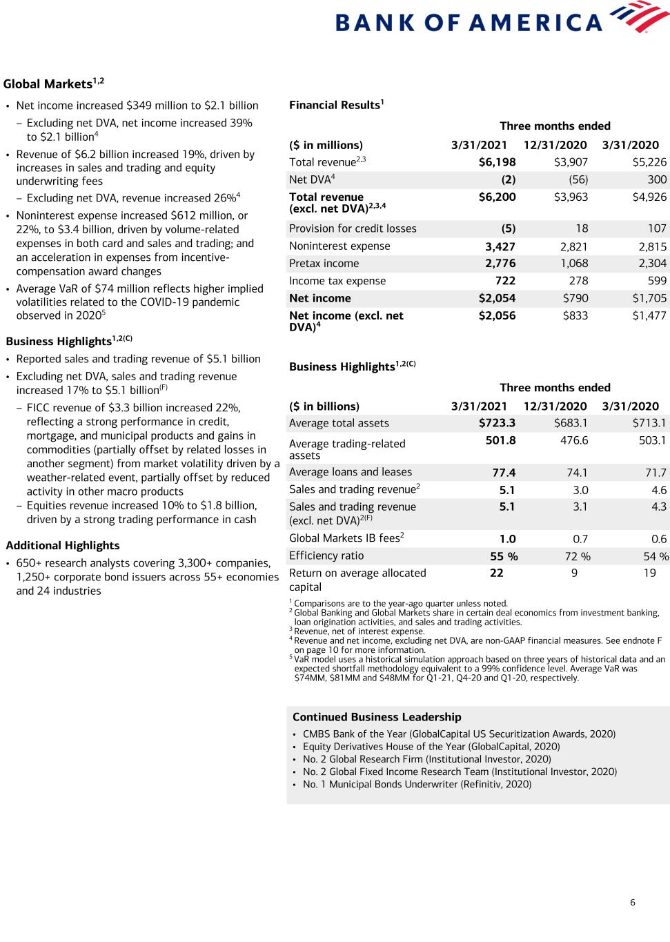 5 Global Banking1,2 Financial Results1 Three months ended ($ in millions) 3/31/2021 12/31/2020 3/31/2020 Total revenue2,3 $4,633 $4,779 $4,600 Provision for credit losses (1,126) 48 2,093 Noninterest expense 2,781 2,432 2,318 Pretax income 2,978 2,299 189 Income tax expense 804 621 51 Net income $2,174 $1,678 $138 Business Highlights1,2(C) Three months ended ($ in billions) 3/31/2021 12/31/2020 3/31/2020 Average deposits $487.0 $478.3 $382.4 Average loans and leases 330.1 346.3 386.5 Total Corp. IB fees (excl. self- led)2 2.2 1.9 1.4 Global Banking IB fees2 1.2 1.1 0.8 Business Lending revenue 1.6 1.9 2.0 Global Transaction Services revenue 1.6 1.6 2.0 Efficiency ratio 60 % 51 % 50 % Return on average allocated capital 21 16 1 1 Comparisons are to the year-ago quarter unless noted. 2 Global Banking and Global Markets share in certain deal economics from investment banking, loan origination activities, and sales and trading activities. 3 Revenue, net of interest expense. • Net income increased $2.0 billion to $2.2 billion • Revenue of $4.6 billion increased 1%, as higher investment banking fees and improved market valuations more than offset lower NII and weather- related impairment charges on certain renewable energy investments • Provision for credit losses improved $3.2 billion to a benefit of $1.1 billion, reflecting a reserve release in the current quarter — compared to reserve build in the year-ago quarter — due to an improved macroeconomic outlook and loan balance declines • Noninterest expense increased $463 million, or 20%, to $2.8 billion, reflecting higher revenue-related incentives, as well as an acceleration in expenses from incentive-compensation award changes Business Highlights1,2(C) • Average deposits increased $105 billion, or 27%, to $487 billion, reflecting client liquidity and valued relationships • Average loans and leases declined $56 billion, or 15%, to $330 billion, driven by continued paydowns and lower demand • Total corporation investment banking fees increased 62%, to $2.2 billion (excl. self-led), driven by strong equity underwriting and advisory fees Continued Business Leadership • North America’s Best Bank for Small to Medium-sized Enterprises (Euromoney, 2020) • Best Global Bank for Cash Management and Payments & Collections (Global Finance Treasury & Cash Management Awards, 2021) • Best Mobile Cash Management Software (Global Finance Treasury & Cash Management Awards, 2021) • North America and Latin America’s Best Bank for Transaction Services (Euromoney, 2020) • 2020 Quality, Share and Excellence Awards for U.S. Large Corporate Banking and Cash Management (Greenwich, 2021) • Relationships with 74% of the Global Fortune 500; 95% of the U.S. Fortune 1,000 (2020) Digital Usage Continued to Grow1 • 74% digitally active clients across commercial, corporate, and business banking clients (CashPro & BA360 platforms) (as of February 2021) • CashPro App active users increased 49% and sign- ins increased 37% (rolling 12 months), surpassing 1 million sign-ins in the past year • CashPro App payment approvals value was $211 billion, with volumes increasing 38% (rolling 12 months) • Number of checks deposited via CashPro App increased 99% and dollar volume increased 151% (rolling 12 months) • ~20 million incoming receivables were digitally matched in last 12 months using Intelligent Receivables, which uses AI to match payments and accounts receivables (as of February 2021) • Digital Wallet Enrollment adoption for commercial cards grew by 5% YoY (as of February 2021) • Global Digital disbursements up 35% YTD YoY (as of February 2021), 90% of Dollars Disbursed sent via Zelle (as of February 2021)