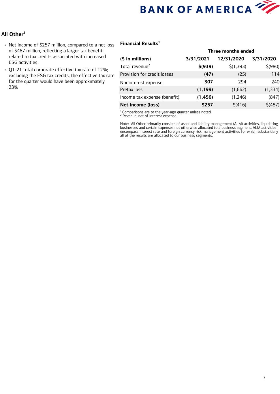 6 Global Markets1,2 Financial Results1 Three months ended ($ in millions) 3/31/2021 12/31/2020 3/31/2020 Total revenue2,3 $6,198 $3,907 $5,226 Net DVA4 (2) (56) 300 Total revenue (excl. net DVA)2,3,4 $6,200 $3,963 $4,926 Provision for credit losses (5) 18 107 Noninterest expense 3,427 2,821 2,815 Pretax income 2,776 1,068 2,304 Income tax expense 722 278 599 Net income $2,054 $790 $1,705 Net income (excl. net DVA)4 $2,056 $833 $1,477 Business Highlights1,2(C) Three months ended ($ in billions) 3/31/2021 12/31/2020 3/31/2020 Average total assets $723.3 $683.1 $713.1 Average trading-related assets 501.8 476.6 503.1 Average loans and leases 77.4 74.1 71.7 Sales and trading revenue2 5.1 3.0 4.6 Sales and trading revenue (excl. net DVA)2(F) 5.1 3.1 4.3 Global Markets IB fees2 1.0 0.7 0.6 Efficiency ratio 55 % 72 % 54 % Return on average allocated capital 22 9 19 1 Comparisons are to the year-ago quarter unless noted. 2 Global Banking and Global Markets share in certain deal economics from investment banking, loan origination activities, and sales and trading activities. 3 Revenue, net of interest expense. 4 Revenue and net income, excluding net DVA, are non-GAAP financial measures. See endnote F on page 10 for more information. 5 VaR model uses a historical simulation approach based on three years of historical data and an expected shortfall methodology equivalent to a 99% confidence level. Average VaR was $74MM, $81MM and $48MM for Q1-21, Q4-20 and Q1-20, respectively. • Net income increased $349 million to $2.1 billion – Excluding net DVA, net income increased 39% to $2.1 billion4 • Revenue of $6.2 billion increased 19%, driven by increases in sales and trading and equity underwriting fees – Excluding net DVA, revenue increased 26%4 • Noninterest expense increased $612 million, or 22%, to $3.4 billion, driven by volume-related expenses in both card and sales and trading; and an acceleration in expenses from incentive- compensation award changes • Average VaR of $74 million reflects higher implied volatilities related to the COVID-19 pandemic observed in 20205 Business Highlights1,2(C) • Reported sales and trading revenue of $5.1 billion • Excluding net DVA, sales and trading revenue increased 17% to $5.1 billion(F) – FICC revenue of $3.3 billion increased 22%, reflecting a strong performance in credit, mortgage, and municipal products and gains in commodities (partially offset by related losses in another segment) from market volatility driven by a weather-related event, partially offset by reduced activity in other macro products – Equities revenue increased 10% to $1.8 billion, driven by a strong trading performance in cash Continued Business Leadership • CMBS Bank of the Year (GlobalCapital US Securitization Awards, 2020) • Equity Derivatives House of the Year (GlobalCapital, 2020) • No. 2 Global Research Firm (Institutional Investor, 2020) • No. 2 Global Fixed Income Research Team (Institutional Investor, 2020) • No. 1 Municipal Bonds Underwriter (Refinitiv, 2020) Additional Highlights • 650+ research analysts covering 3,300+ companies, 1,250+ corporate bond issuers across 55+ economies and 24 industries