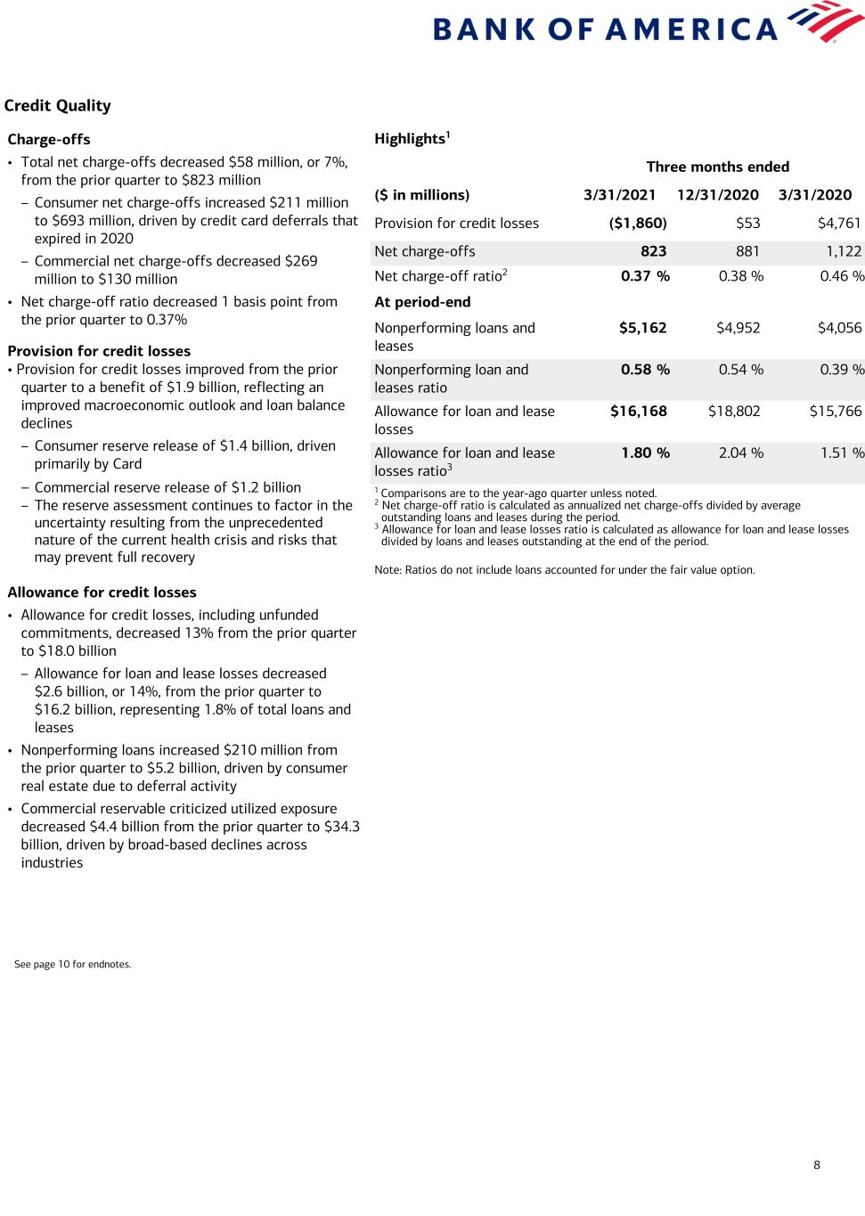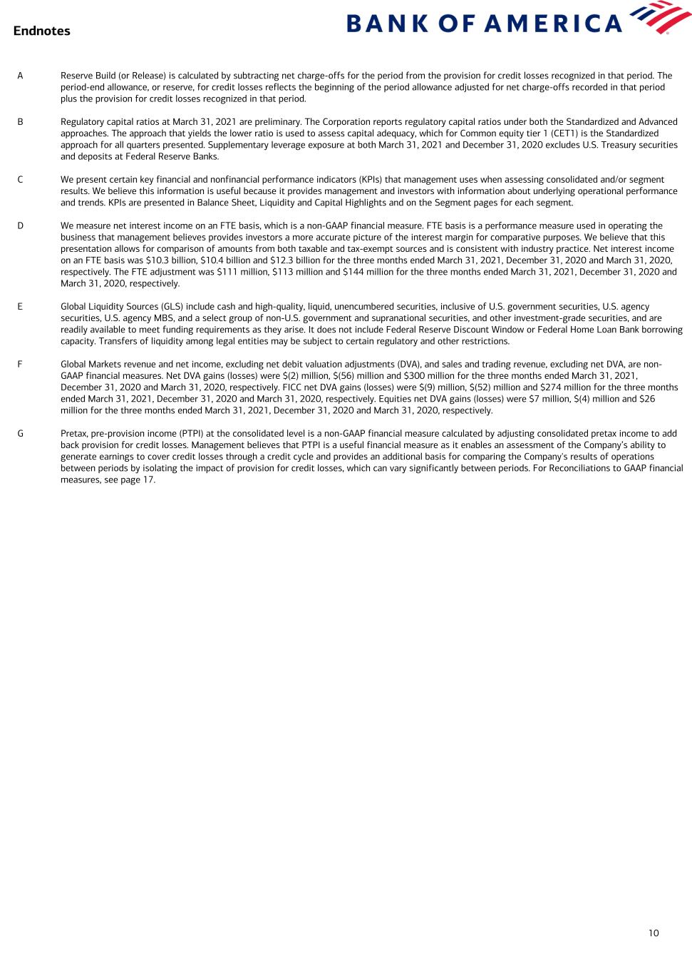 10 A Reserve Build (or Release) is calculated by subtracting net charge-offs for the period from the provision for credit losses recognized in that period. The period-end allowance, or reserve, for credit losses reflects the beginning of the period allowance adjusted for net charge-offs recorded in that period plus the provision for credit losses recognized in that period. B Regulatory capital ratios at March 31, 2021 are preliminary. The Corporation reports regulatory capital ratios under both the Standardized and Advanced approaches. The approach that yields the lower ratio is used to assess capital adequacy, which for Common equity tier 1 (CET1) is the Standardized approach for all quarters presented. Supplementary leverage exposure at both March 31, 2021 and December 31, 2020 excludes U.S. Treasury securities and deposits at Federal Reserve Banks. C We present certain key financial and nonfinancial performance indicators (KPIs) that management uses when assessing consolidated and/or segment results. We believe this information is useful because it provides management and investors with information about underlying operational performance and trends. KPIs are presented in Balance Sheet, Liquidity and Capital Highlights and on the Segment pages for each segment. D We measure net interest income on an FTE basis, which is a non-GAAP financial measure. FTE basis is a performance measure used in operating the business that management believes provides investors a more accurate picture of the interest margin for comparative purposes. We believe that this presentation allows for comparison of amounts from both taxable and tax-exempt sources and is consistent with industry practice. Net interest income on an FTE basis was $10.3 billion, $10.4 billion and $12.3 billion for the three months ended March 31, 2021, December 31, 2020 and March 31, 2020, respectively. The FTE adjustment was $111 million, $113 million and $144 million for the three months ended March 31, 2021, December 31, 2020 and March 31, 2020, respectively. E Global Liquidity Sources (GLS) include cash and high-quality, liquid, unencumbered securities, inclusive of U.S. government securities, U.S. agency securities, U.S. agency MBS, and a select group of non-U.S. government and supranational securities, and other investment-grade securities, and are readily available to meet funding requirements as they arise. It does not include Federal Reserve Discount Window or Federal Home Loan Bank borrowing capacity. Transfers of liquidity among legal entities may be subject to certain regulatory and other restrictions. F Global Markets revenue and net income, excluding net debit valuation adjustments (DVA), and sales and trading revenue, excluding net DVA, are non- GAAP financial measures. Net DVA gains (losses) were $(2) million, $(56) million and $300 million for the three months ended March 31, 2021, December 31, 2020 and March 31, 2020, respectively. FICC net DVA gains (losses) were $(9) million, $(52) million and $274 million for the three months ended March 31, 2021, December 31, 2020 and March 31, 2020, respectively. Equities net DVA gains (losses) were $7 million, $(4) million and $26 million for the three months ended March 31, 2021, December 31, 2020 and March 31, 2020, respectively. G Pretax, pre-provision income (PTPI) at the consolidated level is a non-GAAP financial measure calculated by adjusting consolidated pretax income to add back provision for credit losses. Management believes that PTPI is a useful financial measure as it enables an assessment of the Company’s ability to generate earnings to cover credit losses through a credit cycle and provides an additional basis for comparing the Company's results of operations between periods by isolating the impact of provision for credit losses, which can vary significantly between periods. For Reconciliations to GAAP financial measures, see page 17. Endnotes