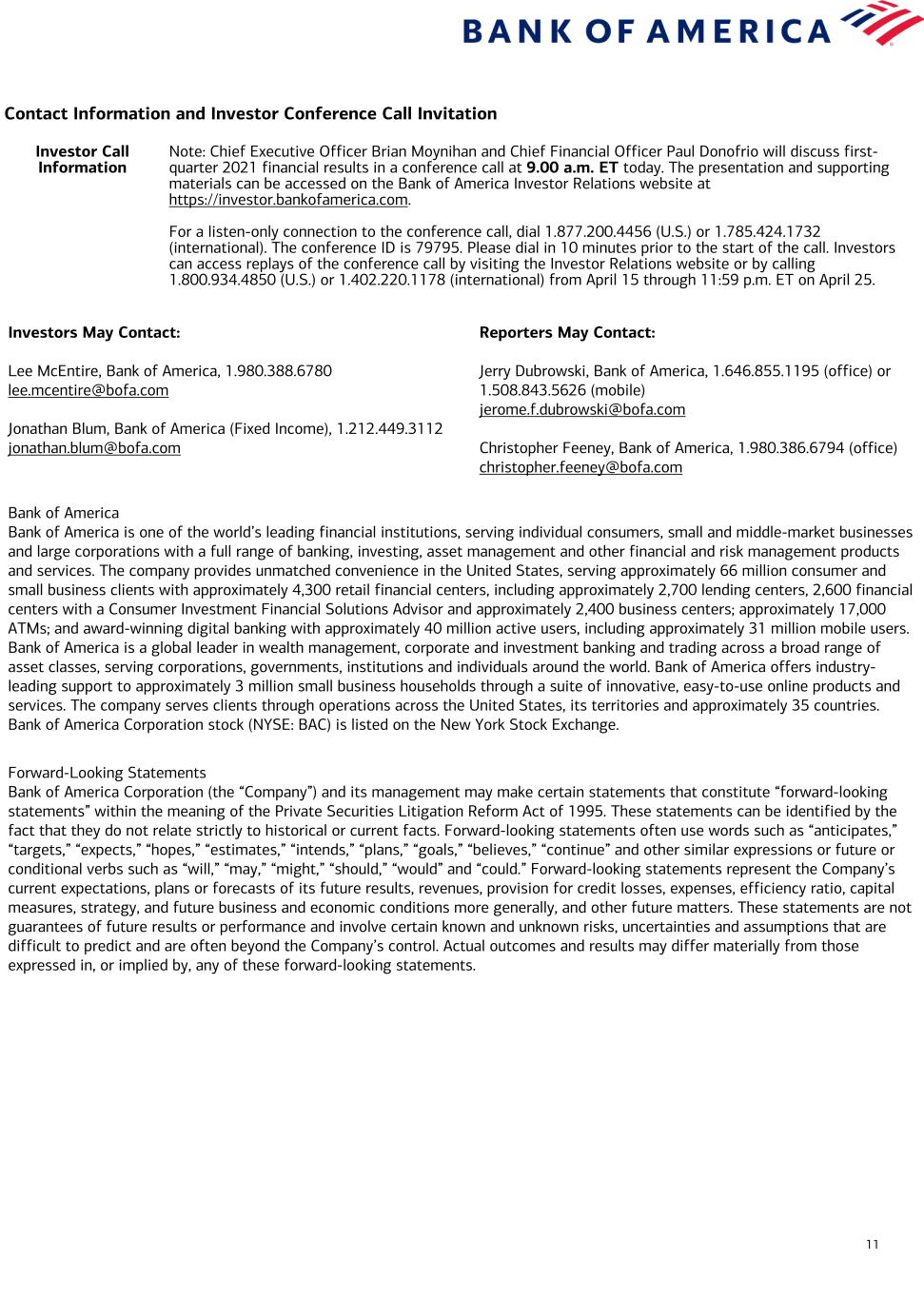 11 Contact Information and Investor Conference Call Invitation Investor Call Information Note: Chief Executive Officer Brian Moynihan and Chief Financial Officer Paul Donofrio will discuss first- quarter 2021 financial results in a conference call at 9.00 a.m. ET today. The presentation and supporting materials can be accessed on the Bank of America Investor Relations website at https://investor.bankofamerica.com. For a listen-only connection to the conference call, dial 1.877.200.4456 (U.S.) or 1.785.424.1732 (international). The conference ID is 79795. Please dial in 10 minutes prior to the start of the call. Investors can access replays of the conference call by visiting the Investor Relations website or by calling 1.800.934.4850 (U.S.) or 1.402.220.1178 (international) from April 15 through 11:59 p.m. ET on April 25. Bank of America Bank of America is one of the world’s leading financial institutions, serving individual consumers, small and middle-market businesses and large corporations with a full range of banking, investing, asset management and other financial and risk management products and services. The company provides unmatched convenience in the United States, serving approximately 66 million consumer and small business clients with approximately 4,300 retail financial centers, including approximately 2,700 lending centers, 2,600 financial centers with a Consumer Investment Financial Solutions Advisor and approximately 2,400 business centers; approximately 17,000 ATMs; and award-winning digital banking with approximately 40 million active users, including approximately 31 million mobile users. Bank of America is a global leader in wealth management, corporate and investment banking and trading across a broad range of asset classes, serving corporations, governments, institutions and individuals around the world. Bank of America offers industry- leading support to approximately 3 million small business households through a suite of innovative, easy-to-use online products and services. The company serves clients through operations across the United States, its territories and approximately 35 countries. Bank of America Corporation stock (NYSE: BAC) is listed on the New York Stock Exchange. Forward-Looking Statements Bank of America Corporation (the “Company”) and its management may make certain statements that constitute “forward-looking statements” within the meaning of the Private Securities Litigation Reform Act of 1995. These statements can be identified by the fact that they do not relate strictly to historical or current facts. Forward-looking statements often use words such as “anticipates,” “targets,” “expects,” “hopes,” “estimates,” “intends,” “plans,” “goals,” “believes,” “continue” and other similar expressions or future or conditional verbs such as “will,” “may,” “might,” “should,” “would” and “could.” Forward-looking statements represent the Company’s current expectations, plans or forecasts of its future results, revenues, provision for credit losses, expenses, efficiency ratio, capital measures, strategy, and future business and economic conditions more generally, and other future matters. These statements are not guarantees of future results or performance and involve certain known and unknown risks, uncertainties and assumptions that are difficult to predict and are often beyond the Company’s control. Actual outcomes and results may differ materially from those expressed in, or implied by, any of these forward-looking statements. Reporters May Contact: Jerry Dubrowski, Bank of America, 1.646.855.1195 (office) or 1.508.843.5626 (mobile) jerome.f.dubrowski@bofa.com Christopher Feeney, Bank of America, 1.980.386.6794 (office) christopher.feeney@bofa.com Investors May Contact: Lee McEntire, Bank of America, 1.980.388.6780 lee.mcentire@bofa.com Jonathan Blum, Bank of America (Fixed Income), 1.212.449.3112 jonathan.blum@bofa.com