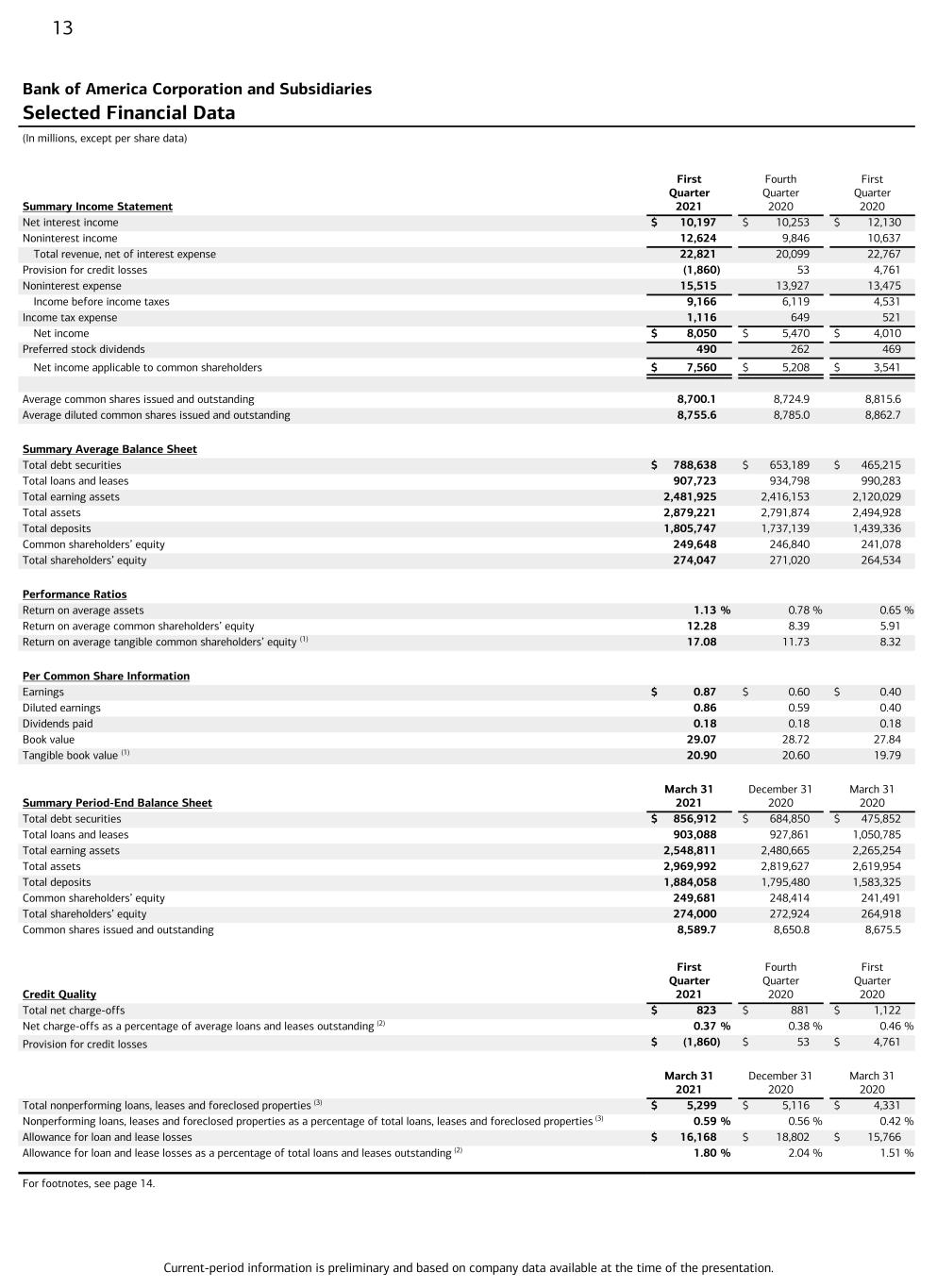 Current-period information is preliminary and based on company data available at the time of the presentation. 13 Bank of America Corporation and Subsidiaries Selected Financial Data (In millions, except per share data) First Quarter 2021 Fourth Quarter 2020 First Quarter 2020Summary Income Statement Net interest income $ 10,197 $ 10,253 $ 12,130 Noninterest income 12,624 9,846 10,637 Total revenue, net of interest expense 22,821 20,099 22,767 Provision for credit losses (1,860) 53 4,761 Noninterest expense 15,515 13,927 13,475 Income before income taxes 9,166 6,119 4,531 Income tax expense 1,116 649 521 Net income $ 8,050 $ 5,470 $ 4,010 Preferred stock dividends 490 262 469 Net income applicable to common shareholders $ 7,560 $ 5,208 $ 3,541 Average common shares issued and outstanding 8,700.1 8,724.9 8,815.6 Average diluted common shares issued and outstanding 8,755.6 8,785.0 8,862.7 Summary Average Balance Sheet Total debt securities $ 788,638 $ 653,189 $ 465,215 Total loans and leases 907,723 934,798 990,283 Total earning assets 2,481,925 2,416,153 2,120,029 Total assets 2,879,221 2,791,874 2,494,928 Total deposits 1,805,747 1,737,139 1,439,336 Common shareholders’ equity 249,648 246,840 241,078 Total shareholders’ equity 274,047 271,020 264,534 Performance Ratios Return on average assets 1.13 % 0.78 % 0.65 % Return on average common shareholders’ equity 12.28 8.39 5.91 Return on average tangible common shareholders’ equity (1) 17.08 11.73 8.32 Per Common Share Information Earnings $ 0.87 $ 0.60 $ 0.40 Diluted earnings 0.86 0.59 0.40 Dividends paid 0.18 0.18 0.18 Book value 29.07 28.72 27.84 Tangible book value (1) 20.90 20.60 19.79 Summary Period-End Balance Sheet March 31 2021 December 31 2020 March 31 2020 Total debt securities $ 856,912 $ 684,850 $ 475,852 Total loans and leases 903,088 927,861 1,050,785 Total earning assets 2,548,811 2,480,665 2,265,254 Total assets 2,969,992 2,819,627 2,619,954 Total deposits 1,884,058 1,795,480 1,583,325 Common shareholders’ equity 249,681 248,414 241,491 Total shareholders’ equity 274,000 272,924 264,918 Common shares issued and outstanding 8,589.7 8,650.8 8,675.5 First Quarter 2021 Fourth Quarter 2020 First Quarter 2020Credit Quality Total net charge-offs $ 823 $ 881 $ 1,122 Net charge-offs as a percentage of average loans and leases outstanding (2) 0.37 % 0.38 % 0.46 % Provision for credit losses $ (1,860) $ 53 $ 4,761 March 31 2021 December 31 2020 March 31 2020 Total nonperforming loans, leases and foreclosed properties (3) $ 5,299 $ 5,116 $ 4,331 Nonperforming loans, leases and foreclosed properties as a percentage of total loans, leases and foreclosed properties (3) 0.59 % 0.56 % 0.42 % Allowance for loan and lease losses $ 16,168 $ 18,802 $ 15,766 Allowance for loan and lease losses as a percentage of total loans and leases outstanding (2) 1.80 % 2.04 % 1.51 % For footnotes, see page 14.