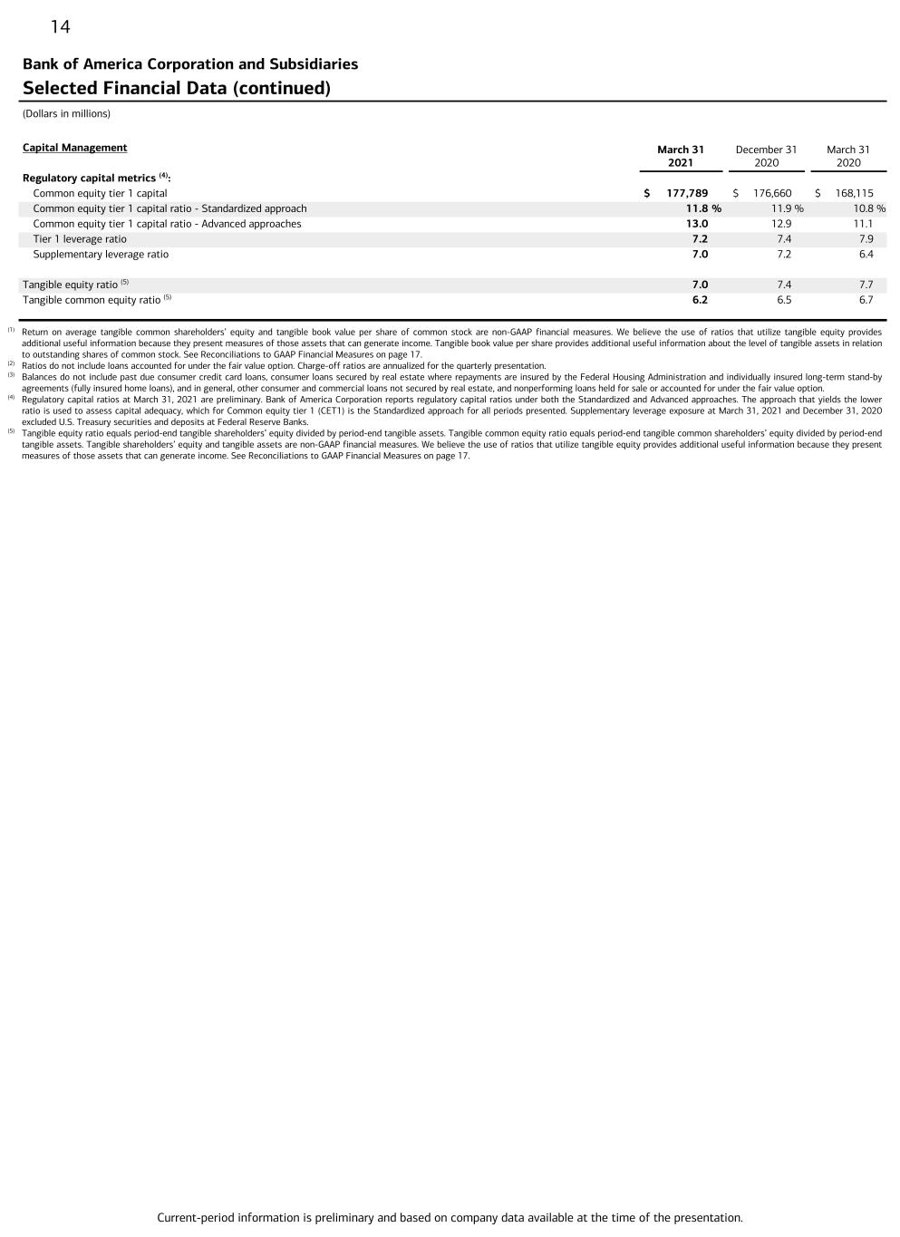 Current-period information is preliminary and based on company data available at the time of the presentation. 14 Bank of America Corporation and Subsidiaries Selected Financial Data (continued) (Dollars in millions) Capital Management March 31 2021 December 31 2020 March 31 2020 Regulatory capital metrics (4): Common equity tier 1 capital $ 177,789 $ 176,660 $ 168,115 Common equity tier 1 capital ratio - Standardized approach 11.8 % 11.9 % 10.8 % Common equity tier 1 capital ratio - Advanced approaches 13.0 12.9 11.1 Tier 1 leverage ratio 7.2 7.4 7.9 Supplementary leverage ratio 7.0 7.2 6.4 Tangible equity ratio (5) 7.0 7.4 7.7 Tangible common equity ratio (5) 6.2 6.5 6.7 (1) Return on average tangible common shareholders’ equity and tangible book value per share of common stock are non-GAAP financial measures. We believe the use of ratios that utilize tangible equity provides additional useful information because they present measures of those assets that can generate income. Tangible book value per share provides additional useful information about the level of tangible assets in relation to outstanding shares of common stock. See Reconciliations to GAAP Financial Measures on page 17. (2) Ratios do not include loans accounted for under the fair value option. Charge-off ratios are annualized for the quarterly presentation. (3) Balances do not include past due consumer credit card loans, consumer loans secured by real estate where repayments are insured by the Federal Housing Administration and individually insured long-term stand-by agreements (fully insured home loans), and in general, other consumer and commercial loans not secured by real estate, and nonperforming loans held for sale or accounted for under the fair value option. (4) Regulatory capital ratios at March 31, 2021 are preliminary. Bank of America Corporation reports regulatory capital ratios under both the Standardized and Advanced approaches. The approach that yields the lower ratio is used to assess capital adequacy, which for Common equity tier 1 (CET1) is the Standardized approach for all periods presented. Supplementary leverage exposure at March 31, 2021 and December 31, 2020 excluded U.S. Treasury securities and deposits at Federal Reserve Banks. (5) Tangible equity ratio equals period-end tangible shareholders’ equity divided by period-end tangible assets. Tangible common equity ratio equals period-end tangible common shareholders’ equity divided by period-end tangible assets. Tangible shareholders’ equity and tangible assets are non-GAAP financial measures. We believe the use of ratios that utilize tangible equity provides additional useful information because they present measures of those assets that can generate income. See Reconciliations to GAAP Financial Measures on page 17.