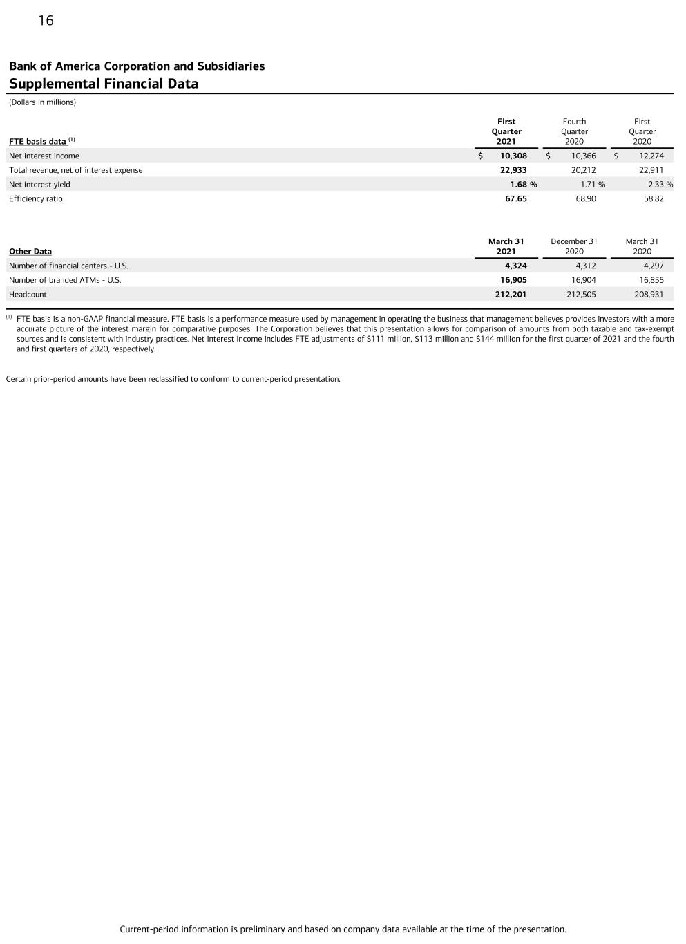 Current-period information is preliminary and based on company data available at the time of the presentation. 16 Bank of America Corporation and Subsidiaries Supplemental Financial Data (Dollars in millions) First Quarter 2021 Fourth Quarter 2020 First Quarter 2020FTE basis data (1) Net interest income $ 10,308 $ 10,366 $ 12,274 Total revenue, net of interest expense 22,933 20,212 22,911 Net interest yield 1.68 % 1.71 % 2.33 % Efficiency ratio 67.65 68.90 58.82 Other Data March 31 2021 December 31 2020 March 31 2020 Number of financial centers - U.S. 4,324 4,312 4,297 Number of branded ATMs - U.S. 16,905 16,904 16,855 Headcount 212,201 212,505 208,931 (1) FTE basis is a non-GAAP financial measure. FTE basis is a performance measure used by management in operating the business that management believes provides investors with a more accurate picture of the interest margin for comparative purposes. The Corporation believes that this presentation allows for comparison of amounts from both taxable and tax-exempt sources and is consistent with industry practices. Net interest income includes FTE adjustments of $111 million, $113 million and $144 million for the first quarter of 2021 and the fourth and first quarters of 2020, respectively. Certain prior-period amounts have been reclassified to conform to current-period presentation.