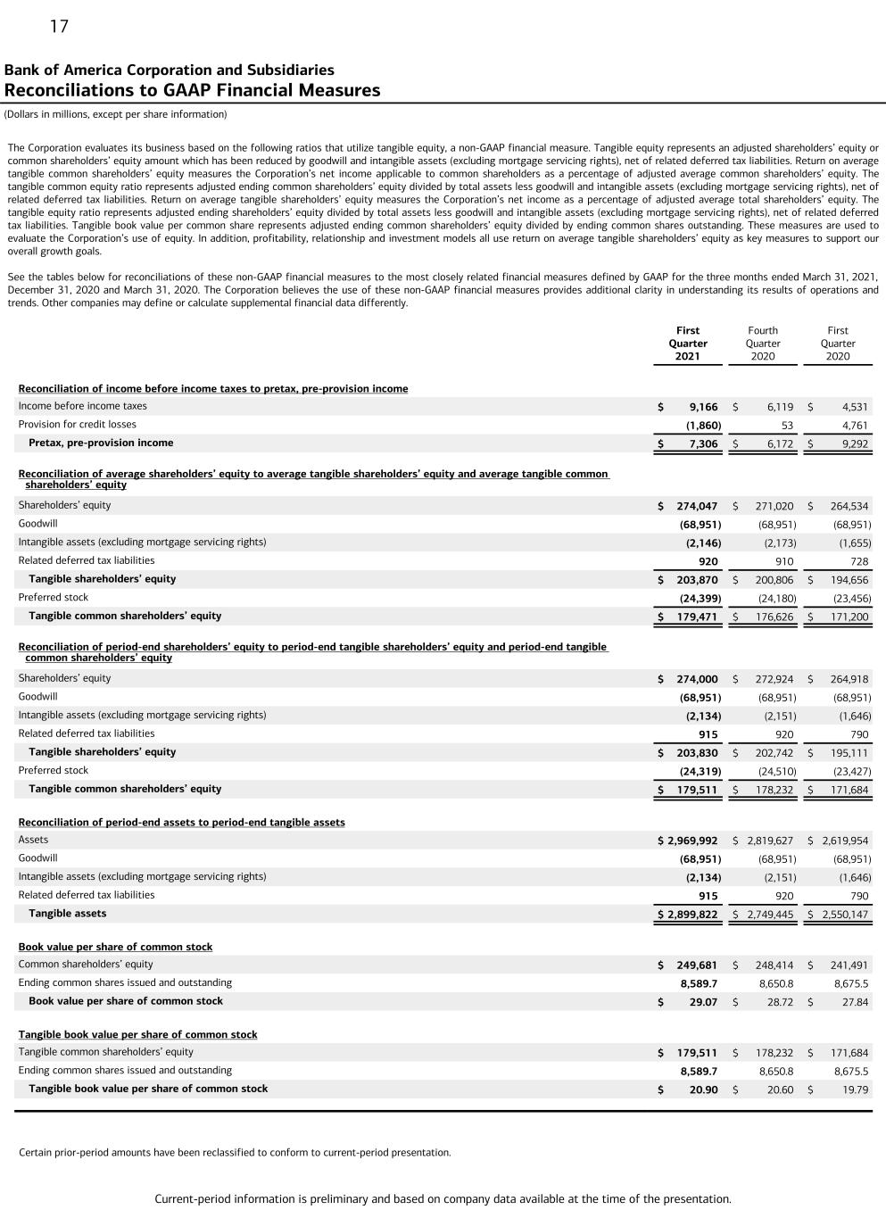 Current-period information is preliminary and based on company data available at the time of the presentation. 17 The Corporation evaluates its business based on the following ratios that utilize tangible equity, a non-GAAP financial measure. Tangible equity represents an adjusted shareholders’ equity or common shareholders’ equity amount which has been reduced by goodwill and intangible assets (excluding mortgage servicing rights), net of related deferred tax liabilities. Return on average tangible common shareholders’ equity measures the Corporation’s net income applicable to common shareholders as a percentage of adjusted average common shareholders’ equity. The tangible common equity ratio represents adjusted ending common shareholders’ equity divided by total assets less goodwill and intangible assets (excluding mortgage servicing rights), net of related deferred tax liabilities. Return on average tangible shareholders’ equity measures the Corporation’s net income as a percentage of adjusted average total shareholders’ equity. The tangible equity ratio represents adjusted ending shareholders’ equity divided by total assets less goodwill and intangible assets (excluding mortgage servicing rights), net of related deferred tax liabilities. Tangible book value per common share represents adjusted ending common shareholders’ equity divided by ending common shares outstanding. These measures are used to evaluate the Corporation’s use of equity. In addition, profitability, relationship and investment models all use return on average tangible shareholders’ equity as key measures to support our overall growth goals. See the tables below for reconciliations of these non-GAAP financial measures to the most closely related financial measures defined by GAAP for the three months ended March 31, 2021, December 31, 2020 and March 31, 2020. The Corporation believes the use of these non-GAAP financial measures provides additional clarity in understanding its results of operations and trends. Other companies may define or calculate supplemental financial data differently. Bank of America Corporation and Subsidiaries Reconciliations to GAAP Financial Measures (Dollars in millions, except per share information) First Quarter 2021 Fourth Quarter 2020 First Quarter 2020 Reconciliation of income before income taxes to pretax, pre-provision income Income before income taxes $ 9,166 $ 6,119 $ 4,531 Provision for credit losses (1,860) 53 4,761 Pretax, pre-provision income $ 7,306 $ 6,172 $ 9,292 Reconciliation of average shareholders’ equity to average tangible shareholders’ equity and average tangible common shareholders’ equity Shareholders’ equity $ 274,047 $ 271,020 $ 264,534 Goodwill (68,951) (68,951) (68,951) Intangible assets (excluding mortgage servicing rights) (2,146) (2,173) (1,655) Related deferred tax liabilities 920 910 728 Tangible shareholders’ equity $ 203,870 $ 200,806 $ 194,656 Preferred stock (24,399) (24,180) (23,456) Tangible common shareholders’ equity $ 179,471 $ 176,626 $ 171,200 Reconciliation of period-end shareholders’ equity to period-end tangible shareholders’ equity and period-end tangible common shareholders’ equity Shareholders’ equity $ 274,000 $ 272,924 $ 264,918 Goodwill (68,951) (68,951) (68,951) Intangible assets (excluding mortgage servicing rights) (2,134) (2,151) (1,646) Related deferred tax liabilities 915 920 790 Tangible shareholders’ equity $ 203,830 $ 202,742 $ 195,111 Preferred stock (24,319) (24,510) (23,427) Tangible common shareholders’ equity $ 179,511 $ 178,232 $ 171,684 Reconciliation of period-end assets to period-end tangible assets Assets $ 2,969,992 $ 2,819,627 $ 2,619,954 Goodwill (68,951) (68,951) (68,951) Intangible assets (excluding mortgage servicing rights) (2,134) (2,151) (1,646) Related deferred tax liabilities 915 920 790 Tangible assets $ 2,899,822 $ 2,749,445 $ 2,550,147 Book value per share of common stock Common shareholders’ equity $ 249,681 $ 248,414 $ 241,491 Ending common shares issued and outstanding 8,589.7 8,650.8 8,675.5 Book value per share of common stock $ 29.07 $ 28.72 $ 27.84 Tangible book value per share of common stock Tangible common shareholders’ equity $ 179,511 $ 178,232 $ 171,684 Ending common shares issued and outstanding 8,589.7 8,650.8 8,675.5 Tangible book value per share of common stock $ 20.90 $ 20.60 $ 19.79 Certain prior-period amounts have been reclassified to conform to current-period presentation.