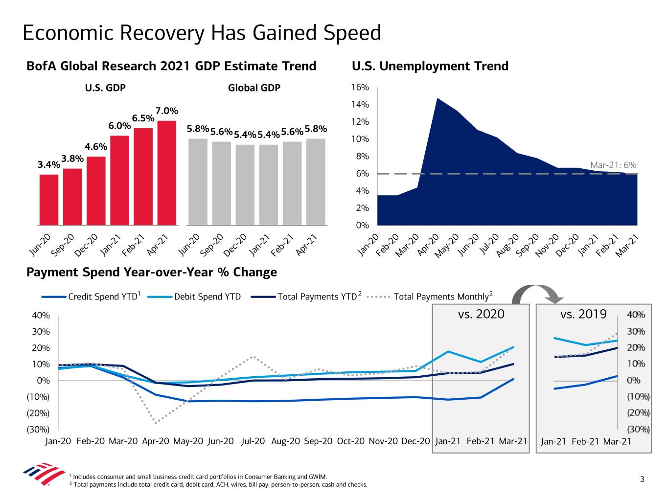 (30%) (20%) (10%) 0% 10% 20% 30% 40% Jan-20 Feb-20 Mar-20 Apr-20 May-20 Jun-20 Jul-20 Aug-20 Sep-20 Oct-20 Nov-20 Dec-20 Jan-21 Feb-21 Mar-21 Credit Spend YTD Debit Spend YTD Total Payments YTD Total Payments Monthly Jan-21 Feb-21 Mar-21 Payment Spend Year-over-Year % Change U.S. Unemployment TrendBofA Global Research 2021 GDP Estimate Trend Economic Recovery Has Gained Speed 1 Includes consumer and small business credit card portfolios in Consumer Banking and GWIM. 2 Total payments include total credit card, debit card, ACH, wires, bill pay, person-to-person, cash and checks. 79% 1 2 2 vs. 2020 3.4% 3.8% 4.6% 6.0% 6.5% 7.0% U.S. GDP 5.8%5.6%5.4%5.4%5.6% 5.8% Global GDP 0% 2% 4% 6% 8% 10% 12% 14% 16% 3 vs. 2019 Mar-21: 6%