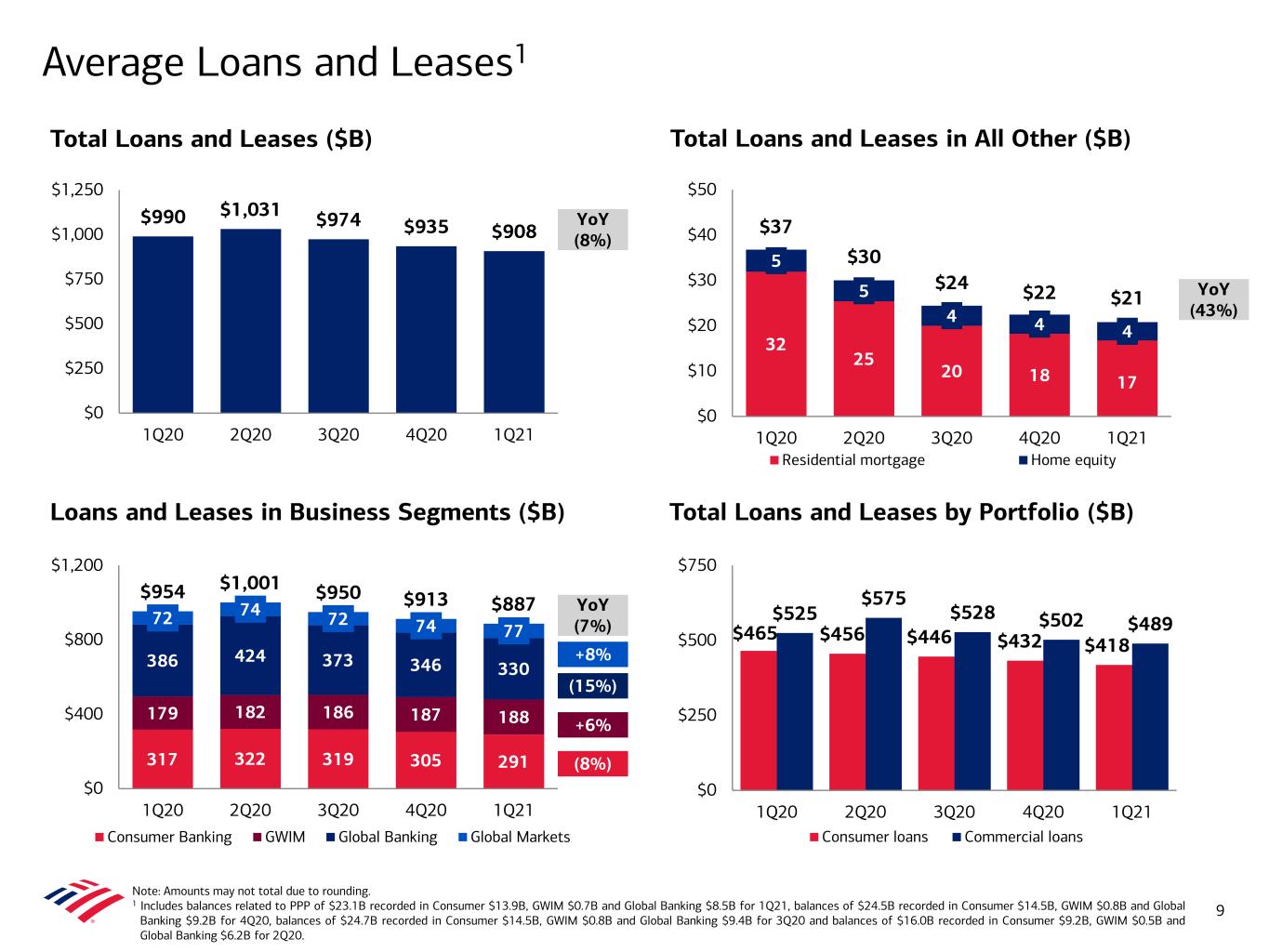 Balance Sheet ($B) Total assets $2,970.0 $2,819.6 $2,620.0 Total loans and leases 903.1 927.9 1,050.8 Total loans and leases in business segments1 883.2 906.6 1,014.7 Total debt securities 856.9 684.9 475.9 Funding & Liquidity ($B) Total deposits $1,884.1 $1,795.5 $1,583.3 Long-term debt 251.2 262.9 256.7 Global Liquidity Sources (average)2 1,003 943 565 Equity ($B) Common shareholders' equity $249.7 $248.4 $241.5 Common equity ratio 8.4 % 8.8 % 9.2 % Tangible common shareholders' equity3 $179.5 $178.2 $171.7 Tangible common equity ratio3 6.2 % 6.5 % 6.7 % Per Share Data Book value per common share $29.07 $28.72 $27.84 Tangible book value per common share3 20.90 20.60 19.79 Common shares outstanding (in billions) 8.59 8.65 8.68 1Q21 4Q20 1Q20 Basel 3 Capital ($B) 4 Common equity tier 1 capital (CET1) $177.8 $176.7 $168.1 Standardized approach Risk-weighted assets (RWA) $1,508 $1,480 $1,561 CET1 ratio 11.8 % 11.9 % 10.8 % Advanced approaches Risk-weighted assets $1,366 $1,371 $1,512 CET1 ratio 13.0 % 12.9 % 11.1 % Supplementary leverage (SLR) SLR as Reported5 7.0 % 7.2 % 6.4 % SLR (without temporary exclusions) 6.1 6.2 1Q21 4Q20 1Q20 • CET1 ratio increased ~100 bps vs. 1Q204 — 1Q21 CET1 ratio (Standardized) of 11.8% — 1Q21 CET1 ratio (Advanced) of 13.0% — CET1 capital of $178B was up $1.1B from 4Q20 — Standardized RWA of $1,508B increased $28B from 4Q20 • Book value per share increased 4% from 1Q20, to $29.07 • $1.0T in average Global Liquidity Sources,2 up $438B, or 78%, from 1Q20 8 1 Excludes loans and leases in All Other. 2 See note C on slide 28 for definition of Global Liquidity Sources. 3 Represent non-GAAP financial measures. For important presentation information, see slide 31. 4 Regulatory capital ratios at March 31, 2021 are preliminary. The Corporation reports regulatory capital ratios under both the Standardized and Advanced approaches. The approach that yields the lower ratio is used to assess capital adequacy, which for Common equity tier 1 (CET1) is the Standardized approach for all periods presented. 5 Supplementary leverage exposure at March 31, 2021 and December 31, 2020 excludes U.S. Treasury securities and deposits at Federal Reserve Banks. Balance Sheet, Liquidity and Capital (EOP basis unless noted)