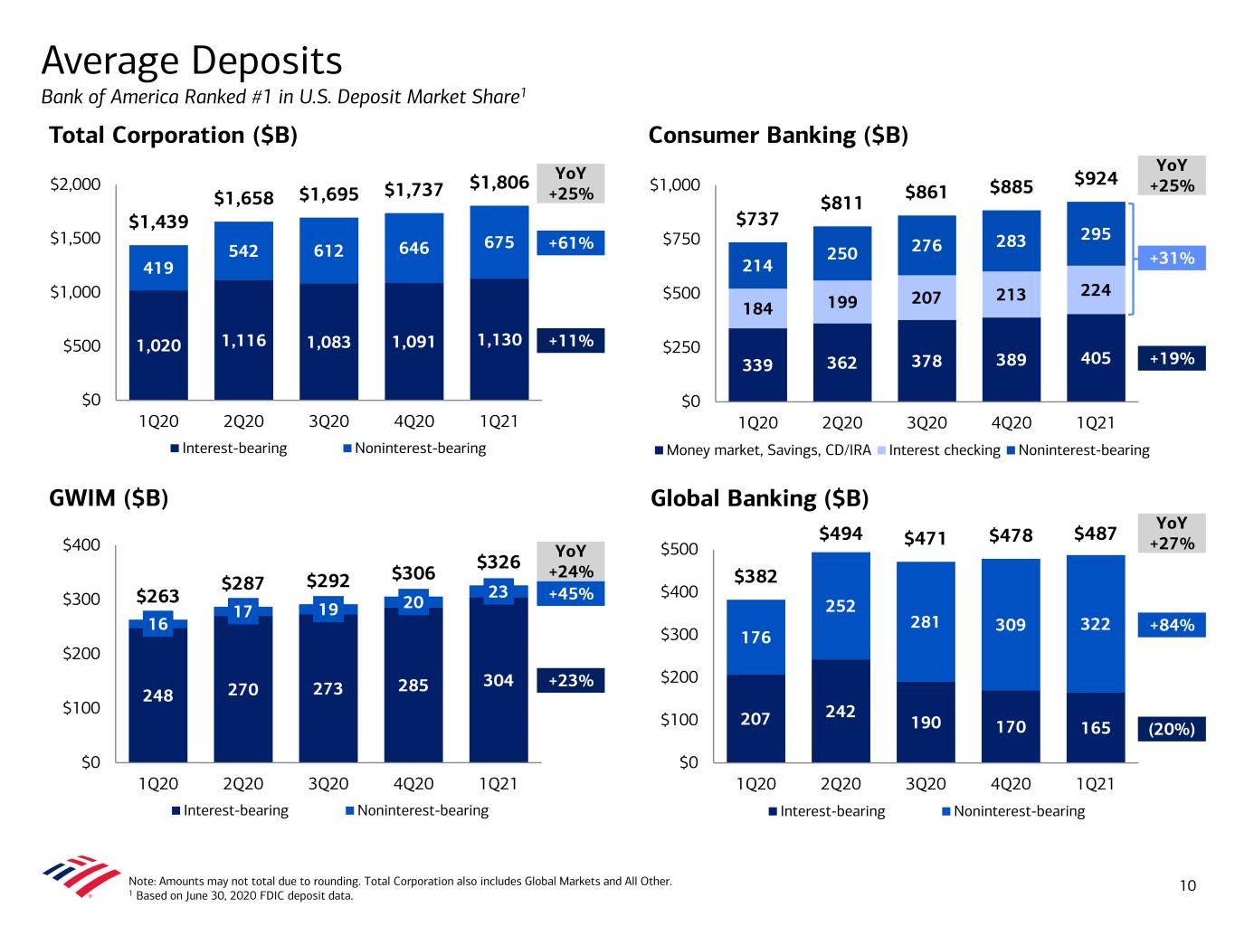 32 25 20 18 17 5 5 4 4 4 $37 $30 $24 $22 $21 $0 $10 $20 $30 $40 $50 1Q20 2Q20 3Q20 4Q20 1Q21 Residential mortgage Home equity $990 $1,031 $974 $935 $908 $0 $250 $500 $750 $1,000 $1,250 1Q20 2Q20 3Q20 4Q20 1Q21 Loans and Leases in Business Segments ($B) Total Loans and Leases ($B) Total Loans and Leases in All Other ($B) 317 322 319 305 291 179 182 186 187 188 386 424 373 346 330 72 74 72 74 77 $954 $1,001 $950 $913 $887 $0 $400 $800 $1,200 1Q20 2Q20 3Q20 4Q20 1Q21 Consumer Banking GWIM Global Banking Global Markets (8%) +6% (15%) +8% Average Loans and Leases1 YoY (8%) YoY (7%) Total Loans and Leases by Portfolio ($B) $465 $456 $446 $432 $418 $525 $575 $528 $502 $489 $0 $250 $500 $750 1Q20 2Q20 3Q20 4Q20 1Q21 Consumer loans Commercial loans YoY (43%) 9 Note: Amounts may not total due to rounding. 1 Includes balances related to PPP of $23.1B recorded in Consumer $13.9B, GWIM $0.7B and Global Banking $8.5B for 1Q21, balances of $24.5B recorded in Consumer $14.5B, GWIM $0.8B and Global Banking $9.2B for 4Q20, balances of $24.7B recorded in Consumer $14.5B, GWIM $0.8B and Global Banking $9.4B for 3Q20 and balances of $16.0B recorded in Consumer $9.2B, GWIM $0.5B and Global Banking $6.2B for 2Q20.
