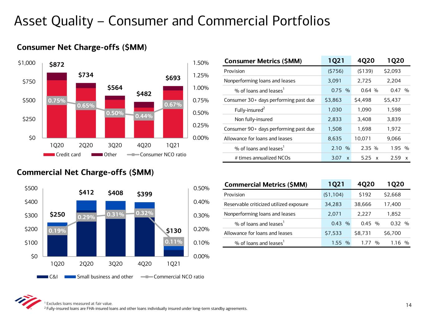 $1,122 $1,146 $972 $881 $823 0.46% 0.45% 0.40% 0.38% 0.37% 0.00% 0.25% 0.50% 0.75% 1.00% $0 $250 $500 $750 $1,000 $1,250 1Q20 2Q20 3Q20 4Q20 1Q21 Net charge-offs Net charge-off ratio $4,761 $5,117 $1,389 $53 ($1,860)($3,000) $0 $3,000 $6,000 1Q20 2Q20 3Q20 4Q20 1Q21 • Total net charge-offs of $823MM1 decreased $58MM from 4Q20 — Consumer net charge-offs of $693MM increased $211MM, driven by Card due to expired deferrals, but were $179MM lower than 1Q20 — Commercial net charge-offs of $130MM decreased $269MM • Net charge-off ratio of 37 bps decreased 1 bps from 4Q20 • Provision benefit of $1.9B included a $2.7B net reserve release reflecting an improved macroeconomic outlook and balance declines — Consumer reserve release of $1.4B, primarily driven by Card — Commercial reserve release of $1.2B — The reserve assessment continues to factor in the uncertainty resulting from the unprecedented nature of the current health crisis and risks that may prevent full recovery • Allowance for loan and lease losses of $16.2B represented 1.8% of total loans and leases1 — Total allowance of $18.0B includes $1.8B for unfunded commitments • Nonperforming loans (NPLs) increased $0.2B from 4Q20, driven by consumer real estate due to deferral activity — 51% of Consumer NPLs are contractually current • Commercial reservable criticized utilized exposure of $34.3B decreased $4.4B from 4Q20, driven by broad-based declines across industries — Approximately two-thirds of risk rating changes in 1Q21 were upgrades2 Net Charge-offs ($MM)1 Provision for Credit Losses ($MM) Asset Quality 13 1 Excludes loans measured at fair value. 2 Represents risk rating changes to pass and criticized committed exposures.