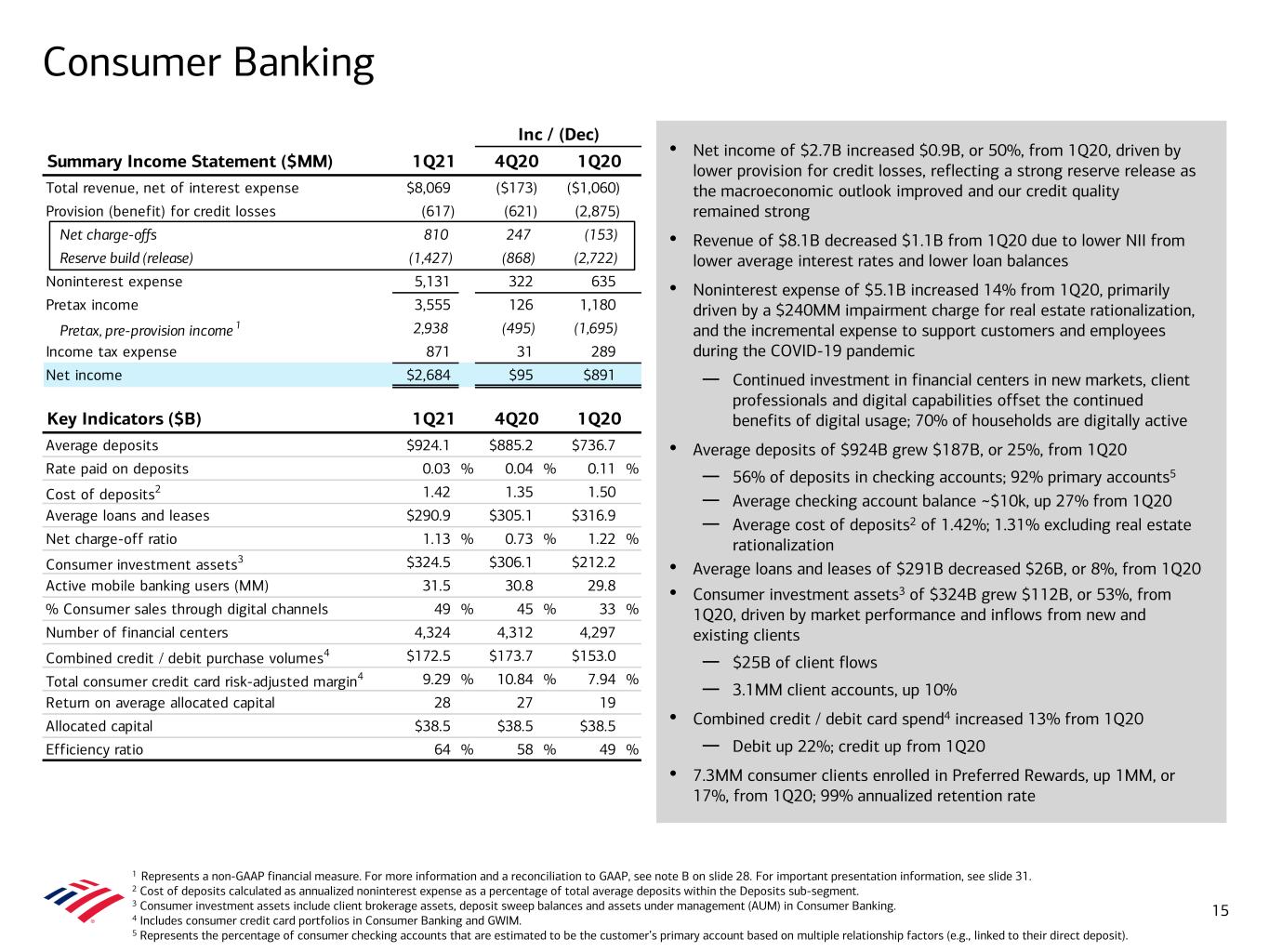 $872 $734 $564 $482 $693 0.75% 0.65% 0.50% 0.44% 0.67% 0.00% 0.25% 0.50% 0.75% 1.00% 1.25% 1.50% $0 $250 $500 $750 $1,000 1Q20 2Q20 3Q20 4Q20 1Q21 Credit card Other Consumer NCO ratio Commercial Net Charge-offs ($MM) $250 $412 $408 $399 $1300.19% 0.29% 0.31% 0.32% 0.11% 0.00% 0.10% 0.20% 0.30% 0.40% 0.50% $0 $100 $200 $300 $400 $500 1Q20 2Q20 3Q20 4Q20 1Q21 C&I Small business and other Commercial NCO ratio Consumer Net Charge-offs ($MM) Consumer Metrics ($MM) Provision ($756) ($139) $2,093 Nonperforming loans and leases 3,091 2,725 2,204 % of loans and leases1 0.75 % 0.64 % 0.47 % Consumer 30+ days performing past due $3,863 $4,498 $5,437 Fully-insured2 1,030 1,090 1,598 Non fully-insured 2,833 3,408 3,839 Consumer 90+ days performing past due 1,508 1,698 1,972 Allowance for loans and leases 8,635 10,071 9,066 % of loans and leases1 2.10 % 2.35 % 1.95 % # times annualized NCOs 3.07 x 5.25 x 2.59 x 1Q21 4Q20 1Q20 Commercial Metrics ($MM) Provision ($1,104) $192 $2,668 Reservable criticized utilized exposure 34,283 38,666 17,400 Nonperforming loans and leases 2,071 2,227 1,852 % of loans and leases1 0.43 % 0.45 % 0.32 % Allowance for loans and leases $7,533 $8,731 $6,700 % of loans and leases1 1.55 % 1.77 % 1.16 % 1Q21 4Q20 1Q20 Asset Quality – Consumer and Commercial Portfolios 14 1 Excludes loans measured at fair value. 2 Fully-insured loans are FHA-insured loans and other loans individually insured under long-term standby agreements.