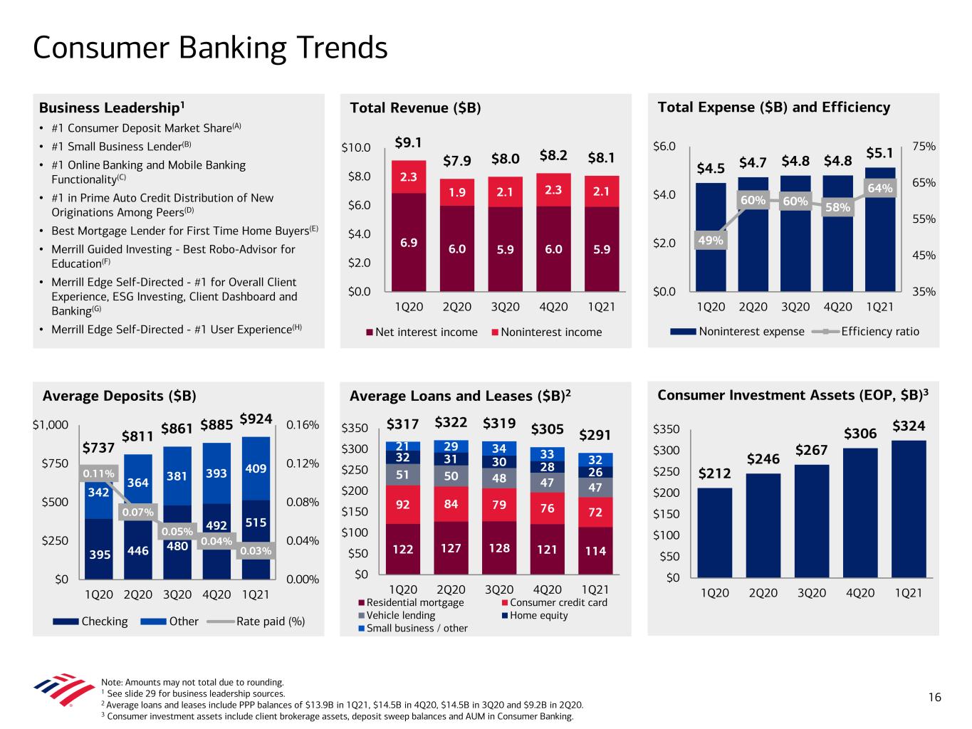 • Net income of $2.7B increased $0.9B, or 50%, from 1Q20, driven by lower provision for credit losses, reflecting a strong reserve release as the macroeconomic outlook improved and our credit quality remained strong • Revenue of $8.1B decreased $1.1B from 1Q20 due to lower NII from lower average interest rates and lower loan balances • Noninterest expense of $5.1B increased 14% from 1Q20, primarily driven by a $240MM impairment charge for real estate rationalization, and the incremental expense to support customers and employees during the COVID-19 pandemic — Continued investment in financial centers in new markets, client professionals and digital capabilities offset the continued benefits of digital usage; 70% of households are digitally active • Average deposits of $924B grew $187B, or 25%, from 1Q20 — 56% of deposits in checking accounts; 92% primary accounts5 — Average checking account balance ~$10k, up 27% from 1Q20 — Average cost of deposits2 of 1.42%; 1.31% excluding real estate rationalization • Average loans and leases of $291B decreased $26B, or 8%, from 1Q20 • Consumer investment assets3 of $324B grew $112B, or 53%, from 1Q20, driven by market performance and inflows from new and existing clients — $25B of client flows — 3.1MM client accounts, up 10% • Combined credit / debit card spend4 increased 13% from 1Q20 — Debit up 22%; credit up from 1Q20 • 7.3MM consumer clients enrolled in Preferred Rewards, up 1MM, or 17%, from 1Q20; 99% annualized retention rate Summary Income Statement ($MM) Total revenue, net of interest expense $8,069 ($173) ($1,060) Provision (benefit) for credit losses (617) (621) (2,875) Net charge-offs 810 247 (153) Reserve build (release) (1,427) (868) (2,722) Noninterest expense 5,131 322 635 Pretax income 3,555 126 1,180 Pretax, pre-provision income 1 2,938 (495) (1,695) Income tax expense 871 31 289 Net income $2,684 $95 $891 Key Indicators ($B) Average deposits $924.1 $885.2 $736.7 Rate paid on deposits 0.03 % 0.04 % 0.11 % Cost of deposits2 1.42 1.35 1.50 Average loans and leases $290.9 $305.1 $316.9 Net charge-off ratio 1.13 % 0.73 % 1.22 % Consumer investment assets3 $324.5 $306.1 $212.2 Active mobile banking users (MM) 31.5 30.8 29.8 % Consumer sales through digital channels 49 % 45 % 33 % Number of financial centers 4,324 4,312 4,297 Combined credit / debit purchase volumes4 $172.5 $173.7 $153.0 Total consumer credit card risk-adjusted margin4 9.29 % 10.84 % 7.94 % Return on average allocated capital 28 27 19 Allocated capital $38.5 $38.5 $38.5 Efficiency ratio 64 % 58 % 49 % Inc / (Dec) 1Q21 4Q20 1Q20 1Q21 4Q20 1Q20 Consumer Banking 15 1 Represents a non-GAAP financial measure. For more information and a reconciliation to GAAP, see note B on slide 28. For important presentation information, see slide 31. 2 Cost of deposits calculated as annualized noninterest expense as a percentage of total average deposits within the Deposits sub-segment. 3 Consumer investment assets include client brokerage assets, deposit sweep balances and assets under management (AUM) in Consumer Banking. 4 Includes consumer credit card portfolios in Consumer Banking and GWIM. 5 Represents the percentage of consumer checking accounts that are estimated to be the customer’s primary account based on multiple relationship factors (e.g., linked to their direct deposit).