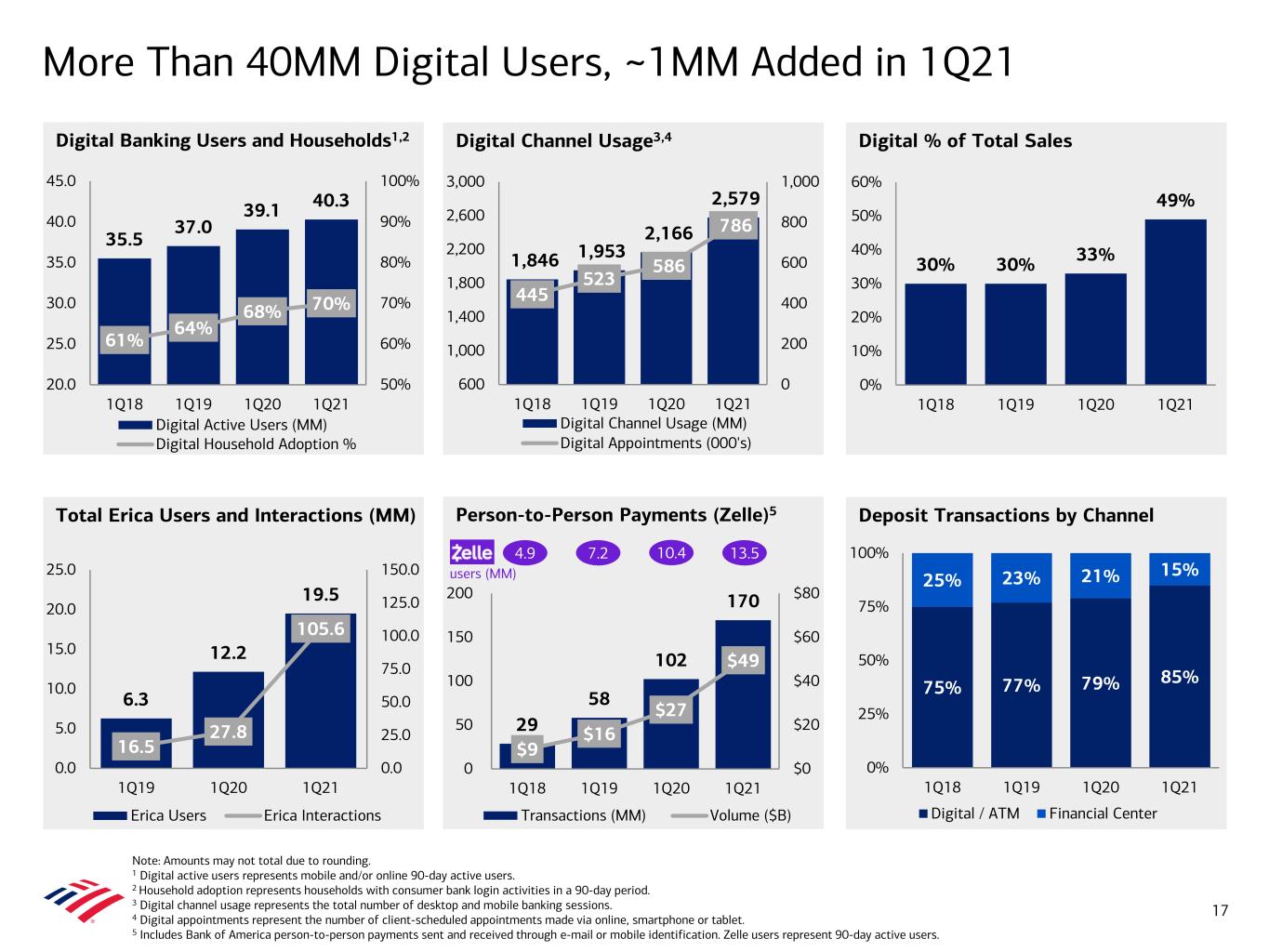 • Record 80% of Merrill Lynch households actively using online or mobile platforms across Merrill Lynch and Bank of America, up from 77% in 1Q20 • Record 40% of households now leveraging Merrill Lynch mobile, up 9 percentage points YoY — In 1Q21, record 37MM+ Merrill Lynch digital logins; mobile logins accounted for 50% of total logins, the highest percentage ever • Record digital engagement among Private Bank clients, with total 1Q21 online and mobile logins of 3MM, up 18% YoY — 1Q21 mobile logins across Private Bank and Bank of America apps reached 49% of total The Value of Digitally Engaged Wealth Management Relationships Record online and mobile adoption in 1Q21 • 315K forms signed in Merrill Lynch via eSignature process in 1Q21; 53% of eligible forms signed digitally • 50% of checks deposited through automated channels by Merrill Lynch clients; 73% by Private Bank clients • Record ~1.8MM messages exchanged through Secure Messaging in Merrill Lynch 1Q21, up 58% YoY • Record growth in key BofA feature usage among Private Bank Clients; Erica sessions +245% and Zelle Transactions +85% YoY • Record Private Bank client enrollment in eDelivery at 47%, up from 43% in 2020 Digital is the key channel for clients interactions • Launched end-to-end Digital Account Opening & Maintenance Experience for Merrill Lynch clients • Continued Digital Transformation in 2021: — Integrated Erica-based AI capabilities and Client Insights into Advisor Workstation — Evolving Personal Wealth Analysis: new, streamlined planning platform bringing in substantially higher net new money from clients and prospects that received a report since August 2020 • Digitizing manual processes executed within Merrill Lynch branch and Private Bank offices • Launched new Private Bank online experience with enhanced user interface, account views and simple access to holdings and activity • Launched My Financial Picture account aggregation capability for Private Bank clients with advisor-sharing option for holistic advice Continued modernization of tools and capabilities Four industry awards in the last 12 months for Technology Platform, Use of Technology and Digital Strategy Continued recognition 20
