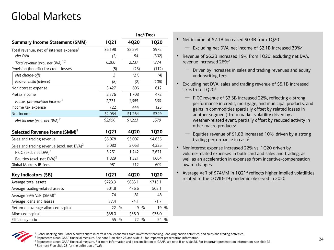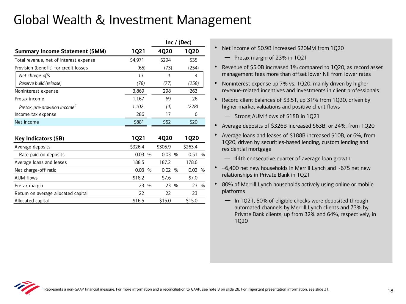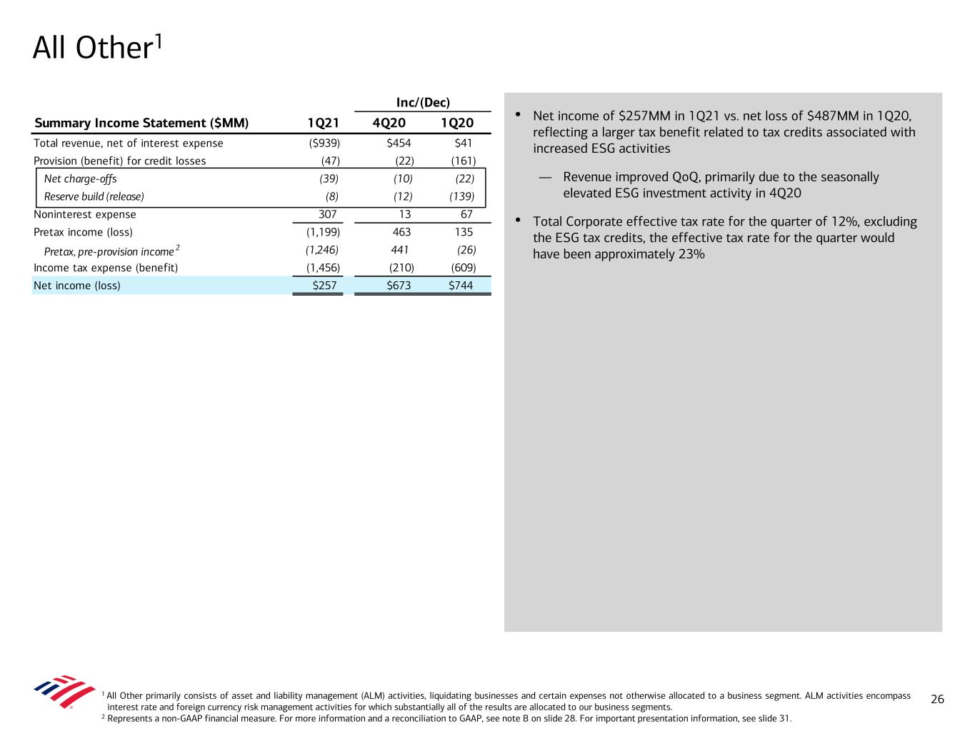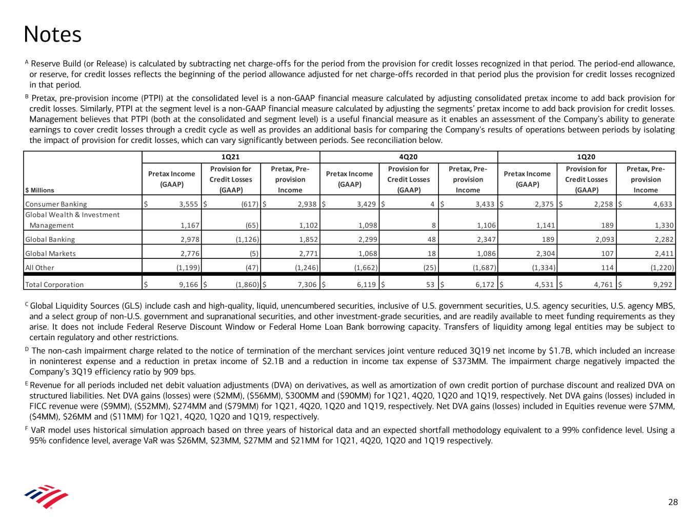 A Reserve Build (or Release) is calculated by subtracting net charge-offs for the period from the provision for credit losses recognized in that period. The period-end allowance, or reserve, for credit losses reflects the beginning of the period allowance adjusted for net charge-offs recorded in that period plus the provision for credit losses recognized in that period. B Pretax, pre-provision income (PTPI) at the consolidated level is a non-GAAP financial measure calculated by adjusting consolidated pretax income to add back provision for credit losses. Similarly, PTPI at the segment level is a non-GAAP financial measure calculated by adjusting the segments’ pretax income to add back provision for credit losses. Management believes that PTPI (both at the consolidated and segment level) is a useful financial measure as it enables an assessment of the Company’s ability to generate earnings to cover credit losses through a credit cycle as well as provides an additional basis for comparing the Company's results of operations between periods by isolating the impact of provision for credit losses, which can vary significantly between periods. See reconciliation below. C Global Liquidity Sources (GLS) include cash and high-quality, liquid, unencumbered securities, inclusive of U.S. government securities, U.S. agency securities, U.S. agency MBS, and a select group of non-U.S. government and supranational securities, and other investment-grade securities, and are readily available to meet funding requirements as they arise. It does not include Federal Reserve Discount Window or Federal Home Loan Bank borrowing capacity. Transfers of liquidity among legal entities may be subject to certain regulatory and other restrictions. D The non-cash impairment charge related to the notice of termination of the merchant services joint venture reduced 3Q19 net income by $1.7B, which included an increase in noninterest expense and a reduction in pretax income of $2.1B and a reduction in income tax expense of $373MM. The impairment charge negatively impacted the Company’s 3Q19 efficiency ratio by 909 bps. E Revenue for all periods included net debit valuation adjustments (DVA) on derivatives, as well as amortization of own credit portion of purchase discount and realized DVA on structured liabilities. Net DVA gains (losses) were ($2MM), ($56MM), $300MM and ($90MM) for 1Q21, 4Q20, 1Q20 and 1Q19, respectively. Net DVA gains (losses) included in FICC revenue were ($9MM), ($52MM), $274MM and ($79MM) for 1Q21, 4Q20, 1Q20 and 1Q19, respectively. Net DVA gains (losses) included in Equities revenue were $7MM, ($4MM), $26MM and ($11MM) for 1Q21, 4Q20, 1Q20 and 1Q19, respectively. F VaR model uses historical simulation approach based on three years of historical data and an expected shortfall methodology equivalent to a 99% confidence level. Using a 95% confidence level, average VaR was $26MM, $23MM, $27MM and $21MM for 1Q21, 4Q20, 1Q20 and 1Q19 respectively. Notes 28 Pretax Income (GAAP) Provision for Credit Losses (GAAP) Pretax, Pre- provision Income Pretax Income (GAAP) Provision for Credit Losses (GAAP) Pretax, Pre- provision Income Pretax Income (GAAP) Provision for Credit Losses (GAAP) Pretax, Pre- provision Income Consumer Banking $ 3,555 $ (617) $ 2,938 $ 3,429 $ 4 $ 3,433 $ 2,375 $ 2,258 $ 4,633 Global Wealth & Investment Management 1,167 (65) 1,102 1,098 8 1,106 1,141 189 1,330 Global Banking 2,978 (1,126) 1,852 2,299 48 2,347 189 2,093 2,282 Global Markets 2,776 (5) 2,771 1,068 18 1,086 2,304 107 2,411 All Other (1,199) (47) (1,246) (1,662) (25) (1,687) (1,334) 114 (1,220) Total Corporation $ 9,166 $ (1,860) $ 7,306 $ 6,119 $ 53 $ 6,172 $ 4,531 $ 4,761 $ 9,292 1Q20 $ Millions 1Q21 4Q20