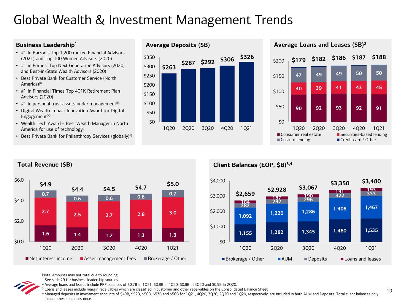Global Wealth & Investment Management Summary Income Statement ($MM) Total revenue, net of interest expense $4,971 $294 $35 Provision (benefit) for credit losses (65) (73) (254) Net charge-offs 13 4 4 Reserve build (release) (78) (77) (258) Noninterest expense 3,869 298 263 Pretax income 1,167 69 26 Pretax, pre-provision income 1 1,102 (4) (228) Income tax expense 286 17 6 Net income $881 $52 $20 Key Indicators ($B) Average deposits $326.4 $305.9 $263.4 Rate paid on deposits 0.03 % 0.03 % 0.51 % Average loans and leases 188.5 187.2 178.6 Net charge-off ratio 0.03 % 0.02 % 0.02 % AUM flows $18.2 $7.6 $7.0 Pretax margin 23 % 23 % 23 % Return on average allocated capital 22 22 23 Allocated capital $16.5 $15.0 $15.0 Inc / (Dec) 1Q21 4Q20 1Q20 1Q21 4Q20 1Q20 18 • Net income of $0.9B increased $20MM from 1Q20 — Pretax margin of 23% in 1Q21 • Revenue of $5.0B increased 1% compared to 1Q20, as record asset management fees more than offset lower NII from lower rates • Noninterest expense up 7% vs. 1Q20, mainly driven by higher revenue-related incentives and investments in client professionals • Record client balances of $3.5T, up 31% from 1Q20, driven by higher market valuations and positive client flows — Strong AUM flows of $18B in 1Q21 • Average deposits of $326B increased $63B, or 24%, from 1Q20 • Average loans and leases of $188B increased $10B, or 6%, from 1Q20, driven by securities-based lending, custom lending and residential mortgage — 44th consecutive quarter of average loan growth • ~6,400 net new households in Merrill Lynch and ~675 net new relationships in Private Bank in 1Q21 • 80% of Merrill Lynch households actively using online or mobile platforms — In 1Q21, 50% of eligible checks were deposited through automated channels by Merrill Lynch clients and 73% by Private Bank clients, up from 32% and 64%, respectively, in 1Q20 1 Represents a non-GAAP financial measure. For more information and a reconciliation to GAAP, see note B on slide 28. For important presentation information, see slide 31.