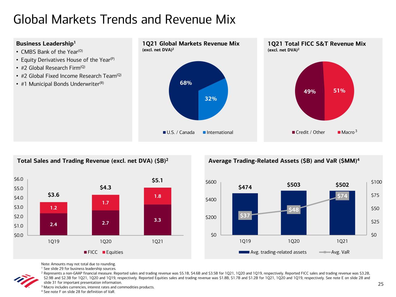 Summary Income Statement ($MM) Total revenue, net of interest expense1 $6,198 $2,291 $972 Net DVA (2) 54 (302) Total revenue (excl. net DVA) 1,2 6,200 2,237 1,274 Provision (benefit) for credit losses (5) (23) (112) Net charge-offs 3 (21) (4) Reserve build (release) (8) (2) (108) Noninterest expense 3,427 606 612 Pretax income 2,776 1,708 472 Pretax, pre-provision income 3 2,771 1,685 360 Income tax expense 722 444 123 Net income $2,054 $1,264 $349 Net income (excl. net DVA) 2 $2,056 $1,223 $579 Selected Revenue Items ($MM)1 Sales and trading revenue $5,078 $3,007 $4,635 Sales and trading revenue (excl. net DVA)2 5,080 3,063 4,335 FICC (excl. net DVA)2 3,251 1,742 2,671 Equities (excl. net DVA)2 1,829 1,321 1,664 Global Markets IB fees 981 712 602 Key Indicators ($B) Average total assets $723.3 $683.1 $713.1 Average trading-related assets 501.8 476.6 503.1 Average 99% VaR ($MM)4 74 81 48 Average loans and leases 77.4 74.1 71.7 Return on average allocated capital 22 % 9 % 19 % Allocated capital $38.0 $36.0 $36.0 Efficiency ratio 55 % 72 % 54 % Inc/(Dec) 1Q21 4Q20 1Q20 1Q21 4Q20 1Q20 1Q21 4Q20 1Q20 Global Markets 24 • Net income of $2.1B increased $0.3B from 1Q20 — Excluding net DVA, net income of $2.1B increased 39%2 • Revenue of $6.2B increased 19% from 1Q20; excluding net DVA, revenue increased 26%2 — Driven by increases in sales and trading revenues and equity underwriting fees • Excluding net DVA, sales and trading revenue of $5.1B increased 17% from 1Q202 — FICC revenue of $3.3B increased 22%, reflecting a strong performance in credit, mortgage, and municipal products, and gains in commodities (partially offset by related losses in another segment) from market volatility driven by a weather-related event, partially offset by reduced activity in other macro products2 — Equities revenue of $1.8B increased 10%, driven by a strong trading performance in cash2 • Noninterest expense increased 22% vs. 1Q20 driven by volume-related expenses in both card and sales and trading, as well as an acceleration in expenses from incentive-compensation award changes • Average VaR of $74MM in 1Q214 reflects higher implied volatilities related to the COVID-19 pandemic observed in 2020 1 Global Banking and Global Markets share in certain deal economics from investment banking, loan origination activities, and sales and trading activities. 2 Represents a non-GAAP financial measure. See note E on slide 28 and slide 31 for important presentation information. 3 Represents a non-GAAP financial measure. For more information and a reconciliation to GAAP, see note B on slide 28. For important presentation information, see slide 31. 4 See note F on slide 28 for the definition of VaR.
