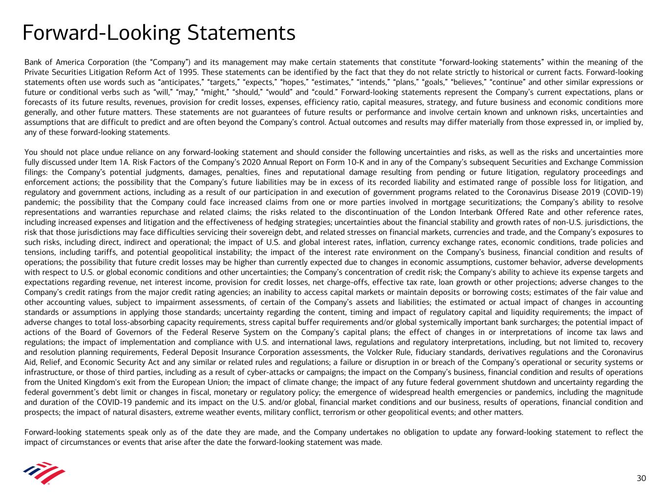 Forward-Looking Statements Bank of America Corporation (the “Company”) and its management may make certain statements that constitute “forward-looking statements” within the meaning of the Private Securities Litigation Reform Act of 1995. These statements can be identified by the fact that they do not relate strictly to historical or current facts. Forward-looking statements often use words such as “anticipates,” “targets,” “expects,” “hopes,” “estimates,” “intends,” “plans,” “goals,” “believes,” “continue” and other similar expressions or future or conditional verbs such as “will,” “may,” “might,” “should,” “would” and “could.” Forward-looking statements represent the Company’s current expectations, plans or forecasts of its future results, revenues, provision for credit losses, expenses, efficiency ratio, capital measures, strategy, and future business and economic conditions more generally, and other future matters. These statements are not guarantees of future results or performance and involve certain known and unknown risks, uncertainties and assumptions that are difficult to predict and are often beyond the Company’s control. Actual outcomes and results may differ materially from those expressed in, or implied by, any of these forward-looking statements. You should not place undue reliance on any forward-looking statement and should consider the following uncertainties and risks, as well as the risks and uncertainties more fully discussed under Item 1A. Risk Factors of the Company’s 2020 Annual Report on Form 10-K and in any of the Company’s subsequent Securities and Exchange Commission filings: the Company’s potential judgments, damages, penalties, fines and reputational damage resulting from pending or future litigation, regulatory proceedings and enforcement actions; the possibility that the Company’s future liabilities may be in excess of its recorded liability and estimated range of possible loss for litigation, and regulatory and government actions, including as a result of our participation in and execution of government programs related to the Coronavirus Disease 2019 (COVID-19) pandemic; the possibility that the Company could face increased claims from one or more parties involved in mortgage securitizations; the Company’s ability to resolve representations and warranties repurchase and related claims; the risks related to the discontinuation of the London Interbank Offered Rate and other reference rates, including increased expenses and litigation and the effectiveness of hedging strategies; uncertainties about the financial stability and growth rates of non-U.S. jurisdictions, the risk that those jurisdictions may face difficulties servicing their sovereign debt, and related stresses on financial markets, currencies and trade, and the Company’s exposures to such risks, including direct, indirect and operational; the impact of U.S. and global interest rates, inflation, currency exchange rates, economic conditions, trade policies and tensions, including tariffs, and potential geopolitical instability; the impact of the interest rate environment on the Company’s business, financial condition and results of operations; the possibility that future credit losses may be higher than currently expected due to changes in economic assumptions, customer behavior, adverse developments with respect to U.S. or global economic conditions and other uncertainties; the Company’s concentration of credit risk; the Company's ability to achieve its expense targets and expectations regarding revenue, net interest income, provision for credit losses, net charge-offs, effective tax rate, loan growth or other projections; adverse changes to the Company’s credit ratings from the major credit rating agencies; an inability to access capital markets or maintain deposits or borrowing costs; estimates of the fair value and other accounting values, subject to impairment assessments, of certain of the Company’s assets and liabilities; the estimated or actual impact of changes in accounting standards or assumptions in applying those standards; uncertainty regarding the content, timing and impact of regulatory capital and liquidity requirements; the impact of adverse changes to total loss-absorbing capacity requirements, stress capital buffer requirements and/or global systemically important bank surcharges; the potential impact of actions of the Board of Governors of the Federal Reserve System on the Company’s capital plans; the effect of changes in or interpretations of income tax laws and regulations; the impact of implementation and compliance with U.S. and international laws, regulations and regulatory interpretations, including, but not limited to, recovery and resolution planning requirements, Federal Deposit Insurance Corporation assessments, the Volcker Rule, fiduciary standards, derivatives regulations and the Coronavirus Aid, Relief, and Economic Security Act and any similar or related rules and regulations; a failure or disruption in or breach of the Company’s operational or security systems or infrastructure, or those of third parties, including as a result of cyber-attacks or campaigns; the impact on the Company’s business, financial condition and results of operations from the United Kingdom's exit from the European Union; the impact of climate change; the impact of any future federal government shutdown and uncertainty regarding the federal government’s debt limit or changes in fiscal, monetary or regulatory policy; the emergence of widespread health emergencies or pandemics, including the magnitude and duration of the COVID-19 pandemic and its impact on the U.S. and/or global, financial market conditions and our business, results of operations, financial condition and prospects; the impact of natural disasters, extreme weather events, military conflict, terrorism or other geopolitical ev