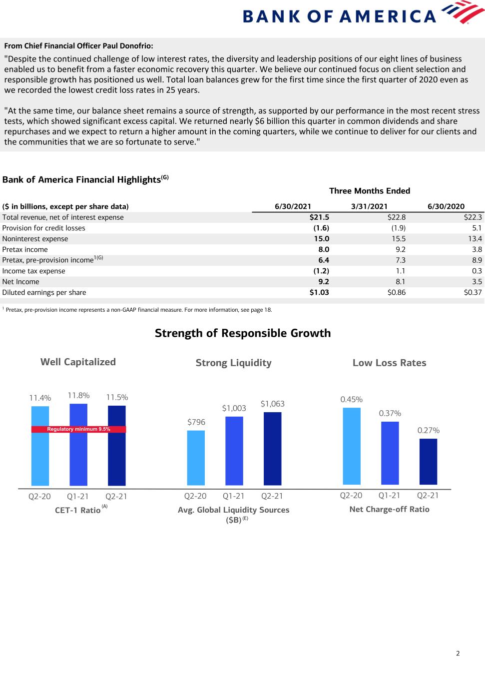 2 Bank of America Financial Highlights(G) Three Months Ended ($ in billions, except per share data) 6/30/2021 3/31/2021 6/30/2020 Total revenue, net of interest expense $21.5 $22.8 $22.3 Provision for credit losses (1.6) (1.9) 5.1 Noninterest expense 15.0 15.5 13.4 Pretax income 8.0 9.2 3.8 Pretax, pre-provision income1(G) 6.4 7.3 8.9 Income tax expense (1.2) 1.1 0.3 Net Income 9.2 8.1 3.5 Diluted earnings per share $1.03 $0.86 $0.37 1 Pretax, pre-provision income represents a non-GAAP financial measure. For more information, see page 18. From Chief Financial Officer Paul Donofrio: "Despite the continued challenge of low interest rates, the diversity and leadership positions of our eight lines of business enabled us to benefit from a faster economic recovery this quarter. We believe our continued focus on client selection and responsible growth has positioned us well. Total loan balances grew for the first time since the first quarter of 2020 even as we recorded the lowest credit loss rates in 25 years. "At the same time, our balance sheet remains a source of strength, as supported by our performance in the most recent stress tests, which showed significant excess capital. We returned nearly $6 billion this quarter in common dividends and share repurchases and we expect to return a higher amount in the coming quarters, while we continue to deliver for our clients and the communities that we are so fortunate to serve." CET-1 Ratio Well Capitalized 11.4% 11.8% 11.5% Q2-20 Q1-21 Q2-21 Avg. Global Liquidity Sources ($B) Strong Liquidity $796 $1,003 $1,063 Q2-20 Q1-21 Q2-21 Net Charge-off Ratio Low Loss Rates 0.45% 0.37% 0.27% Q2-20 Q1-21 Q2-21 Strength of Responsible Growth (A) (E) Regulatory minimum 9.5%