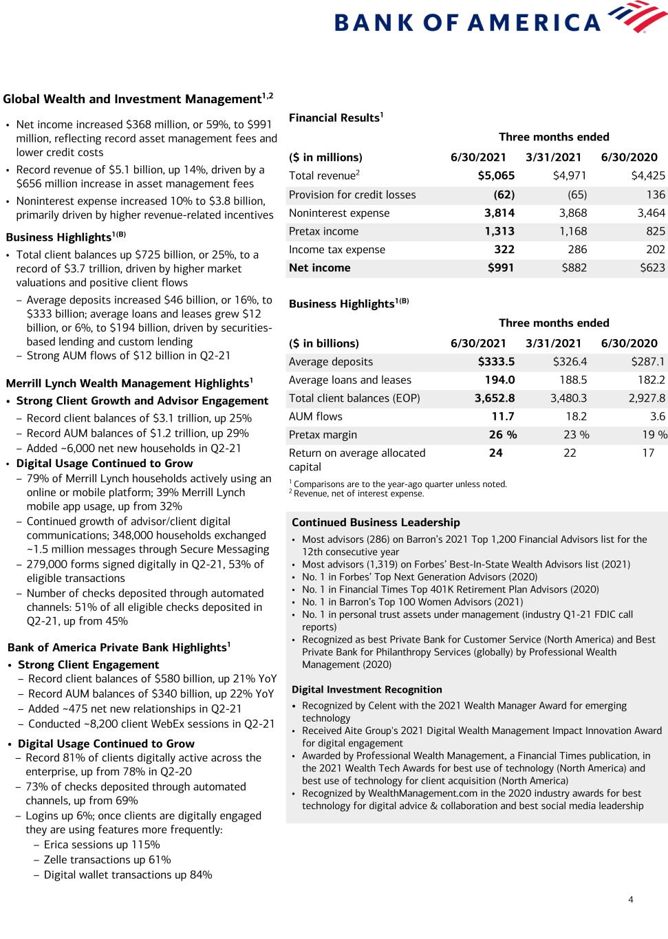 3 Consumer Banking1,2 Financial Results1 Three months ended ($ in millions) 6/30/2021 3/31/2021 6/30/2020 Total revenue2 $8,186 $8,069 $7,852 Provision for credit losses (697) (617) 3,024 Noninterest expense 4,859 5,131 4,735 Pretax income 4,024 3,555 93 Income tax expense 986 871 23 Net income $3,038 $2,684 $70 Business Highlights1,3(B) Three months ended ($ in billions) 6/30/2021 3/31/2021 6/30/2020 Average deposits $979.1 $924.1 $810.7 Average loans and leases 281.8 290.9 321.6 Consumer investment assets (EOP) 345.8 324.5 246.1 Active mobile banking users (MM) 31.8 31.5 30.3 Number of financial centers 4,296 4,324 4,298 Efficiency ratio 59 % 64 % 60 % Return on average allocated capital 32 28 1 Total Consumer Credit Card3 Average credit card outstanding balances $73.4 $74.2 $86.2 Total credit/debit spend 200.3 172.5 143.3 Risk-adjusted margin 9.8 % 9.3 % 8.5 % 1 Comparisons are to the year-ago quarter unless noted. 2 Revenue, net of interest expense. 3 The Consumer credit card portfolio includes Consumer Banking and GWIM. • Net income increased to $3.0 billion, reflecting higher revenue and lower credit costs • Revenue of $8.2 billion increased 4%, driven by increased card income and higher deposit balances • Provision for credit losses improved $3.7 billion to a benefit of $697 million, reflecting an improved macroeconomic outlook – Net charge-off ratio improved to 0.89%, compared to 1.05% • Noninterest expense increased 3% to $4.9 billion, as lower COVID-19 costs were more than offset by investments for business growth Business Highlights1,3(B) • Average deposits grew $168 billion, or 21%, to $979 billion; average loans declined $40 billion, or 12%, to $282 billion, driven by lower first mortgage and card balances • Consumer investment assets grew $100 billion, or 40%, to $346 billion, driven by market performance and strong client flows – $21 billion of client flows since Q2-20 – 3.2 million client accounts, up 9% • Combined credit/debit card spend up $57 billion, or 40%; credit card up 46% and debit card up 36% • 7.5 million Consumer clients enrolled in Preferred Rewards, up 14%, with 99% annualized retention rate Digital Usage Continued to Grow1 • 40.5 million active digital banking users, up 3% • 1.4 million digital sales, up 26% • 2.6 billion digital logins • 14.3 million active Zelle® users, now including small businesses, sent and received 189 million transfers worth $56.5 billion, up 62% and 76% YoY, respectively • Clients booked a record ~871,000 digital appointments with an associate Continued Business Leadership • No. 1 in customer satisfaction for U.S. Online(A) Banking among National Banks by J.D. Power(B) • No. 1 in customer satisfaction for U.S. Mobile Banking Apps among National Banks by J.D. Power(B) • No. 1 in customer satisfaction for U.S. Retail Banking Advice by J.D. Power (2021) • No. 1 Consumer Deposit Market Share (Estimated retail consumer deposits based on June 30, 2020 FDIC deposit data) • No. 1 Online Banking and Mobile Banking Functionality (Keynova Q2-21 Online Banker Scorecard, Keynova Q1-21 Mobile Banker Scorecard, Javelin 2021 Online and Mobile Banking Scorecards) • No. 1 in Prime Auto Credit Distribution of New Originations Among Peers (Experian AutoCount; Franchised Dealers; largest percentage of 680+ Vantage 3.0 loan originations among key competitors as of April 2021) • Best Mortgage Lender for First Time Homebuyers (Nerdwallet, 2021) • Merrill Edge Self-Directed - No. 1 for Overall Client Experience, ESG Investing, Client Dashboard and Banking (StockBrokers.com, January 2021) (A) Tied in the national segment of the J.D. Power 2021 U.S. Online Banking Satisfaction Study (B) J.D. Power’s 2021 U.S. Banking Mobile App Satisfaction, U.S. Online Banking Satisfaction studies measure overall satisfaction with banking digital channels based on four factors: navigation; speed; visual appeal; and information/content. The studies are based on responses from 9,926 retail bank customers nationwide and were fielded in March-April 2021. For J.D. Power award information, visit jdpower.com/awards.