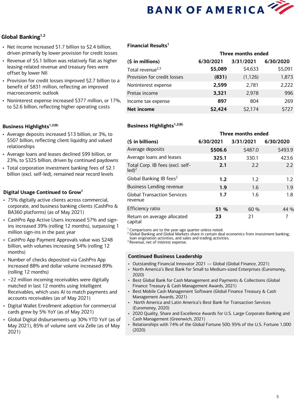 4 Global Wealth and Investment Management1,2 Financial Results1 Three months ended ($ in millions) 6/30/2021 3/31/2021 6/30/2020 Total revenue2 $5,065 $4,971 $4,425 Provision for credit losses (62) (65) 136 Noninterest expense 3,814 3,868 3,464 Pretax income 1,313 1,168 825 Income tax expense 322 286 202 Net income $991 $882 $623 Business Highlights1(B) Three months ended ($ in billions) 6/30/2021 3/31/2021 6/30/2020 Average deposits $333.5 $326.4 $287.1 Average loans and leases 194.0 188.5 182.2 Total client balances (EOP) 3,652.8 3,480.3 2,927.8 AUM flows 11.7 18.2 3.6 Pretax margin 26 % 23 % 19 % Return on average allocated capital 24 22 17 1 Comparisons are to the year-ago quarter unless noted. 2 Revenue, net of interest expense. Continued Business Leadership • Most advisors (286) on Barron’s 2021 Top 1,200 Financial Advisors list for the 12th consecutive year • Most advisors (1,319) on Forbes’ Best-In-State Wealth Advisors list (2021) • No. 1 in Forbes’ Top Next Generation Advisors (2020) • No. 1 in Financial Times Top 401K Retirement Plan Advisors (2020) • No. 1 in Barron’s Top 100 Women Advisors (2021) • No. 1 in personal trust assets under management (industry Q1-21 FDIC call reports) • Recognized as best Private Bank for Customer Service (North America) and Best Private Bank for Philanthropy Services (globally) by Professional Wealth Management (2020) Digital Investment Recognition • Recognized by Celent with the 2021 Wealth Manager Award for emerging technology • Received Aite Group's 2021 Digital Wealth Management Impact Innovation Award for digital engagement • Awarded by Professional Wealth Management, a Financial Times publication, in the 2021 Wealth Tech Awards for best use of technology (North America) and best use of technology for client acquisition (North America) • Recognized by WealthManagement.com in the 2020 industry awards for best technology for digital advice & collaboration and best social media leadership • Net income increased $368 million, or 59%, to $991 million, reflecting record asset management fees and lower credit costs • Record revenue of $5.1 billion, up 14%, driven by a $656 million increase in asset management fees • Noninterest expense increased 10% to $3.8 billion, primarily driven by higher revenue-related incentives Business Highlights1(B) • Total client balances up $725 billion, or 25%, to a record of $3.7 trillion, driven by higher market valuations and positive client flows – Average deposits increased $46 billion, or 16%, to $333 billion; average loans and leases grew $12 billion, or 6%, to $194 billion, driven by securities- based lending and custom lending – Strong AUM flows of $12 billion in Q2-21 Merrill Lynch Wealth Management Highlights1 • Strong Client Growth and Advisor Engagement – Record client balances of $3.1 trillion, up 25% – Record AUM balances of $1.2 trillion, up 29% – Added ~6,000 net new households in Q2-21 • Digital Usage Continued to Grow – 79% of Merrill Lynch households actively using an online or mobile platform; 39% Merrill Lynch mobile app usage, up from 32% – Continued growth of advisor/client digital communications; 348,000 households exchanged ~1.5 million messages through Secure Messaging – 279,000 forms signed digitally in Q2-21, 53% of eligible transactions – Number of checks deposited through automated channels: 51% of all eligible checks deposited in Q2-21, up from 45% • Strong Client Engagement – Record client balances of $580 billion, up 21% YoY – Record AUM balances of $340 billion, up 22% YoY – Added ~475 net new relationships in Q2-21 – Conducted ~8,200 client WebEx sessions in Q2-21 Bank of America Private Bank Highlights1 • Digital Usage Continued to Grow – Record 81% of clients digitally active across the enterprise, up from 78% in Q2-20 – 73% of checks deposited through automated channels, up from 69% – Logins up 6%; once clients are digitally engaged they are using features more frequently: – Erica sessions up 115% – Zelle transactions up 61% – Digital wallet transactions up 84%