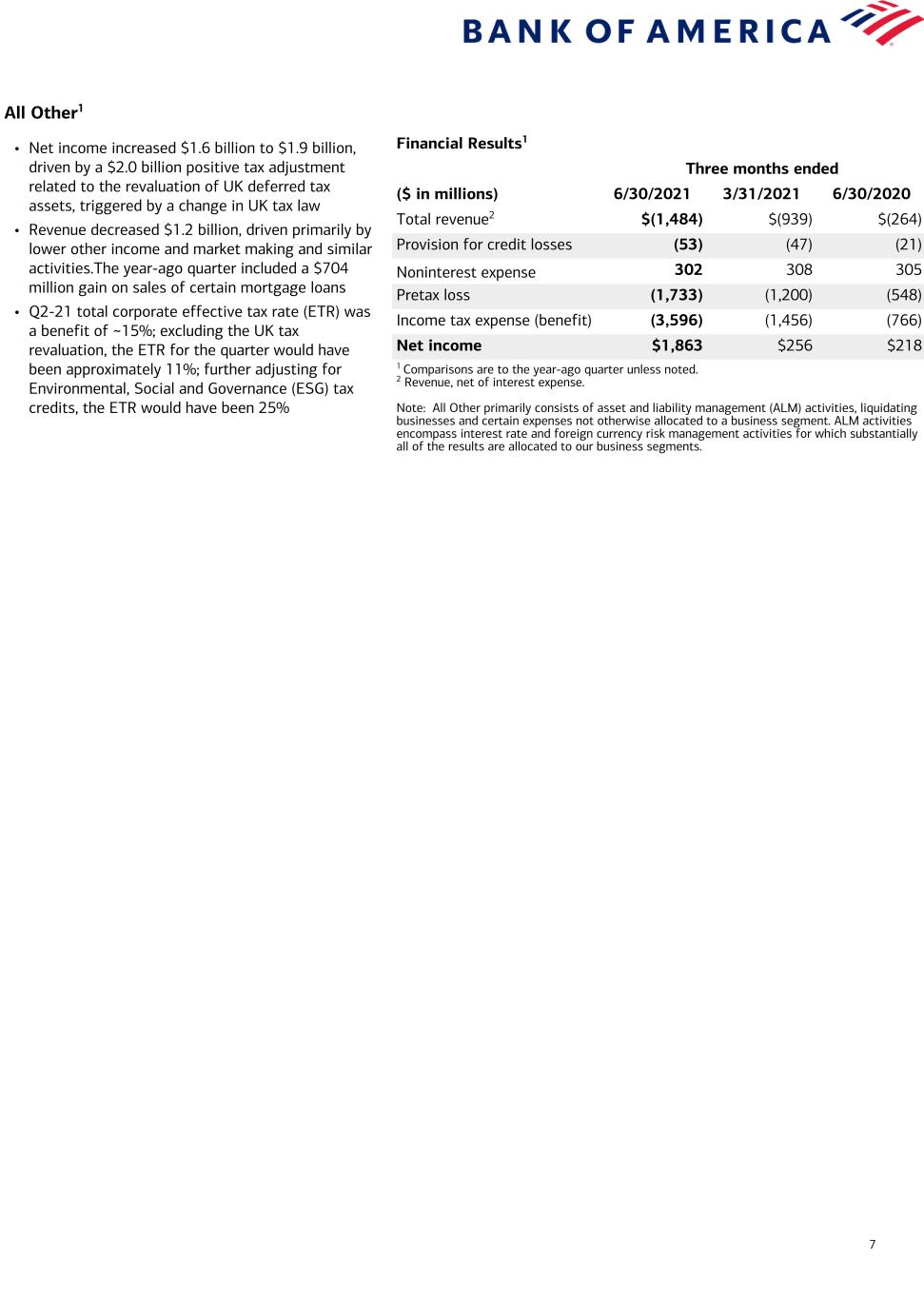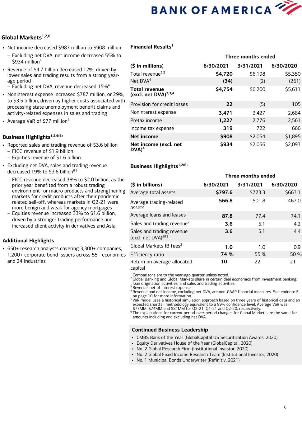 6 Global Markets1,2,6 Financial Results1 Three months ended ($ in millions) 6/30/2021 3/31/2021 6/30/2020 Total revenue2,3 $4,720 $6,198 $5,350 Net DVA4 (34) (2) (261) Total revenue (excl. net DVA)2,3,4 $4,754 $6,200 $5,611 Provision for credit losses 22 (5) 105 Noninterest expense 3,471 3,427 2,684 Pretax income 1,227 2,776 2,561 Income tax expense 319 722 666 Net income $908 $2,054 $1,895 Net income (excl. net DVA)4 $934 $2,056 $2,093 Business Highlights1,2(B) Three months ended ($ in billions) 6/30/2021 3/31/2021 6/30/2020 Average total assets $797.6 $723.3 $663.1 Average trading-related assets 566.8 501.8 467.0 Average loans and leases 87.8 77.4 74.1 Sales and trading revenue2 3.6 5.1 4.2 Sales and trading revenue (excl. net DVA)2(F) 3.6 5.1 4.4 Global Markets IB fees2 1.0 1.0 0.9 Efficiency ratio 74 % 55 % 50 % Return on average allocated capital 10 22 21 1 Comparisons are to the year-ago quarter unless noted. 2 Global Banking and Global Markets share in certain deal economics from investment banking, loan origination activities, and sales and trading activities. 3 Revenue, net of interest expense. 4 Revenue and net income, excluding net DVA, are non-GAAP financial measures. See endnote F on page 10 for more information. 5 VaR model uses a historical simulation approach based on three years of historical data and an expected shortfall methodology equivalent to a 99% confidence level. Average VaR was $77MM, $74MM and $81MM for Q2-21, Q1-21 and Q2-20, respectively. 6 The explanations for current period-over-period changes for Global Markets are the same for amounts including and excluding net DVA. • Net income decreased $987 million to $908 million – Excluding net DVA, net income decreased 55% to $934 million4 • Revenue of $4.7 billion decreased 12%, driven by lower sales and trading results from a strong year- ago period – Excluding net DVA, revenue decreased 15%4 • Noninterest expense increased $787 million, or 29%, to $3.5 billion, driven by higher costs associated with processing state unemployment benefit claims and activity-related expenses in sales and trading • Average VaR of $77 million5 Business Highlights1,2,6(B) • Reported sales and trading revenue of $3.6 billion – FICC revenue of $1.9 billion – Equities revenue of $1.6 billion • Excluding net DVA, sales and trading revenue decreased 19% to $3.6 billion(F) – FICC revenue decreased 38% to $2.0 billion, as the prior year benefited from a robust trading environment for macro products and strengthening markets for credit products after their pandemic related sell-off, whereas markets in Q2-21 were more benign and weak for agency mortgages – Equities revenue increased 33% to $1.6 billion, driven by a stronger trading performance and increased client activity in derivatives and Asia Continued Business Leadership • CMBS Bank of the Year (GlobalCapital US Securitization Awards, 2020) • Equity Derivatives House of the Year (GlobalCapital, 2020) • No. 2 Global Research Firm (Institutional Investor, 2020) • No. 2 Global Fixed Income Research Team (Institutional Investor, 2020) • No. 1 Municipal Bonds Underwriter (Refinitiv, 2021) Additional Highlights • 650+ research analysts covering 3,300+ companies, 1,200+ corporate bond issuers across 55+ economies and 24 industries