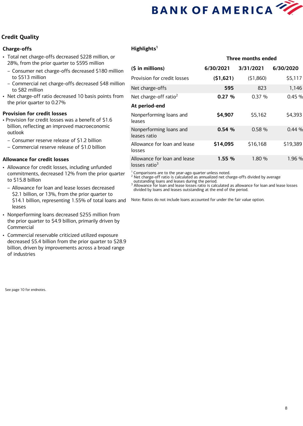 8 Credit Quality Highlights1 Three months ended ($ in millions) 6/30/2021 3/31/2021 6/30/2020 Provision for credit losses ($1,621) ($1,860) $5,117 Net charge-offs 595 823 1,146 Net charge-off ratio2 0.27 % 0.37 % 0.45 % At period-end Nonperforming loans and leases $4,907 $5,162 $4,393 Nonperforming loans and leases ratio 0.54 % 0.58 % 0.44 % Allowance for loan and lease losses $14,095 $16,168 $19,389 Allowance for loan and lease losses ratio3 1.55 % 1.80 % 1.96 % 1 Comparisons are to the year-ago quarter unless noted. 2 Net charge-off ratio is calculated as annualized net charge-offs divided by average outstanding loans and leases during the period. 3 Allowance for loan and lease losses ratio is calculated as allowance for loan and lease losses divided by loans and leases outstanding at the end of the period. Note: Ratios do not include loans accounted for under the fair value option. Charge-offs • Total net charge-offs decreased $228 million, or 28%, from the prior quarter to $595 million – Consumer net charge-offs decreased $180 million to $513 million – Commercial net charge-offs decreased $48 million to $82 million • Net charge-off ratio decreased 10 basis points from the prior quarter to 0.27% Provision for credit losses • Provision for credit losses was a benefit of $1.6 billion, reflecting an improved macroeconomic outlook – Consumer reserve release of $1.2 billion – Commercial reserve release of $1.0 billion Allowance for credit losses • Allowance for credit losses, including unfunded commitments, decreased 12% from the prior quarter to $15.8 billion – Allowance for loan and lease losses decreased $2.1 billion, or 13%, from the prior quarter to $14.1 billion, representing 1.55% of total loans and leases • Nonperforming loans decreased $255 million from the prior quarter to $4.9 billion, primarily driven by Commercial • Commercial reservable criticized utilized exposure decreased $5.4 billion from the prior quarter to $28.9 billion, driven by improvements across a broad range of industries See page 10 for endnotes.