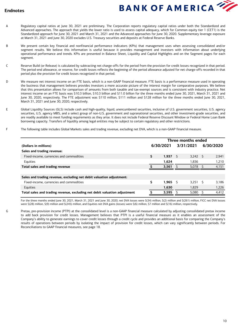 10 A Regulatory capital ratios at June 30, 2021 are preliminary. The Corporation reports regulatory capital ratios under both the Standardized and Advanced approaches. The approach that yields the lower ratio is used to assess capital adequacy, which for Common equity tier 1 (CET1) is the Standardized approach for June 30, 2021 and March 31, 2021 and the Advanced approaches for June 30, 2020. Supplementary leverage exposure at March 31, 2021 and June 30, 2020 excludes U.S. Treasury securities and deposits at Federal Reserve Banks. B We present certain key financial and nonfinancial performance indicators (KPIs) that management uses when assessing consolidated and/or segment results. We believe this information is useful because it provides management and investors with information about underlying operational performance and trends. KPIs are presented in Balance Sheet, Liquidity and Capital Highlights and on the Segment pages for each segment. C Reserve Build (or Release) is calculated by subtracting net charge-offs for the period from the provision for credit losses recognized in that period. The period-end allowance, or reserve, for credit losses reflects the beginning of the period allowance adjusted for net charge-offs recorded in that period plus the provision for credit losses recognized in that period. D We measure net interest income on an FTE basis, which is a non-GAAP financial measure. FTE basis is a performance measure used in operating the business that management believes provides investors a more accurate picture of the interest margin for comparative purposes. We believe that this presentation allows for comparison of amounts from both taxable and tax-exempt sources and is consistent with industry practice. Net interest income on an FTE basis was $10.3 billion, $10.3 billion and $11.0 billion for the three months ended June 30, 2021, March 31, 2021 and June 30, 2020, respectively. The FTE adjustment was $110 million, $111 million and $128 million for the three months ended June 30, 2021, March 31, 2021 and June 30, 2020, respectively. E Global Liquidity Sources (GLS) include cash and high-quality, liquid, unencumbered securities, inclusive of U.S. government securities, U.S. agency securities, U.S. agency MBS, and a select group of non-U.S. government and supranational securities, and other investment-grade securities, and are readily available to meet funding requirements as they arise. It does not include Federal Reserve Discount Window or Federal Home Loan Bank borrowing capacity. Transfers of liquidity among legal entities may be subject to certain regulatory and other restrictions. F The following table includes Global Markets sales and trading revenue, excluding net DVA, which is a non-GAAP financial measure. For the three months ended June 30, 2021, March 31, 2021 and June 30, 2020, net DVA losses were $(34) million, $(2) million and $(261) million, FICC net DVA losses were $(28) million, $(9) million and $(245) million, and Equities net DVA gains (losses) were $(6) million, $7 million and $(16) million, respectively. G Pretax, pre-provision income (PTPI) at the consolidated level is a non-GAAP financial measure calculated by adjusting consolidated pretax income to add back provision for credit losses. Management believes that PTPI is a useful financial measure as it enables an assessment of the Company’s ability to generate earnings to cover credit losses through a credit cycle and provides an additional basis for comparing the Company's results of operations between periods by isolating the impact of provision for credit losses, which can vary significantly between periods. For Reconciliations to GAAP financial measures, see page 18. Endnotes Three months ended (Dollars in millions) 6/30/2021 3/31/2021 6/30/2020 Sales and trading revenue: Fixed-income, currencies and commodities $ 1,937 $ 3,242 $ 2,941 Equities 1,624 1,836 1,210 Total sales and trading revenue $ 3,561 $ 5,078 $ 4,151 Sales and trading revenue, excluding net debit valuation adjustment: Fixed-income, currencies and commodities $ 1,965 $ 3,251 $ 3,186 Equities 1,630 1,829 1,226 Total sales and trading revenue, excluding net debit valuation adjustment $ 3,595 $ 5,080 $ 4,412