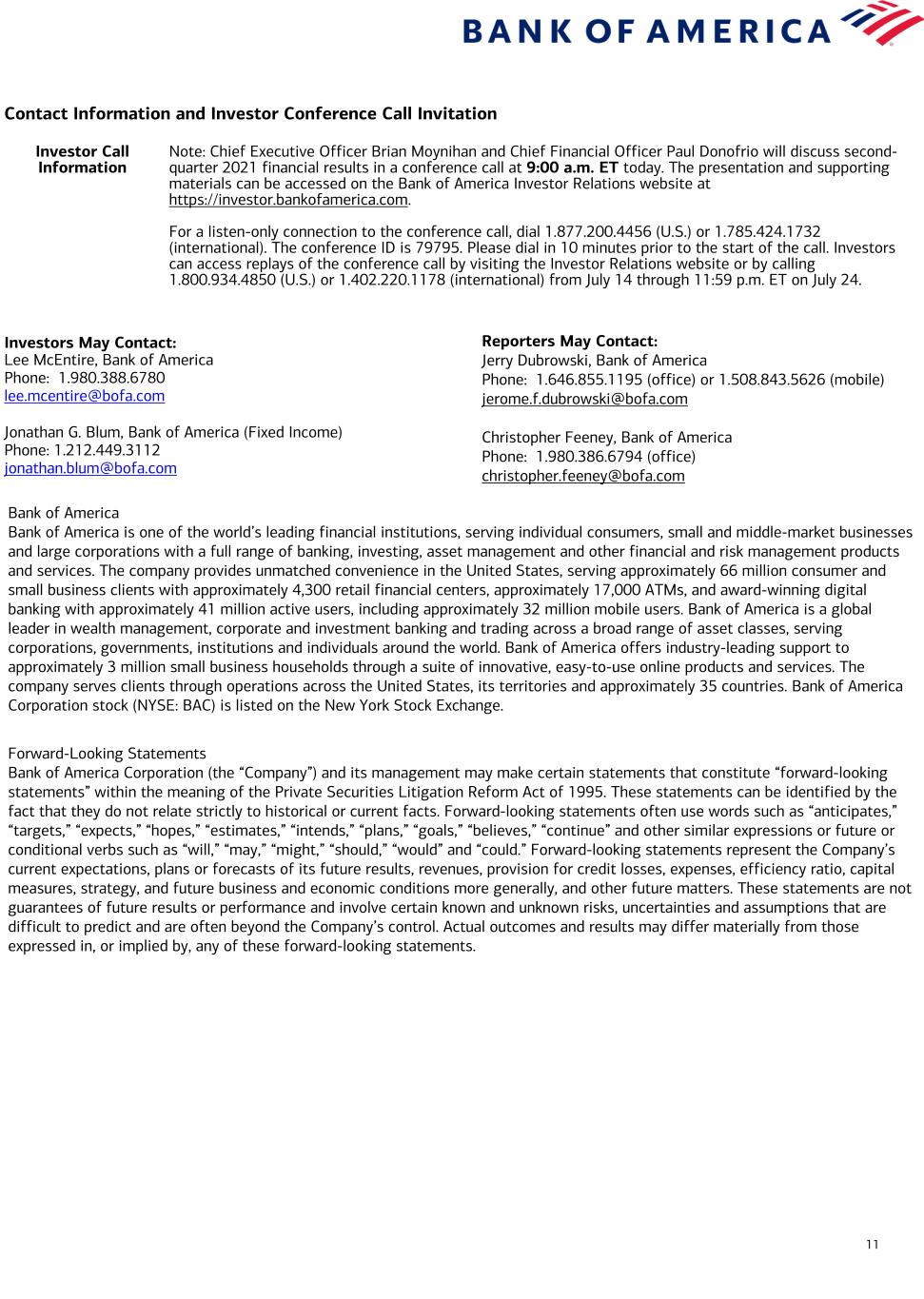 11 Contact Information and Investor Conference Call Invitation Investor Call Information Note: Chief Executive Officer Brian Moynihan and Chief Financial Officer Paul Donofrio will discuss second- quarter 2021 financial results in a conference call at 9:00 a.m. ET today. The presentation and supporting materials can be accessed on the Bank of America Investor Relations website at https://investor.bankofamerica.com. For a listen-only connection to the conference call, dial 1.877.200.4456 (U.S.) or 1.785.424.1732 (international). The conference ID is 79795. Please dial in 10 minutes prior to the start of the call. Investors can access replays of the conference call by visiting the Investor Relations website or by calling 1.800.934.4850 (U.S.) or 1.402.220.1178 (international) from July 14 through 11:59 p.m. ET on July 24. Investors May Contact: Lee McEntire, Bank of America Phone: 1.980.388.6780 lee.mcentire@bofa.com Jonathan G. Blum, Bank of America (Fixed Income) Phone: 1.212.449.3112 jonathan.blum@bofa.com Bank of America Bank of America is one of the world’s leading financial institutions, serving individual consumers, small and middle-market businesses and large corporations with a full range of banking, investing, asset management and other financial and risk management products and services. The company provides unmatched convenience in the United States, serving approximately 66 million consumer and small business clients with approximately 4,300 retail financial centers, approximately 17,000 ATMs, and award-winning digital banking with approximately 41 million active users, including approximately 32 million mobile users. Bank of America is a global leader in wealth management, corporate and investment banking and trading across a broad range of asset classes, serving corporations, governments, institutions and individuals around the world. Bank of America offers industry-leading support to approximately 3 million small business households through a suite of innovative, easy-to-use online products and services. The company serves clients through operations across the United States, its territories and approximately 35 countries. Bank of America Corporation stock (NYSE: BAC) is listed on the New York Stock Exchange. Forward-Looking Statements Bank of America Corporation (the “Company”) and its management may make certain statements that constitute “forward-looking statements” within the meaning of the Private Securities Litigation Reform Act of 1995. These statements can be identified by the fact that they do not relate strictly to historical or current facts. Forward-looking statements often use words such as “anticipates,” “targets,” “expects,” “hopes,” “estimates,” “intends,” “plans,” “goals,” “believes,” “continue” and other similar expressions or future or conditional verbs such as “will,” “may,” “might,” “should,” “would” and “could.” Forward-looking statements represent the Company’s current expectations, plans or forecasts of its future results, revenues, provision for credit losses, expenses, efficiency ratio, capital measures, strategy, and future business and economic conditions more generally, and other future matters. These statements are not guarantees of future results or performance and involve certain known and unknown risks, uncertainties and assumptions that are difficult to predict and are often beyond the Company’s control. Actual outcomes and results may differ materially from those expressed in, or implied by, any of these forward-looking statements. Reporters May Contact: Jerry Dubrowski, Bank of America Phone: 1.646.855.1195 (office) or 1.508.843.5626 (mobile) jerome.f.dubrowski@bofa.com Christopher Feeney, Bank of America Phone: 1.980.386.6794 (office) christopher.feeney@bofa.com