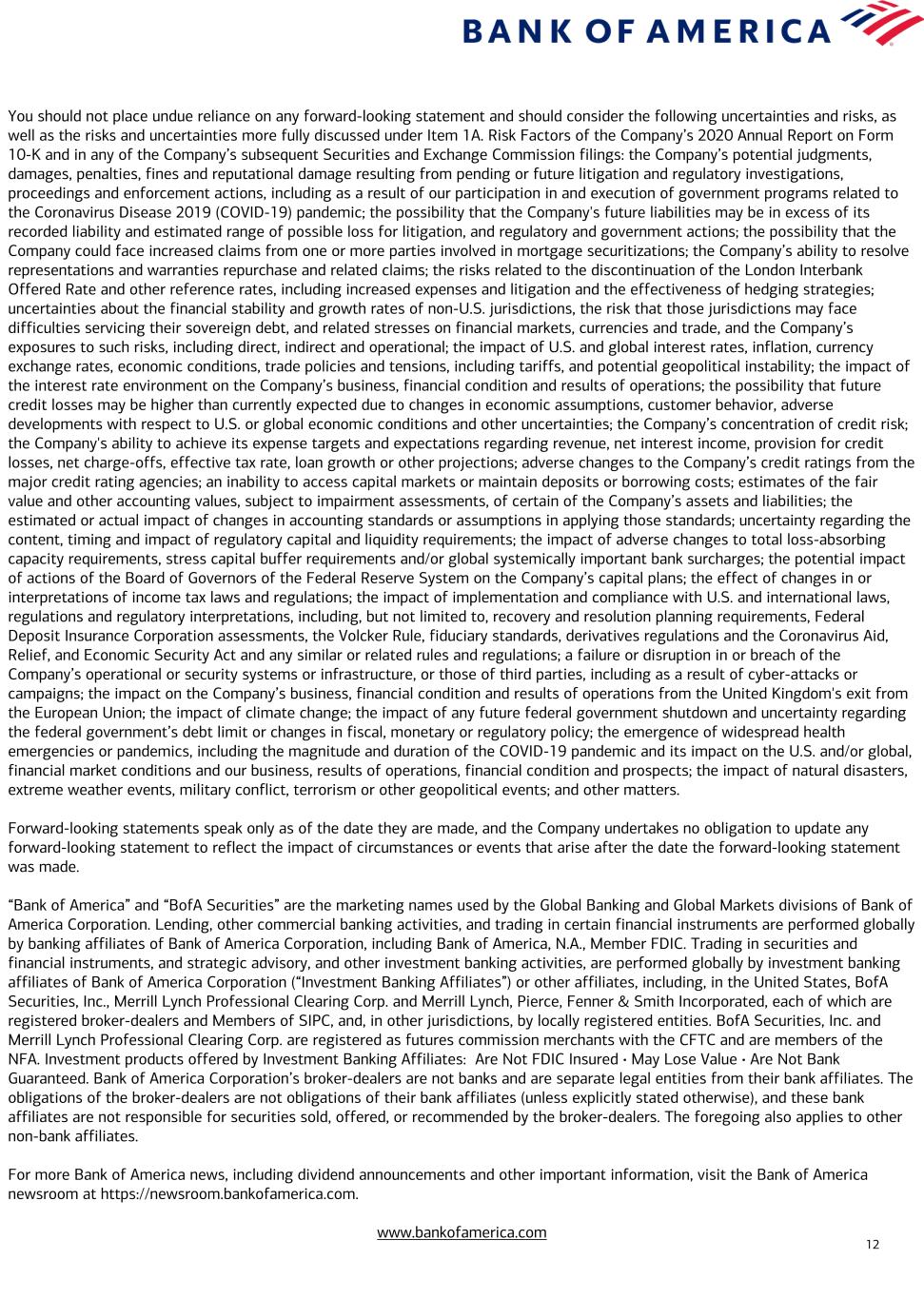 12 You should not place undue reliance on any forward-looking statement and should consider the following uncertainties and risks, as well as the risks and uncertainties more fully discussed under Item 1A. Risk Factors of the Company’s 2020 Annual Report on Form 10-K and in any of the Company’s subsequent Securities and Exchange Commission filings: the Company’s potential judgments, damages, penalties, fines and reputational damage resulting from pending or future litigation and regulatory investigations, proceedings and enforcement actions, including as a result of our participation in and execution of government programs related to the Coronavirus Disease 2019 (COVID-19) pandemic; the possibility that the Company's future liabilities may be in excess of its recorded liability and estimated range of possible loss for litigation, and regulatory and government actions; the possibility that the Company could face increased claims from one or more parties involved in mortgage securitizations; the Company’s ability to resolve representations and warranties repurchase and related claims; the risks related to the discontinuation of the London Interbank Offered Rate and other reference rates, including increased expenses and litigation and the effectiveness of hedging strategies; uncertainties about the financial stability and growth rates of non-U.S. jurisdictions, the risk that those jurisdictions may face difficulties servicing their sovereign debt, and related stresses on financial markets, currencies and trade, and the Company’s exposures to such risks, including direct, indirect and operational; the impact of U.S. and global interest rates, inflation, currency exchange rates, economic conditions, trade policies and tensions, including tariffs, and potential geopolitical instability; the impact of the interest rate environment on the Company’s business, financial condition and results of operations; the possibility that future credit losses may be higher than currently expected due to changes in economic assumptions, customer behavior, adverse developments with respect to U.S. or global economic conditions and other uncertainties; the Company’s concentration of credit risk; the Company's ability to achieve its expense targets and expectations regarding revenue, net interest income, provision for credit losses, net charge-offs, effective tax rate, loan growth or other projections; adverse changes to the Company’s credit ratings from the major credit rating agencies; an inability to access capital markets or maintain deposits or borrowing costs; estimates of the fair value and other accounting values, subject to impairment assessments, of certain of the Company’s assets and liabilities; the estimated or actual impact of changes in accounting standards or assumptions in applying those standards; uncertainty regarding the content, timing and impact of regulatory capital and liquidity requirements; the impact of adverse changes to total loss-absorbing capacity requirements, stress capital buffer requirements and/or global systemically important bank surcharges; the potential impact of actions of the Board of Governors of the Federal Reserve System on the Company’s capital plans; the effect of changes in or interpretations of income tax laws and regulations; the impact of implementation and compliance with U.S. and international laws, regulations and regulatory interpretations, including, but not limited to, recovery and resolution planning requirements, Federal Deposit Insurance Corporation assessments, the Volcker Rule, fiduciary standards, derivatives regulations and the Coronavirus Aid, Relief, and Economic Security Act and any similar or related rules and regulations; a failure or disruption in or breach of the Company’s operational or security systems or infrastructure, or those of third parties, including as a result of cyber-attacks or campaigns; the impact on the Company’s business, financial condition and results of operations from the United Kingdom's exit from the European Union; the impact of climate change; the impact of any future federal government shutdown and uncertainty regarding the federal government’s debt limit or changes in fiscal, monetary or regulatory policy; the emergence of widespread health emergencies or pandemics, including the magnitude and duration of the COVID-19 pandemic and its impact on the U.S. and/or global, financial market conditions and our business, results of operations, financial condition and prospects; the impact of natural disasters, extreme weather events, military conflict, terrorism or other geopolitical events; and other matters. Forward-looking statements speak only as of the date they are made, and the Company undertakes no obligation to update any forward-looking statement to reflect the impact of circumstances or events that arise after the date the forward-looking statement was made. “Bank of America” and “BofA Securities” are the marketing names used by the Global Banking and Global Markets divisions of Bank of America Corporation. Lending, other commercial banking activities, and trading in certain financial instruments are performed globally by banking affiliates of Bank of America Corporation, including Bank of America, N.A., Member FDIC. Trading in securities and financial instruments, and strategic advisory, and other investment banking activities, are performed globally by investment banking affiliates of Bank of America Corporation (“Investment Banking Affiliates”) or other affiliates, including, in the United States, BofA Securities, Inc., Merrill Lynch Professional Clearing Corp. and Merrill Lynch, Pierce, Fenner & Smith Incorporated, each of which are registered broker-dealers and Members of SIPC, and, in other jurisdictions, by locally registered entities. BofA Securities, Inc. and Merrill Lynch Professional Clearing Corp. are registered as futures commission merchants with the CFTC and ar