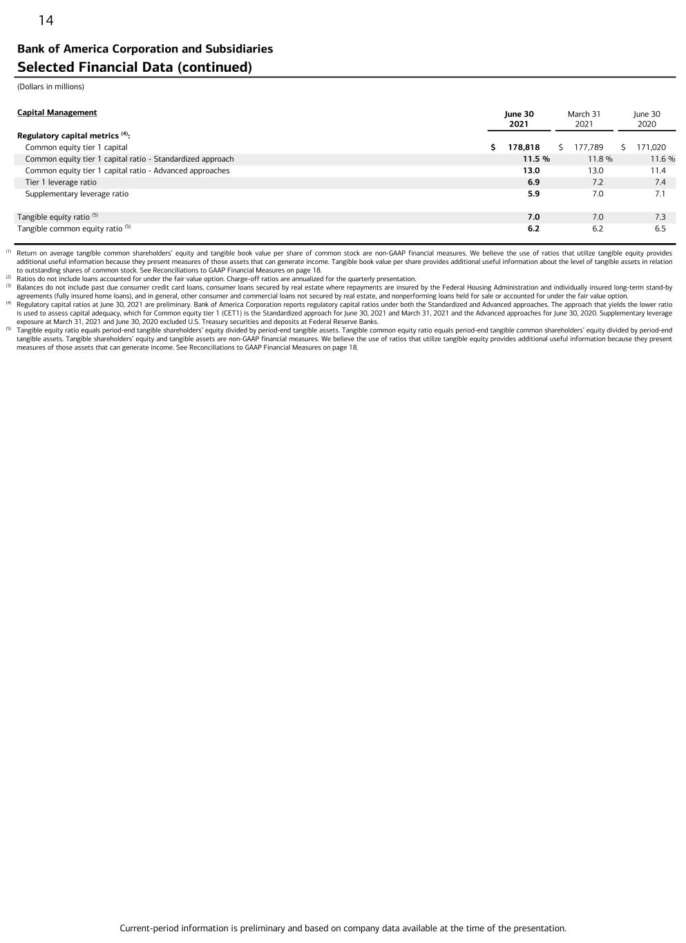 Current-period information is preliminary and based on company data available at the time of the presentation. 14 Bank of America Corporation and Subsidiaries Selected Financial Data (continued) (Dollars in millions) Capital Management June 30 2021 March 31 2021 June 30 2020 Regulatory capital metrics (4): Common equity tier 1 capital $ 178,818 $ 177,789 $ 171,020 Common equity tier 1 capital ratio - Standardized approach 11.5 % 11.8 % 11.6 % Common equity tier 1 capital ratio - Advanced approaches 13.0 13.0 11.4 Tier 1 leverage ratio 6.9 7.2 7.4 Supplementary leverage ratio 5.9 7.0 7.1 Tangible equity ratio (5) 7.0 7.0 7.3 Tangible common equity ratio (5) 6.2 6.2 6.5 (1) Return on average tangible common shareholders’ equity and tangible book value per share of common stock are non-GAAP financial measures. We believe the use of ratios that utilize tangible equity provides additional useful information because they present measures of those assets that can generate income. Tangible book value per share provides additional useful information about the level of tangible assets in relation to outstanding shares of common stock. See Reconciliations to GAAP Financial Measures on page 18. (2) Ratios do not include loans accounted for under the fair value option. Charge-off ratios are annualized for the quarterly presentation. (3) Balances do not include past due consumer credit card loans, consumer loans secured by real estate where repayments are insured by the Federal Housing Administration and individually insured long-term stand-by agreements (fully insured home loans), and in general, other consumer and commercial loans not secured by real estate, and nonperforming loans held for sale or accounted for under the fair value option. (4) Regulatory capital ratios at June 30, 2021 are preliminary. Bank of America Corporation reports regulatory capital ratios under both the Standardized and Advanced approaches. The approach that yields the lower ratio is used to assess capital adequacy, which for Common equity tier 1 (CET1) is the Standardized approach for June 30, 2021 and March 31, 2021 and the Advanced approaches for June 30, 2020. Supplementary leverage exposure at March 31, 2021 and June 30, 2020 excluded U.S. Treasury securities and deposits at Federal Reserve Banks. (5) Tangible equity ratio equals period-end tangible shareholders’ equity divided by period-end tangible assets. Tangible common equity ratio equals period-end tangible common shareholders’ equity divided by period-end tangible assets. Tangible shareholders’ equity and tangible assets are non-GAAP financial measures. We believe the use of ratios that utilize tangible equity provides additional useful information because they present measures of those assets that can generate income. See Reconciliations to GAAP Financial Measures on page 18.