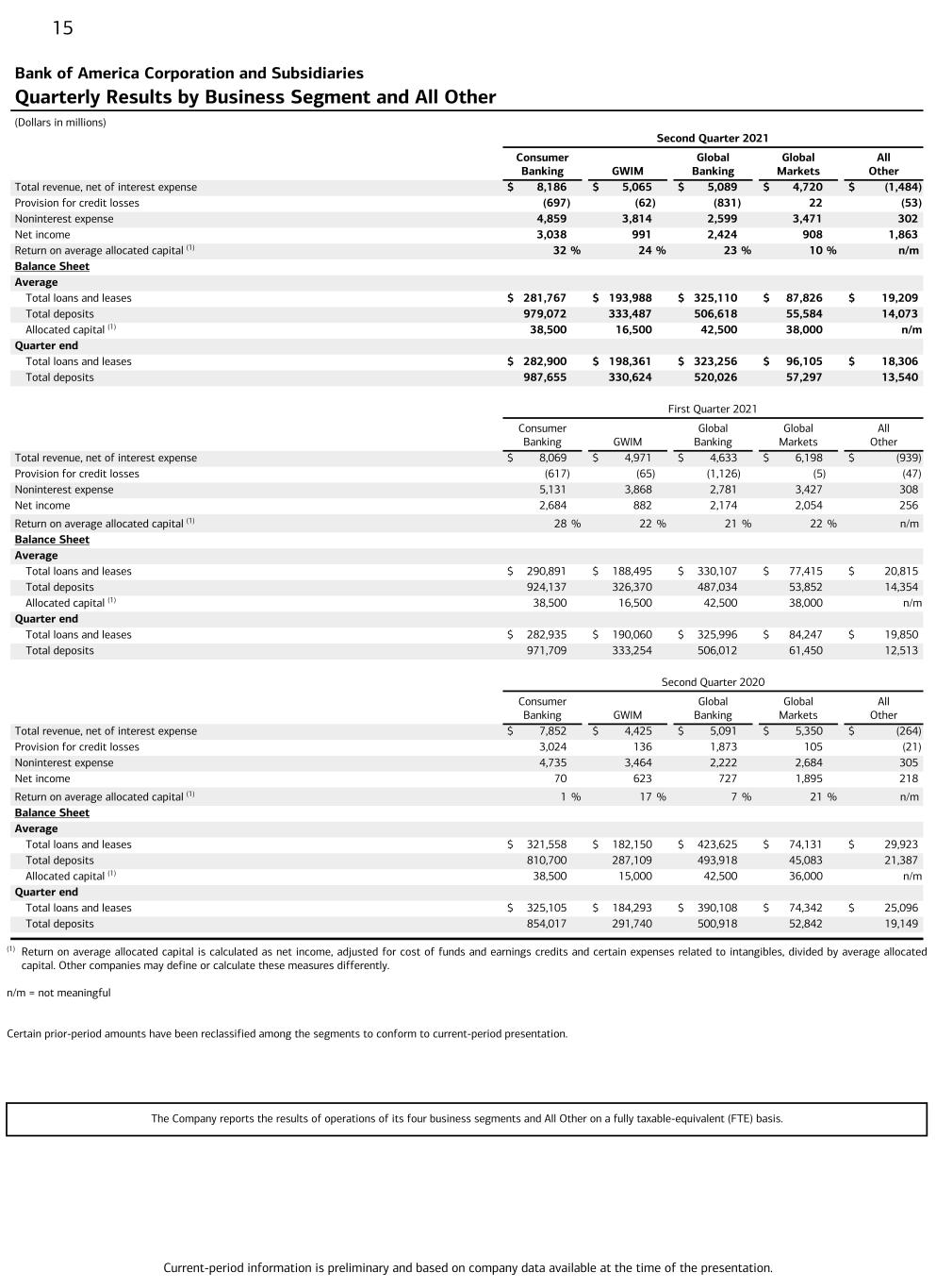 Current-period information is preliminary and based on company data available at the time of the presentation. 15 Bank of America Corporation and Subsidiaries Quarterly Results by Business Segment and All Other (Dollars in millions) Second Quarter 2021 Consumer Banking GWIM Global Banking Global Markets All Other Total revenue, net of interest expense $ 8,186 $ 5,065 $ 5,089 $ 4,720 $ (1,484) Provision for credit losses (697) (62) (831) 22 (53) Noninterest expense 4,859 3,814 2,599 3,471 302 Net income 3,038 991 2,424 908 1,863 Return on average allocated capital (1) 32 % 24 % 23 % 10 % n/m Balance Sheet Average Total loans and leases $ 281,767 $ 193,988 $ 325,110 $ 87,826 $ 19,209 Total deposits 979,072 333,487 506,618 55,584 14,073 Allocated capital (1) 38,500 16,500 42,500 38,000 n/m Quarter end Total loans and leases $ 282,900 $ 198,361 $ 323,256 $ 96,105 $ 18,306 Total deposits 987,655 330,624 520,026 57,297 13,540 First Quarter 2021 Consumer Banking GWIM Global Banking Global Markets All Other Total revenue, net of interest expense $ 8,069 $ 4,971 $ 4,633 $ 6,198 $ (939) Provision for credit losses (617) (65) (1,126) (5) (47) Noninterest expense 5,131 3,868 2,781 3,427 308 Net income 2,684 882 2,174 2,054 256 Return on average allocated capital (1) 28 % 22 % 21 % 22 % n/m Balance Sheet Average Total loans and leases $ 290,891 $ 188,495 $ 330,107 $ 77,415 $ 20,815 Total deposits 924,137 326,370 487,034 53,852 14,354 Allocated capital (1) 38,500 16,500 42,500 38,000 n/m Quarter end Total loans and leases $ 282,935 $ 190,060 $ 325,996 $ 84,247 $ 19,850 Total deposits 971,709 333,254 506,012 61,450 12,513 Second Quarter 2020 Consumer Banking GWIM Global Banking Global Markets All Other Total revenue, net of interest expense $ 7,852 $ 4,425 $ 5,091 $ 5,350 $ (264) Provision for credit losses 3,024 136 1,873 105 (21) Noninterest expense 4,735 3,464 2,222 2,684 305 Net income 70 623 727 1,895 218 Return on average allocated capital (1) 1 % 17 % 7 % 21 % n/m Balance Sheet Average Total loans and leases $ 321,558 $ 182,150 $ 423,625 $ 74,131 $ 29,923 Total deposits 810,700 287,109 493,918 45,083 21,387 Allocated capital (1) 38,500 15,000 42,500 36,000 n/m Quarter end Total loans and leases $ 325,105 $ 184,293 $ 390,108 $ 74,342 $ 25,096 Total deposits 854,017 291,740 500,918 52,842 19,149 (1) Return on average allocated capital is calculated as net income, adjusted for cost of funds and earnings credits and certain expenses related to intangibles, divided by average allocated capital. Other companies may define or calculate these measures differently. n/m = not meaningful Certain prior-period amounts have been reclassified among the segments to conform to current-period presentation. The Company reports the results of operations of its four business segments and All Other on a fully taxable-equivalent (FTE) basis.