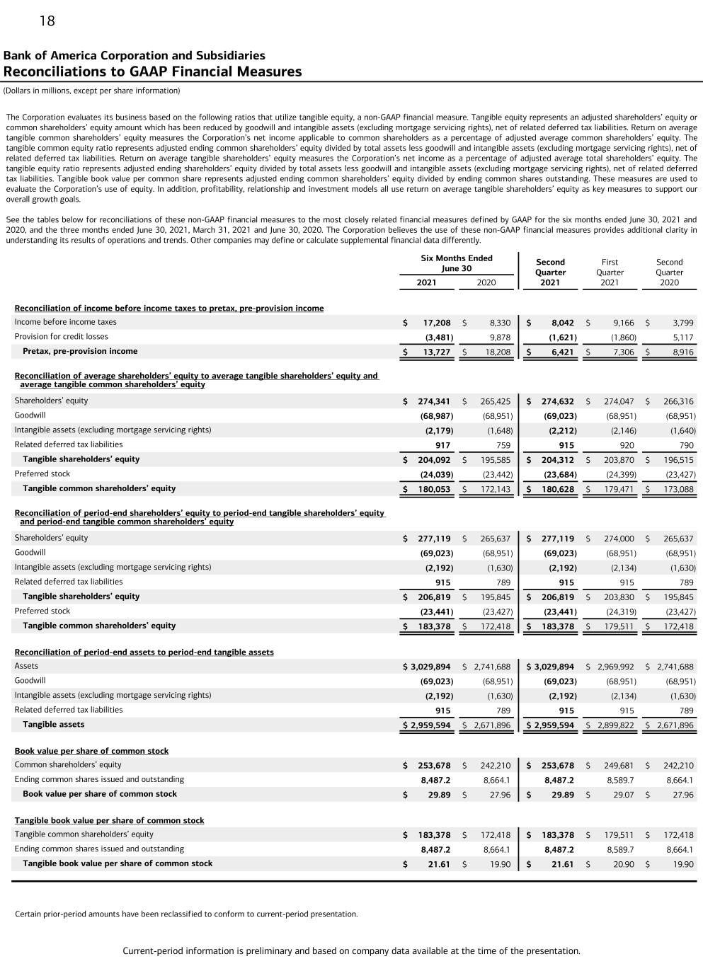Current-period information is preliminary and based on company data available at the time of the presentation. 18 The Corporation evaluates its business based on the following ratios that utilize tangible equity, a non-GAAP financial measure. Tangible equity represents an adjusted shareholders’ equity or common shareholders’ equity amount which has been reduced by goodwill and intangible assets (excluding mortgage servicing rights), net of related deferred tax liabilities. Return on average tangible common shareholders’ equity measures the Corporation’s net income applicable to common shareholders as a percentage of adjusted average common shareholders’ equity. The tangible common equity ratio represents adjusted ending common shareholders’ equity divided by total assets less goodwill and intangible assets (excluding mortgage servicing rights), net of related deferred tax liabilities. Return on average tangible shareholders’ equity measures the Corporation’s net income as a percentage of adjusted average total shareholders’ equity. The tangible equity ratio represents adjusted ending shareholders’ equity divided by total assets less goodwill and intangible assets (excluding mortgage servicing rights), net of related deferred tax liabilities. Tangible book value per common share represents adjusted ending common shareholders’ equity divided by ending common shares outstanding. These measures are used to evaluate the Corporation’s use of equity. In addition, profitability, relationship and investment models all use return on average tangible shareholders’ equity as key measures to support our overall growth goals. See the tables below for reconciliations of these non-GAAP financial measures to the most closely related financial measures defined by GAAP for the six months ended June 30, 2021 and 2020, and the three months ended June 30, 2021, March 31, 2021 and June 30, 2020. The Corporation believes the use of these non-GAAP financial measures provides additional clarity in understanding its results of operations and trends. Other companies may define or calculate supplemental financial data differently. Bank of America Corporation and Subsidiaries Reconciliations to GAAP Financial Measures (Dollars in millions, except per share information) Six Months Ended June 30 Second Quarter 2021 First Quarter 2021 Second Quarter 2020 2021 2020 Reconciliation of income before income taxes to pretax, pre-provision income Income before income taxes $ 17,208 $ 8,330 $ 8,042 $ 9,166 $ 3,799 Provision for credit losses (3,481) 9,878 (1,621) (1,860) 5,117 Pretax, pre-provision income $ 13,727 $ 18,208 $ 6,421 $ 7,306 $ 8,916 Reconciliation of average shareholders’ equity to average tangible shareholders’ equity and average tangible common shareholders’ equity Shareholders’ equity $ 274,341 $ 265,425 $ 274,632 $ 274,047 $ 266,316 Goodwill (68,987) (68,951) (69,023) (68,951) (68,951) Intangible assets (excluding mortgage servicing rights) (2,179) (1,648) (2,212) (2,146) (1,640) Related deferred tax liabilities 917 759 915 920 790 Tangible shareholders’ equity $ 204,092 $ 195,585 $ 204,312 $ 203,870 $ 196,515 Preferred stock (24,039) (23,442) (23,684) (24,399) (23,427) Tangible common shareholders’ equity $ 180,053 $ 172,143 $ 180,628 $ 179,471 $ 173,088 Reconciliation of period-end shareholders’ equity to period-end tangible shareholders’ equity and period-end tangible common shareholders’ equity Shareholders’ equity $ 277,119 $ 265,637 $ 277,119 $ 274,000 $ 265,637 Goodwill (69,023) (68,951) (69,023) (68,951) (68,951) Intangible assets (excluding mortgage servicing rights) (2,192) (1,630) (2,192) (2,134) (1,630) Related deferred tax liabilities 915 789 915 915 789 Tangible shareholders’ equity $ 206,819 $ 195,845 $ 206,819 $ 203,830 $ 195,845 Preferred stock (23,441) (23,427) (23,441) (24,319) (23,427) Tangible common shareholders’ equity $ 183,378 $ 172,418 $ 183,378 $ 179,511 $ 172,418 Reconciliation of period-end assets to period-end tangible assets Assets $ 3,029,894 $ 2,741,688 $ 3,029,894 $ 2,969,992 $ 2,741,688 Goodwill (69,023) (68,951) (69,023) (68,951) (68,951) Intangible assets (excluding mortgage servicing rights) (2,192) (1,630) (2,192) (2,134) (1,630) Related deferred tax liabilities 915 789 915 915 789 Tangible assets $ 2,959,594 $ 2,671,896 $ 2,959,594 $ 2,899,822 $ 2,671,896 Book value per share of common stock Common shareholders’ equity $ 253,678 $ 242,210 $ 253,678 $ 249,681 $ 242,210 Ending common shares issued and outstanding 8,487.2 8,664.1 8,487.2 8,589.7 8,664.1 Book value per share of common stock $ 29.89 $ 27.96 $ 29.89 $ 29.07 $ 27.96 Tangible book value per share of common stock Tangible common shareholders’ equity $ 183,378 $ 172,418 $ 183,378 $ 179,511 $ 172,418 Ending common shares issued and outstanding 8,487.2 8,664.1 8,487.2 8,589.7 8,664.1 Tangible book value per share of common stock $ 21.61 $ 19.90 $ 21.61 $ 20.90 $ 19.90 Certain prior-period amounts have been reclassified to conform to current-period presentation.