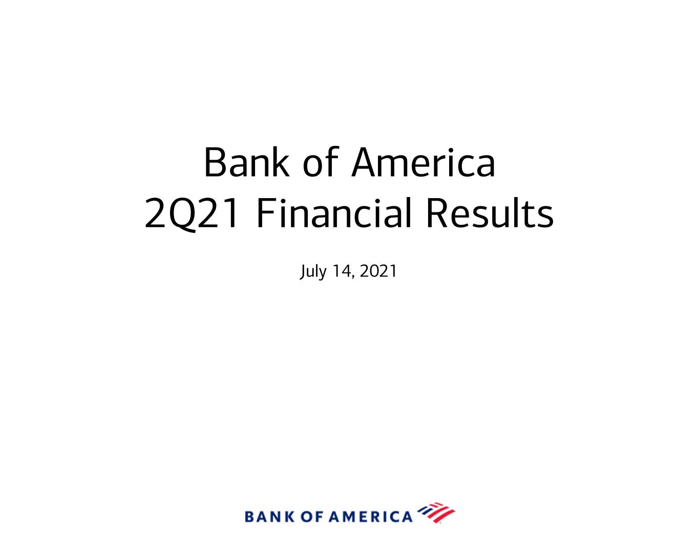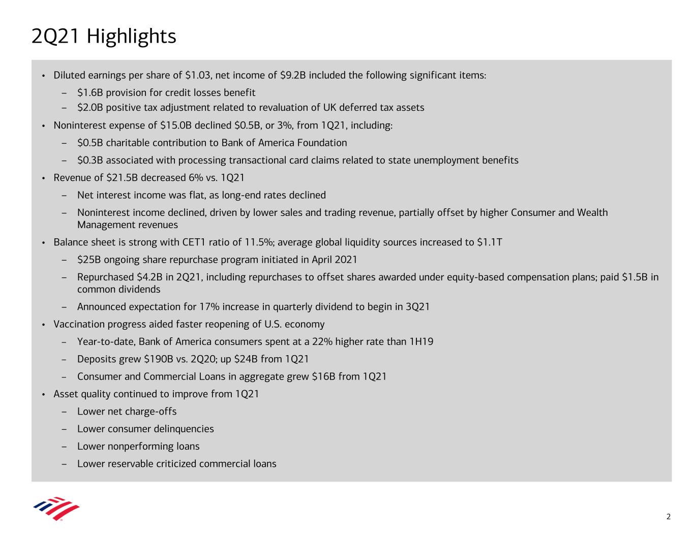 2Q21 Highlights • Diluted earnings per share of $1.03, net income of $9.2B included the following significant items: – $1.6B provision for credit losses benefit – $2.0B positive tax adjustment related to revaluation of UK deferred tax assets • Noninterest expense of $15.0B declined $0.5B, or 3%, from 1Q21, including: – $0.5B charitable contribution to Bank of America Foundation – $0.3B associated with processing transactional card claims related to state unemployment benefits • Revenue of $21.5B decreased 6% vs. 1Q21 – Net interest income was flat, as long-end rates declined – Noninterest income declined, driven by lower sales and trading revenue, partially offset by higher Consumer and Wealth Management revenues • Balance sheet is strong with CET1 ratio of 11.5%; average global liquidity sources increased to $1.1T – $25B ongoing share repurchase program initiated in April 2021 – Repurchased $4.2B in 2Q21, including repurchases to offset shares awarded under equity-based compensation plans; paid $1.5B in common dividends – Announced expectation for 17% increase in quarterly dividend to begin in 3Q21 • Vaccination progress aided faster reopening of U.S. economy – Year-to-date, Bank of America consumers spent at a 22% higher rate than 1H19 – Deposits grew $190B vs. 2Q20; up $24B from 1Q21 – Consumer and Commercial Loans in aggregate grew $16B from 1Q21 • Asset quality continued to improve from 1Q21 – Lower net charge-offs – Lower consumer delinquencies – Lower nonperforming loans – Lower reservable criticized commercial loans 2
