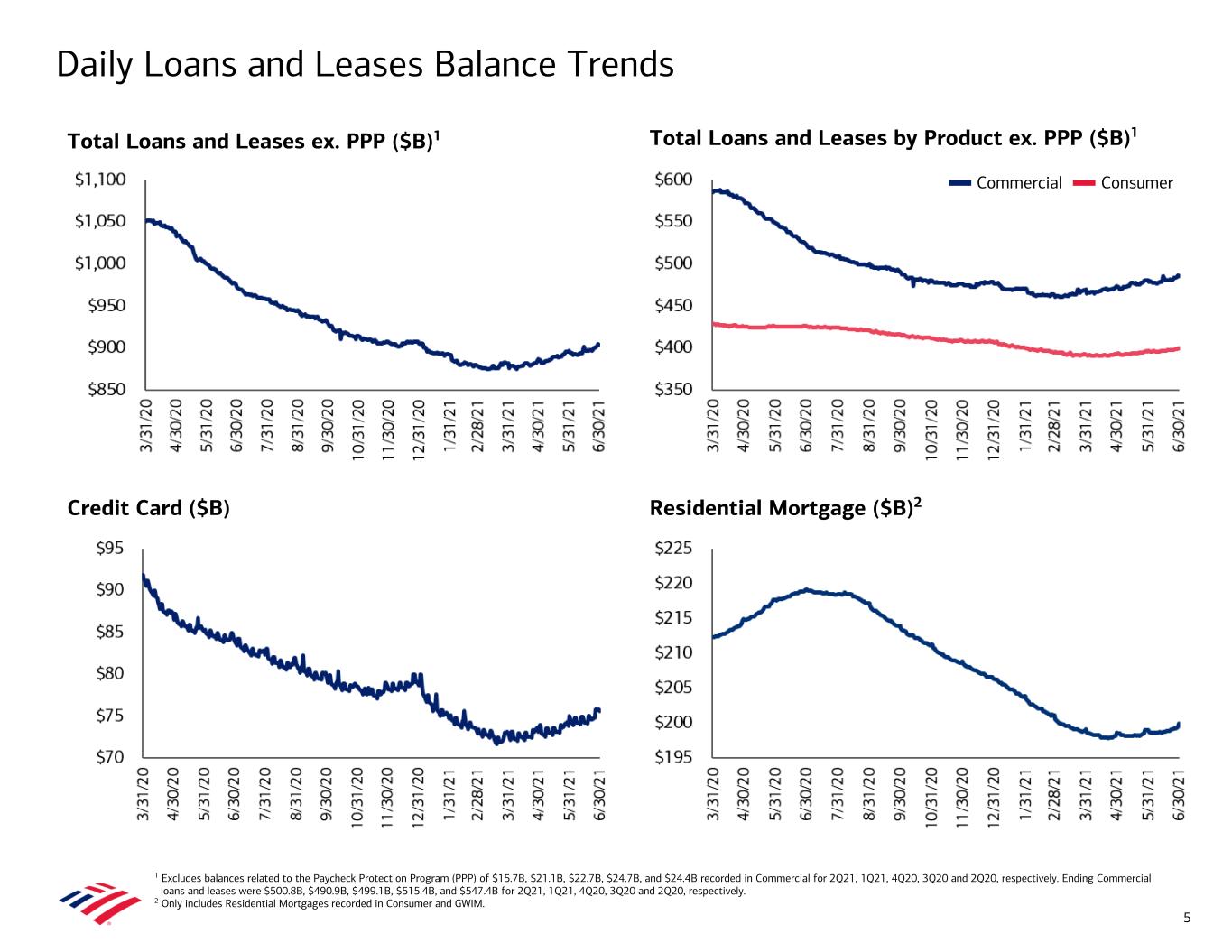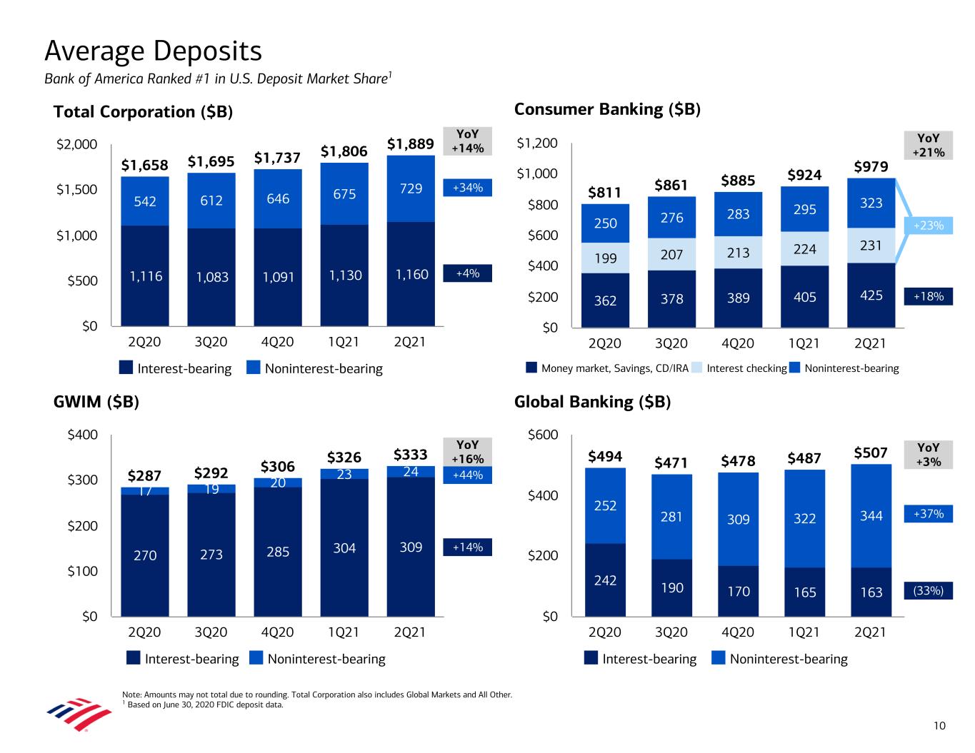 $1,001 $950 $913 $887 $889 322 319 305 291 282 182 186 187 188 194 424 373 346 330 325 74 72 74 77 88 Consumer Banking GWIM Global Banking Global Markets 2Q20 3Q20 4Q20 1Q21 2Q21 $0 $250 $500 $750 $1,000 $1,250 $30 $24 $22 $21 $19 25 20 18 17 15 5 4 4 4 4 Residential mortgage Home equity 2Q20 3Q20 4Q20 1Q21 2Q21 $0 $10 $20 $30 $40 $1,031 $974 $935 $908 $908 2Q20 3Q20 4Q20 1Q21 2Q21 $0 $250 $500 $750 $1,000 $1,250 (12%) +6% (23%) +18% Average Loans and Leases1 YoY (12%) YoY (11%) YoY (36%) Note: Amounts may not total due to rounding. 1 Includes balances related to PPP of $19.8B recorded in Consumer $11.4B, GWIM $0.7B and Global Banking $7.7B for 2Q21, balances of $23.1B recorded in Consumer $13.9B, GWIM $0.7B and Global Banking $8.5B for 1Q21, balances of $24.5B recorded in Consumer $14.5B, GWIM $0.8B and Global Banking $9.2B for 4Q20, balances of $24.7B recorded in Consumer $14.5B, GWIM $0.8B and Global Banking $9.4B for 3Q20, and balances of $16.0B recorded in Consumer $9.2B, GWIM $0.5B and Global Banking $6.2B for 2Q20. Total Loans and Leases in All Other ($B) Loans and Leases in Business Segments ($B) Total Loans and Leases by Portfolio ($B) Total Loans and Leases ($B) $456 $446 $432 $418 $413 $575 $528 $502 $489 $494 Consumer loans Commercial loans 2Q20 3Q20 4Q20 1Q21 2Q21 $0 $250 $500 $750 9 PPP loans $16.0 $24.7 $24.5 $23.1 $19.8