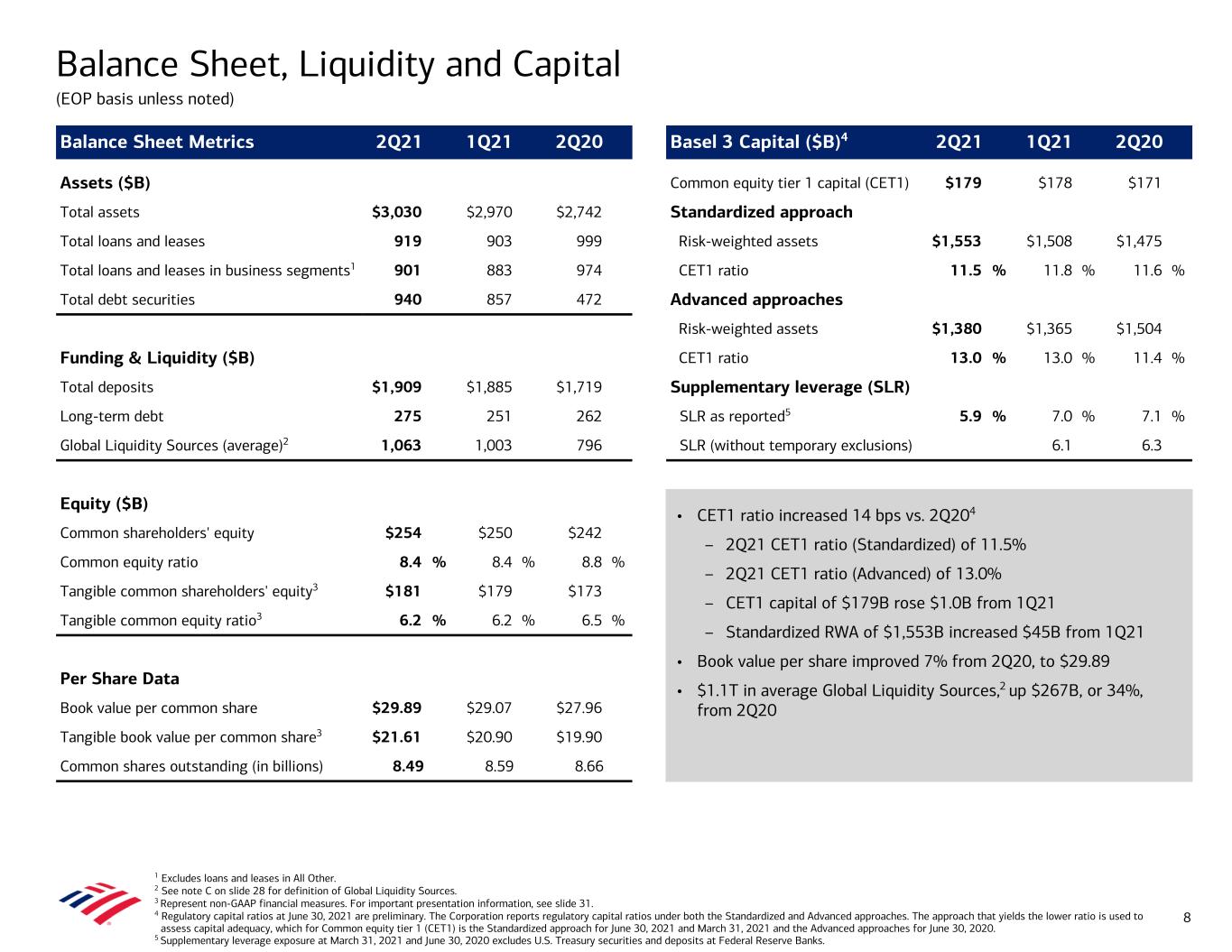 Note: Amounts may not total due to rounding. N/M stands for not meaningful. 1 For more information on reserve build (release), see note A on slide 28. 2 Represent non-GAAP financial measures. For more information on pretax, pre-provision income and a reconciliation to GAAP, see note B on slide 28. For important presentation information about these measures, see slide 31. Summary Income Statement ($B, except per share data) 2Q21 1Q21 Inc / (Dec) 2Q20 Inc / (Dec) Total Revenue, net of interest expense $21.5 $22.8 ($1.4) (6) % $22.3 ($0.9) (4) % Provision (benefit) for credit losses (1.6) (1.9) 0.2 (13) 5.1 (6.7) (132) Net charge-offs 0.6 0.8 (0.2) (28) 1.1 (0.6) (48) Reserve build (release)1 (2.2) (2.7) 0.5 (17) 4.0 (6.2) N/M Noninterest Expense 15.0 15.5 (0.5) (3) 13.4 1.6 12 Pretax Income 8.0 9.2 (1.1) (12) 3.8 4.2 112 Pretax, pre-provision income2 6.4 7.3 (0.9) (12) 8.9 (2.5) (28) Income tax expense (1.2) 1.1 (2.3) N/M 0.3 (1.4) N/M Net income $9.2 $8.1 $1.2 15 $3.5 $5.7 N/M Diluted earnings per share $1.03 $0.86 $0.17 20 $0.37 $0.66 N/M Average diluted common shares (in millions) 8,735 8,756 (20) — 8,768 (33) — Return Metrics and Efficiency Ratio Return on average assets 1.23 % 1.13 % 0.53 % Return on average common shareholders' equity 14.3 12.3 5.4 Return on average tangible common shareholders' equity2 19.9 17.1 7.6 Efficiency ratio 70 68 60 2Q21 Financial Results 7