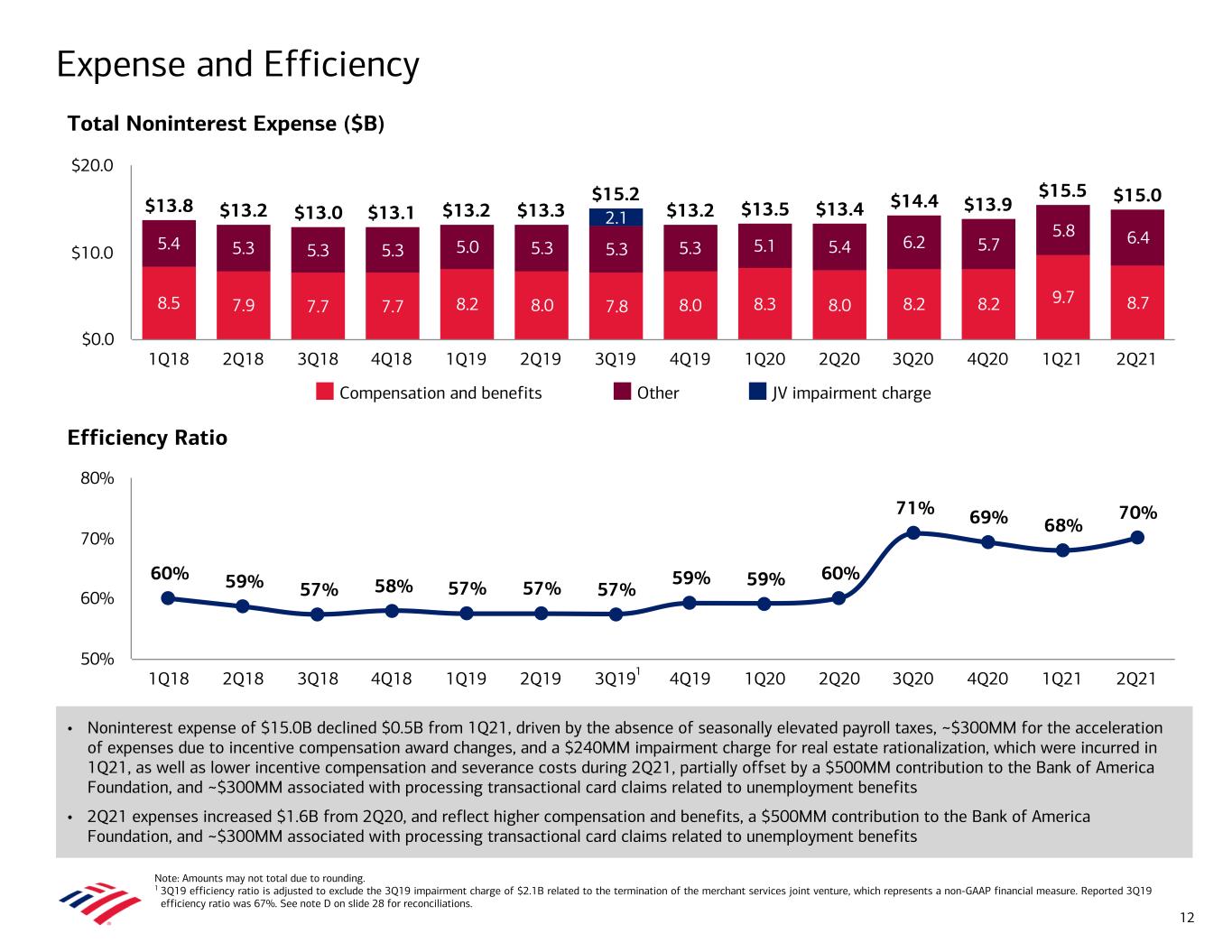 60% 59% 57% 58% 57% 57% 57% 59% 59% 60% 71% 69% 68% 70% 1Q18 2Q18 3Q18 4Q18 1Q19 2Q19 3Q19 4Q19 1Q20 2Q20 3Q20 4Q20 1Q21 2Q21 50% 60% 70% 80% $13.8 $13.2 $13.0 $13.1 $13.2 $13.3 $15.2 $13.2 $13.5 $13.4 $14.4 $13.9 $15.5 $15.0 8.5 7.9 7.7 7.7 8.2 8.0 7.8 8.0 8.3 8.0 8.2 8.2 9.7 8.7 5.4 5.3 5.3 5.3 5.0 5.3 5.3 5.3 5.1 5.4 6.2 5.7 5.8 6.4 2.1 Compensation and benefits Other JV impairment charge 1Q18 2Q18 3Q18 4Q18 1Q19 2Q19 3Q19 4Q19 1Q20 2Q20 3Q20 4Q20 1Q21 2Q21 $0.0 $10.0 $20.0 • Noninterest expense of $15.0B declined $0.5B from 1Q21, driven by the absence of seasonally elevated payroll taxes, ~$300MM for the acceleration of expenses due to incentive compensation award changes, and a $240MM impairment charge for real estate rationalization, which were incurred in 1Q21, as well as lower incentive compensation and severance costs during 2Q21, partially offset by a $500MM contribution to the Bank of America Foundation, and ~$300MM associated with processing transactional card claims related to unemployment benefits • 2Q21 expenses increased $1.6B from 2Q20, and reflect higher compensation and benefits, a $500MM contribution to the Bank of America Foundation, and ~$300MM associated with processing transactional card claims related to unemployment benefits Total Noninterest Expense ($B) Efficiency Ratio Expense and Efficiency 1 Note: Amounts may not total due to rounding. 1 3Q19 efficiency ratio is adjusted to exclude the 3Q19 impairment charge of $2.1B related to the termination of the merchant services joint venture, which represents a non-GAAP financial measure. Reported 3Q19 efficiency ratio was 67%. See note D on slide 28 for reconciliations. 12