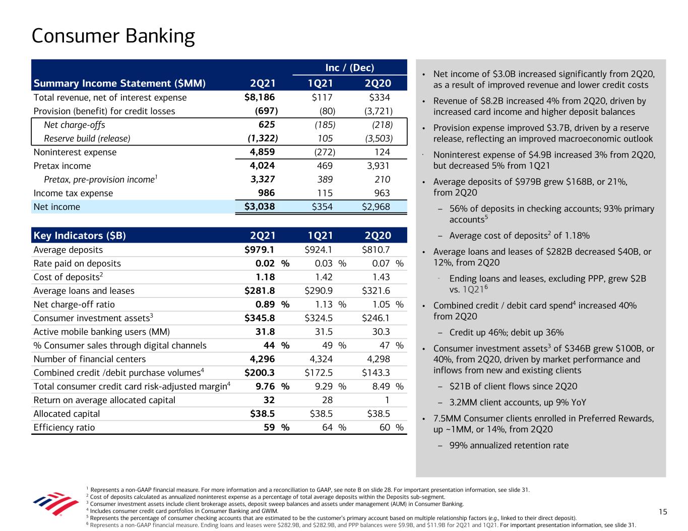 Commercial Net Charge-offs ($MM) Consumer Net Charge-offs ($MM) Asset Quality – Consumer and Commercial Portfolios 1 Excludes loans measured at fair value. 2 Fully-insured loans are FHA-insured loans and other loans individually insured under long-term standby agreements. $412 $408 $399 $130 $82 0.29% 0.31% 0.32% 0.11% 0.07% C&I Small business and other Commercial NCO ratio 2Q20 3Q20 4Q20 1Q21 2Q21 $0 $100 $200 $300 $400 $500 0.00% 0.10% 0.20% 0.30% 0.40% 0.50% $734 $564 $482 $693 $513 0.65% 0.50% 0.44% 0.67% 0.50% Credit card Other Consumer NCO ratio 2Q20 3Q20 4Q20 1Q21 2Q21 $0 $250 $500 $750 $1,000 0.00% 0.50% 1.00% 1.50% Commercial Metrics ($MM) 2Q21 1Q21 2Q20 Provision ($914) ($1,104) $2,503 Reservable criticized utilized exposure 28,878 34,283 25,950 Nonperforming loans and leases 1,863 2,071 2,202 % of loans and leases1 0.38 % 0.43 % 0.41 % Allowance for loans and leases $6,663 $7,533 $8,434 % of loans and leases1 1.35 % 1.55 % 1.57 % Consumer Metrics ($MM) 2Q21 1Q21 2Q20 Provision ($707) ($756) $2,614 Nonperforming loans and leases 3,044 3,091 2,191 % of loans and leases1 0.73 % 0.75 % 0.49 % Consumer 30+ days performing past due $3,233 $3,863 $3,927 Fully-insured2 997 1,030 1,153 Non fully-insured 2,236 2,833 2,774 Consumer 90+ days performing past due 1,235 1,508 1,663 Allowance for loans and leases 7,432 8,635 10,955 % of loans and leases1 1.78 % 2.10 % 2.43 % # times annualized NCOs 3.61 x 3.07 x 3.71 x 14