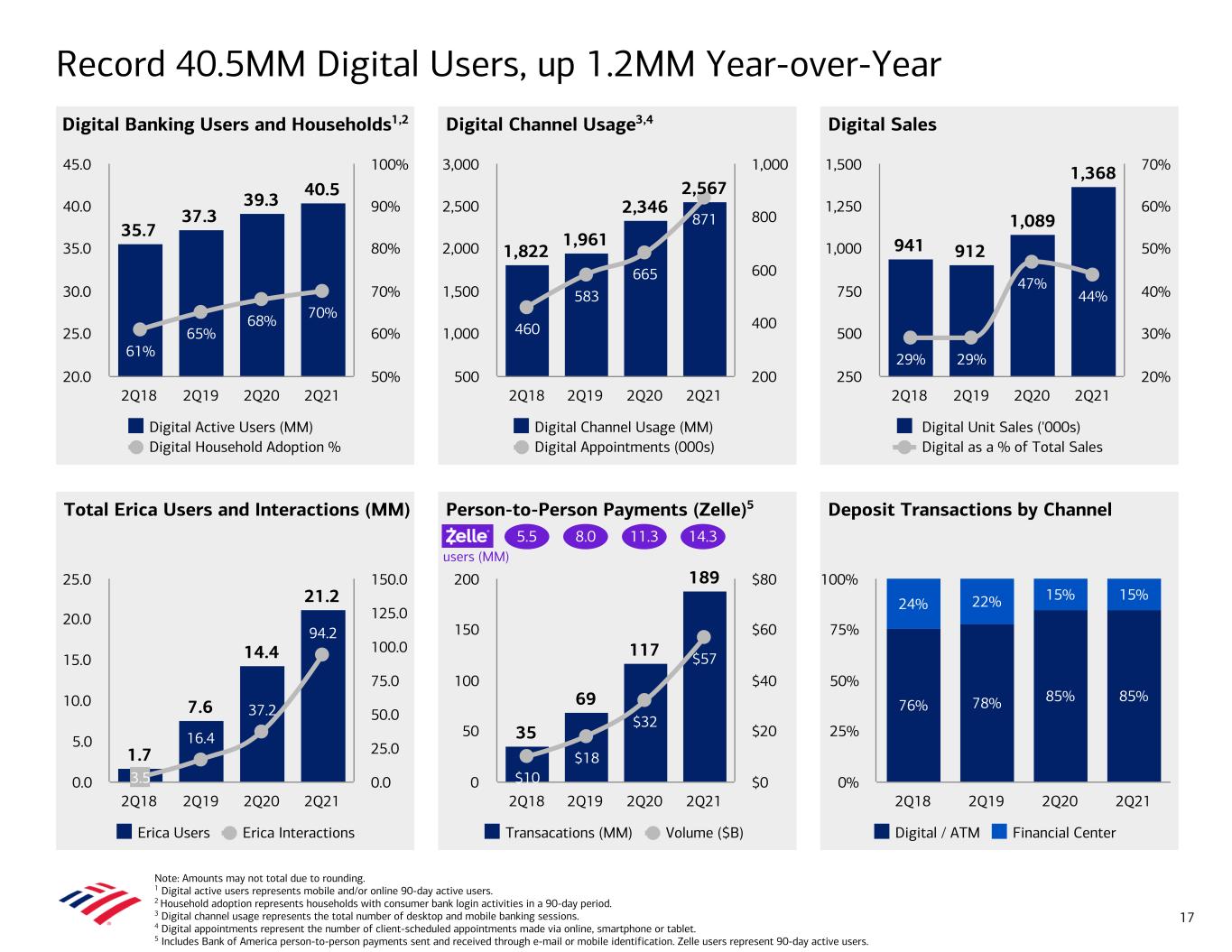 Record 40.5MM Digital Users, up 1.2MM Year-over-Year Note: Amounts may not total due to rounding. 1 Digital active users represents mobile and/or online 90-day active users. 2 Household adoption represents households with consumer bank login activities in a 90-day period. 3 Digital channel usage represents the total number of desktop and mobile banking sessions. 4 Digital appointments represent the number of client-scheduled appointments made via online, smartphone or tablet. 5 Includes Bank of America person-to-person payments sent and received through e-mail or mobile identification. Zelle users represent 90-day active users. Digital SalesDigital Banking Users and Households1,2 Digital Channel Usage3,4 Total Erica Users and Interactions (MM) Deposit Transactions by ChannelPerson-to-Person Payments (Zelle)5 1,822 1,961 2,346 2,567 460 583 665 871 Digital Channel Usage (MM) Digital Appointments (000s) 2Q18 2Q19 2Q20 2Q21 500 1,000 1,500 2,000 2,500 3,000 200 400 600 800 1,000 941 912 1,089 1,368 29% 29% 47% 44% Digital Unit Sales ('000s) Digital as a % of Total Sales 2Q18 2Q19 2Q20 2Q21 250 500 750 1,000 1,250 1,500 20% 30% 40% 50% 60% 70% 1.7 7.6 14.4 21.2 3.5 16.4 37.2 94.2 Erica Users Erica Interactions 2Q18 2Q19 2Q20 2Q21 0.0 5.0 10.0 15.0 20.0 25.0 0.0 25.0 50.0 75.0 100.0 125.0 150.0 35 69 117 189 $10 $18 $32 $57 Transacations (MM) Volume ($B) 2Q18 2Q19 2Q20 2Q21 0 50 100 150 200 $0 $20 $40 $60 $80 76% 78% 85% 85% 24% 22% 15% 15% Digital / ATM Financial Center 2Q18 2Q19 2Q20 2Q21 0% 25% 50% 75% 100% 35.7 37.3 39.3 40.5 61% 65% 68% 70% Digital Active Users (MM) Digital Household Adoption % 2Q18 2Q19 2Q20 2Q21 20.0 25.0 30.0 35.0 40.0 45.0 50% 60% 70% 80% 90% 100% 5.5 8.0 11.3 14.3 users (MM) 17
